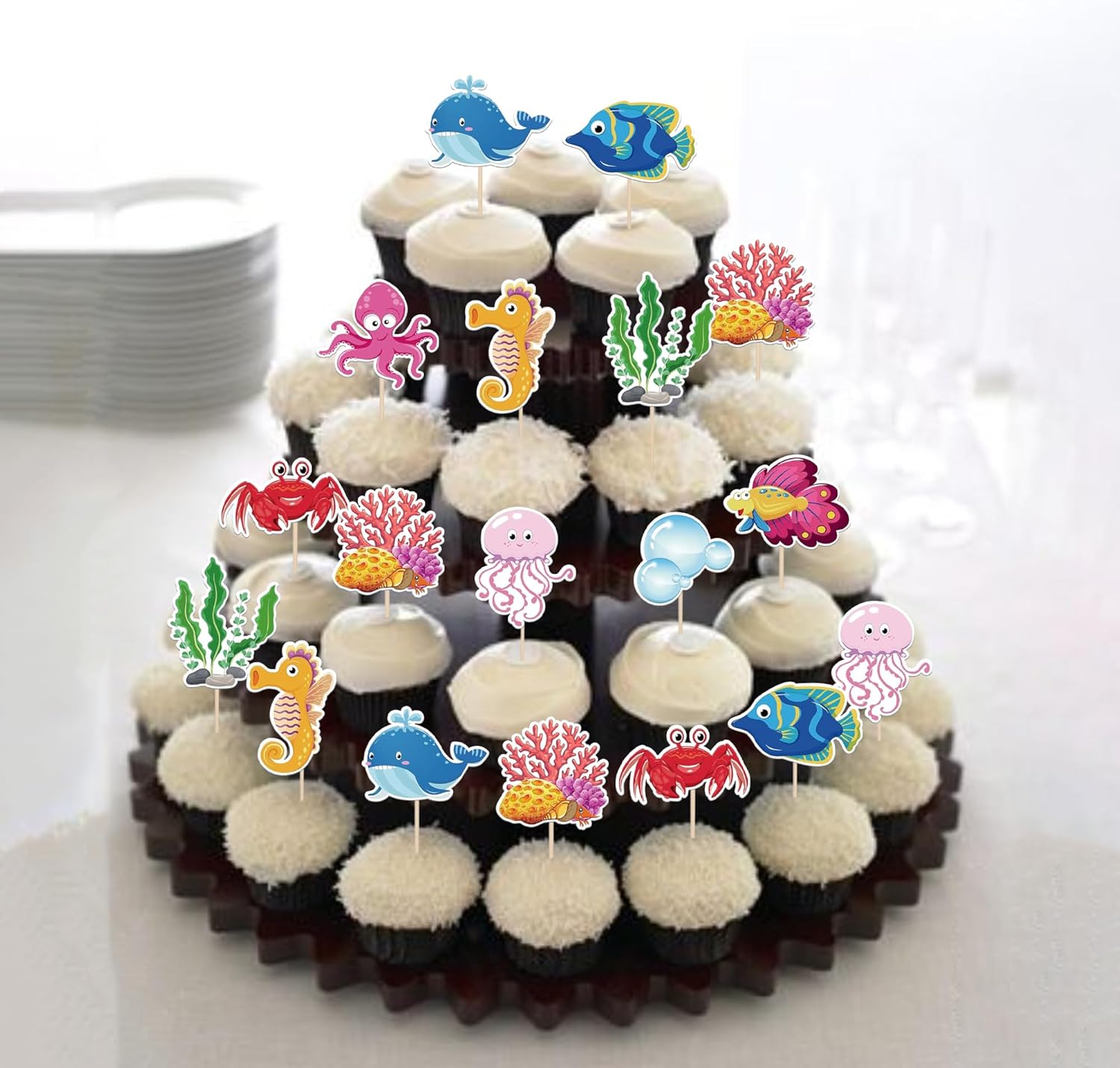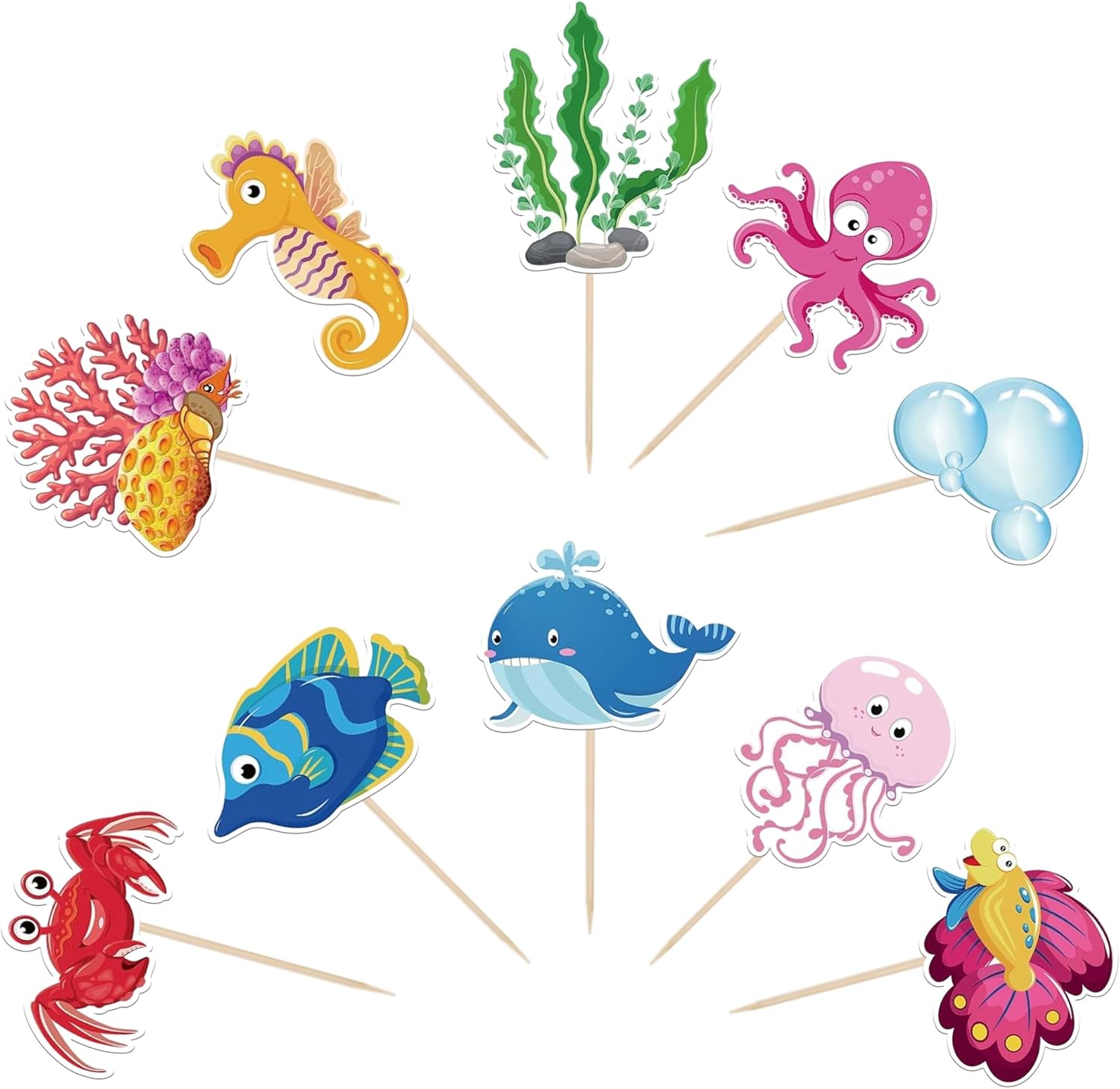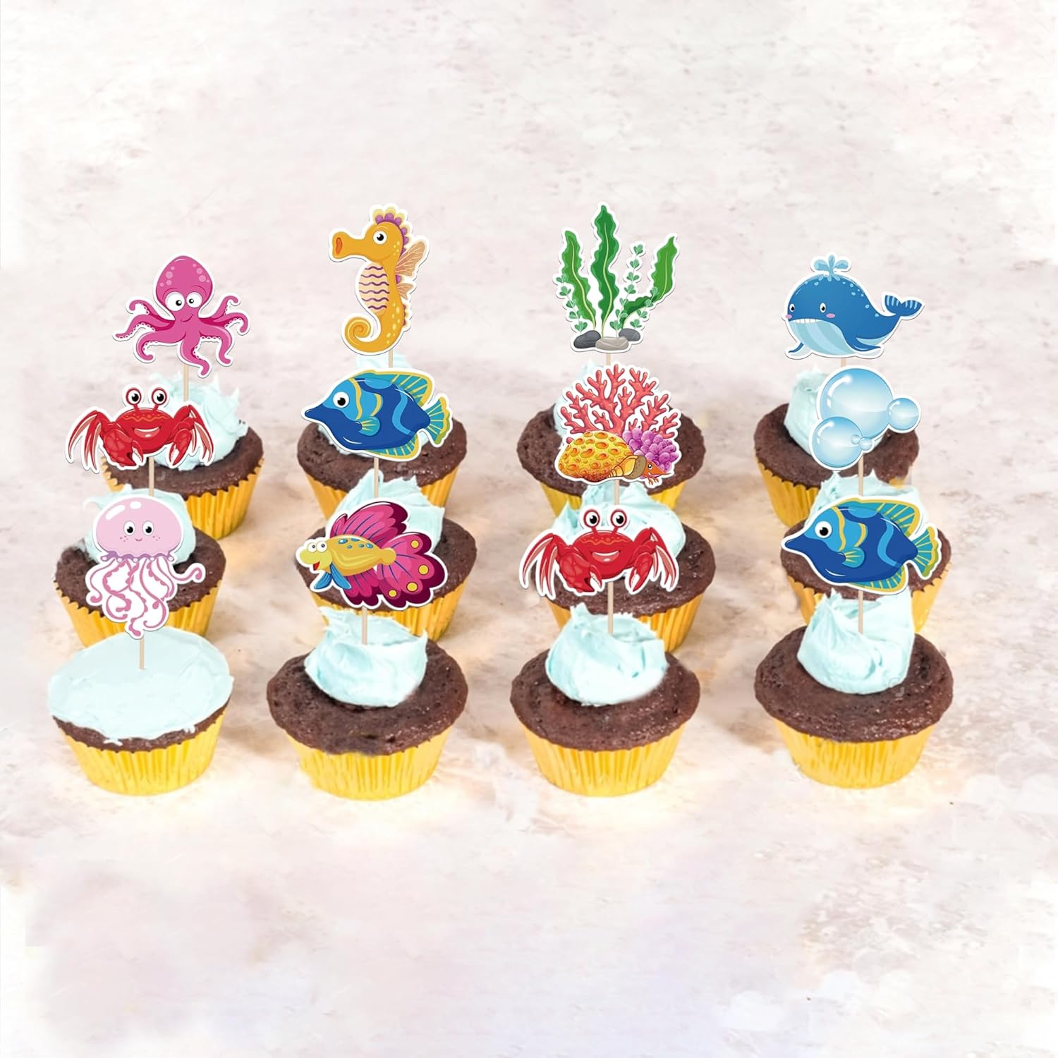 Confezione e dimensioni: include una confezione da 40 toppers per cupcake sotto il mare. Questi nuovi e graziosi plettri per cupcake aggiungono più divertimento. La dimensione è (compreso il bastone). Ampie applicazioni: questi toppers per cupcake sono così carini e perfetti per feste a tema sotto il mare, feste a tema creature marine, feste a tema mondo sottomarino, feste a tema compleanno per bambini e decorazioni per cupcake. Sono una buona decorazione e rendono il tuo cupcake più attraente e interessante. Puoi anche usarli per gelati, frutta, biscotti e altri dessert. Materiale premium: questi toppers per cupcake sono realizzati in cartoncino glitterato di alta qualità da 300 grammi. Sono molto sicuri per cupcake, biscotti, torte, frutta, biscotti, gelati e altri dessert. NON fai da te: questi toppers per cupcake sono preassemblati, quindi puoi inserirli nel tuo cupcake immediatamente dopo averli ricevuti, il che può farti risparmiare tempo. Memoria! Questi toppers per cupcake sono stampati su entrambi i lati e presentano motivi su ciascun lato. È solo a scopo decorativo, non è commestibile e NON utilizzare nel forno o nel microonde.