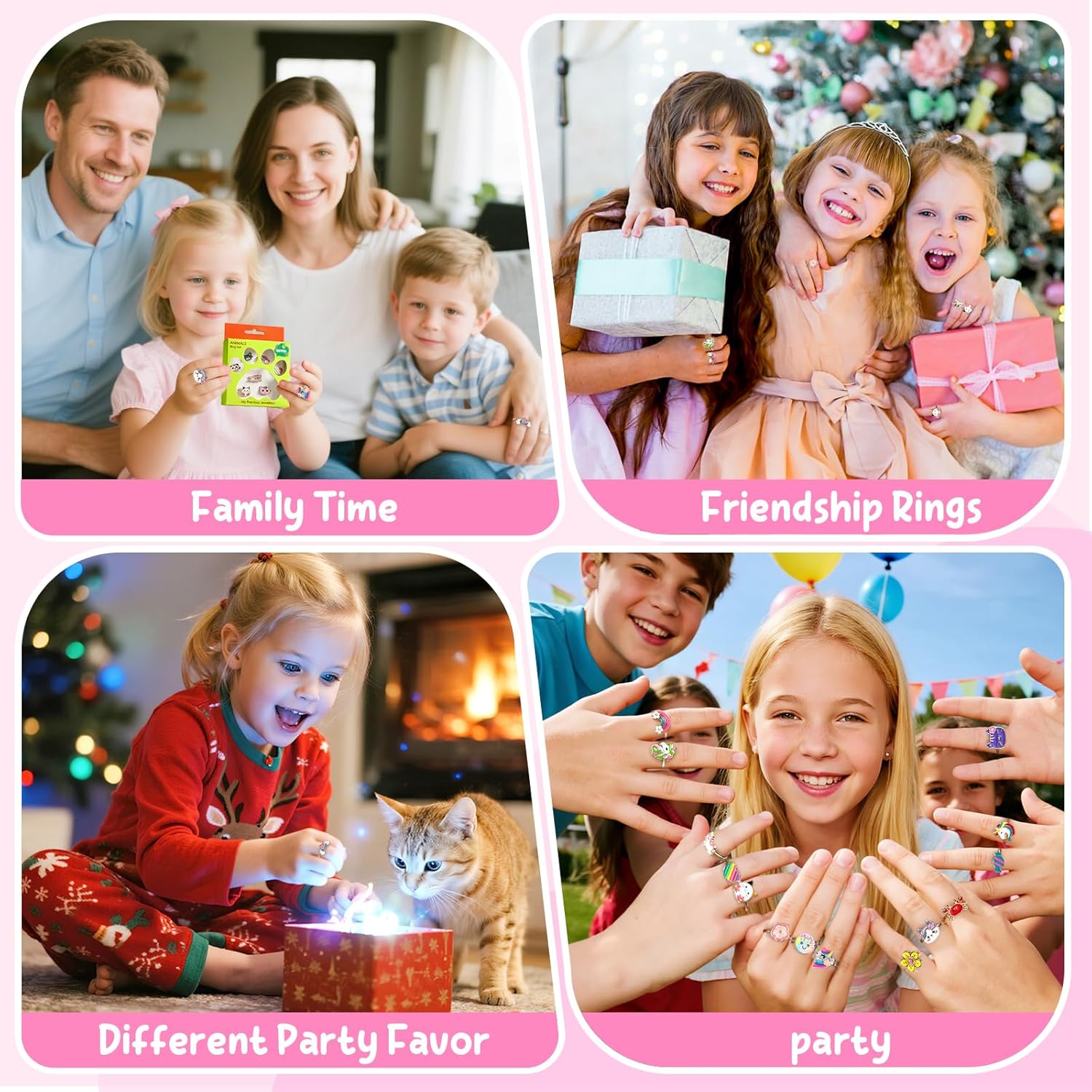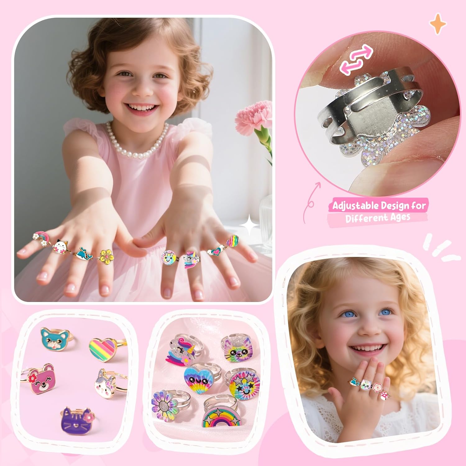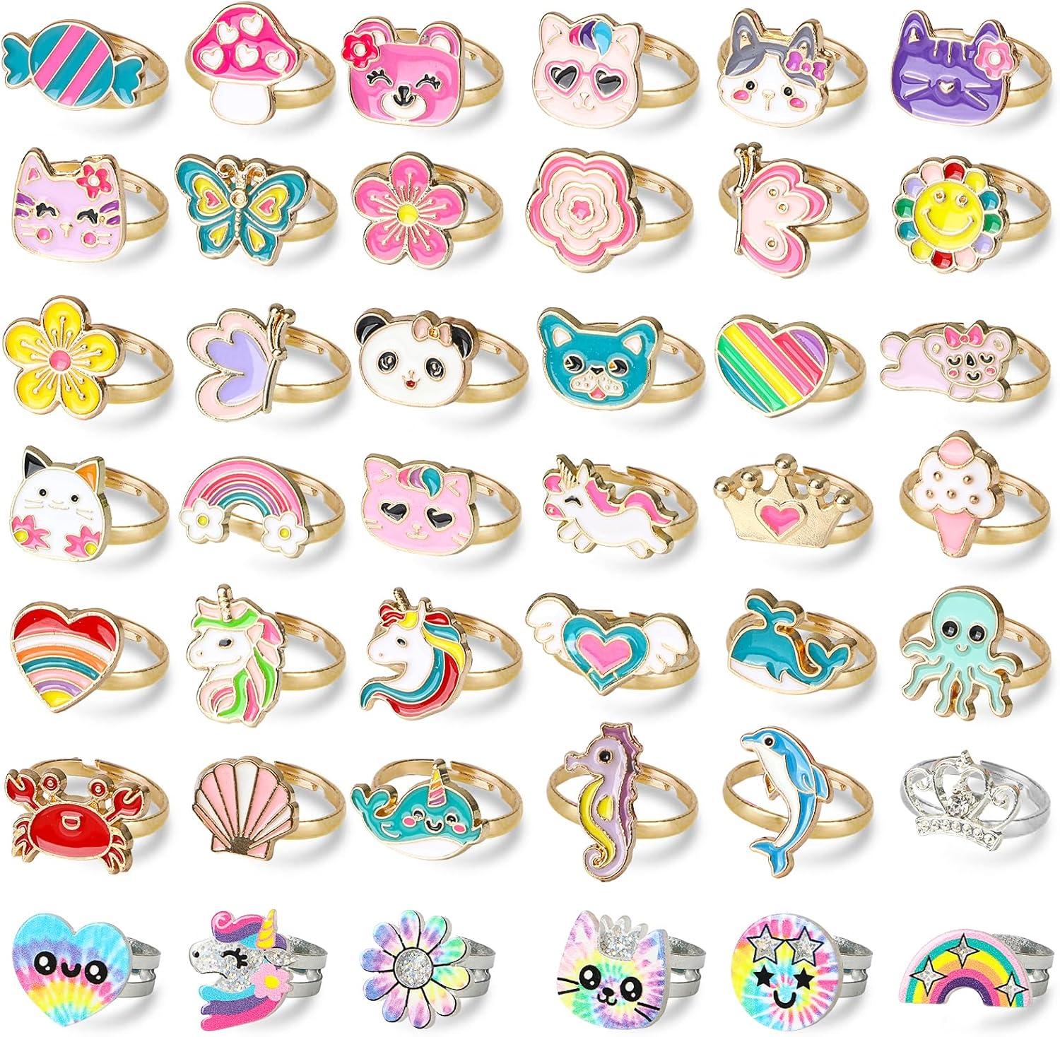 Set di anelli per ragazze da 42 pezzi: La tua bambina riceverà 42 anelli in diversi design, come unicorno, fiore, cuore, farfalla, gatto, girasole, fungo, corona, arcobaleno, delfino, granchio, conchiglia, ecc. Gli anelli sono confezionati singolarmente in 6 scatole color caramello con diversi design e sono ideali come giocattoli e accessori per travestimenti per ragazze dai 3 ai 7 anni. Materiale sicuro e dimensioni regolabili: questi graziosi anelli sono realizzati in lega di alta qualità, senza nichel, non tossici e sicuri. Il diametro interno di ciascun anello è di circa 14 mm ed è regolabile per adattarsi alla maggior parte delle bambine. Ideale per accessori per costumi da principessa, set di gioielli per giochi di ruolo e gioielli per bambini. Design alla moda: i nostri 42 anelli da ragazza affascineranno sicuramente tua figlia. Una varietà di colori e stili permette alla tua piccola principessa di abbinare ogni giorno un abito da principessa diverso, creando un look unico. Può anche condividere questi bellissimi anelli con i suoi amici e divertirsi con loro nella vita di tutti i giorni o alle feste. Lascia che la tua bambina brilli e si distingua in ogni occasione con questi anelli colorati e adorabili. Regalo per bambine: questo set di anelli presenta colori vivaci e design carini, che lo rendono un regalo meraviglioso per tua figlia, nipote o nipote. Questi anelli per ragazze sono adatti non solo come regali di Natale, regali di compleanno, regali di festa, ma anche come regali per le feste di compleanno dei bambini, bomboniere, omaggi, riempimenti per piñata, riempimenti per calendari dell'Avvento di Natale, riempimenti per cestini di Pasqua, accessori per costumi di Halloween, accessori per costumi di carnevale e così via. Servizio clienti: tutti i materiali vengono selezionati manualmente e i danni da estrusione sono inevitabili durante il trasporto. Se qualche parte manca o è danneggiata, non esitate a contattarci. Risponderemo entro 24 ore e offriremo una soluzione soddisfacente. Grazie per il vostro supporto e fiducia!