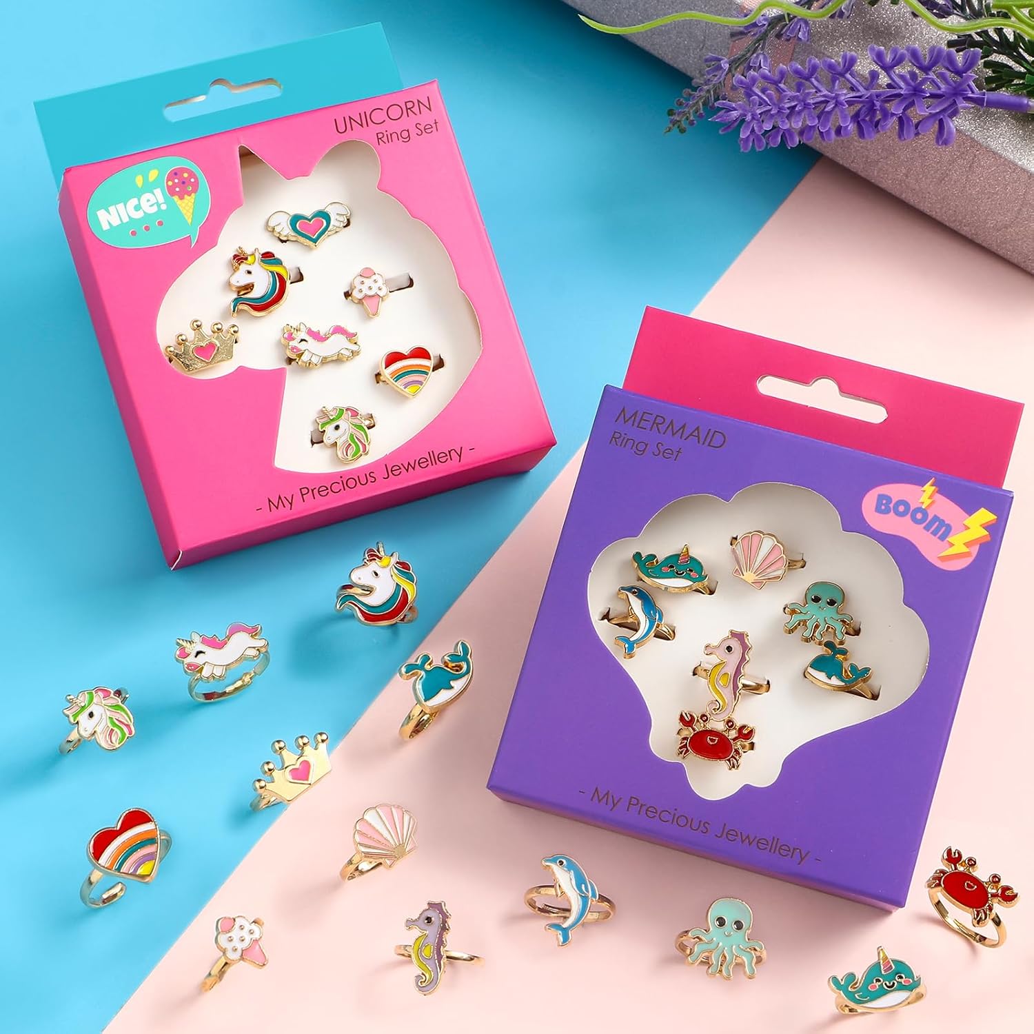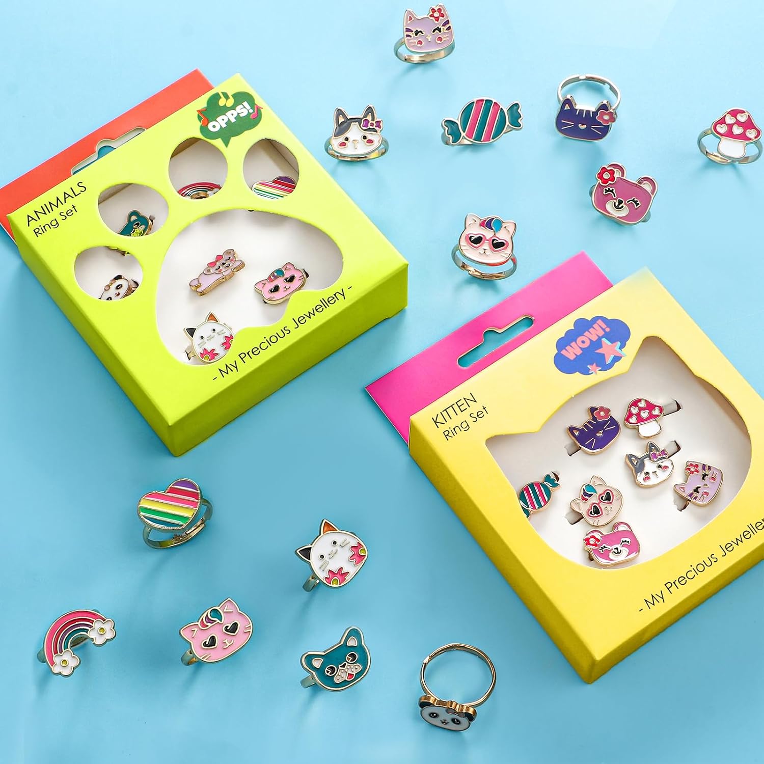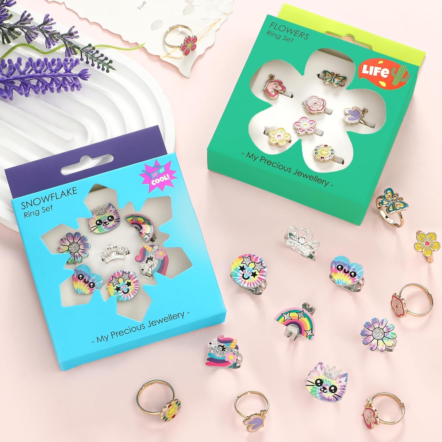 Set di anelli per ragazze da 42 pezzi: La tua bambina riceverà 42 anelli in diversi design, come unicorno, fiore, cuore, farfalla, gatto, girasole, fungo, corona, arcobaleno, delfino, granchio, conchiglia, ecc. Gli anelli sono confezionati singolarmente in 6 scatole color caramello con diversi design e sono ideali come giocattoli e accessori per travestimenti per ragazze dai 3 ai 7 anni. Materiale sicuro e dimensioni regolabili: questi graziosi anelli sono realizzati in lega di alta qualità, senza nichel, non tossici e sicuri. Il diametro interno di ciascun anello è di circa 14 mm ed è regolabile per adattarsi alla maggior parte delle bambine. Ideale per accessori per costumi da principessa, set di gioielli per giochi di ruolo e gioielli per bambini. Design alla moda: i nostri 42 anelli da ragazza affascineranno sicuramente tua figlia. Una varietà di colori e stili permette alla tua piccola principessa di abbinare ogni giorno un abito da principessa diverso, creando un look unico. Può anche condividere questi bellissimi anelli con i suoi amici e divertirsi con loro nella vita di tutti i giorni o alle feste. Lascia che la tua bambina brilli e si distingua in ogni occasione con questi anelli colorati e adorabili. Regalo per bambine: questo set di anelli presenta colori vivaci e design carini, che lo rendono un regalo meraviglioso per tua figlia, nipote o nipote. Questi anelli per ragazze sono adatti non solo come regali di Natale, regali di compleanno, regali di festa, ma anche come regali per le feste di compleanno dei bambini, bomboniere, omaggi, riempimenti per piñata, riempimenti per calendari dell'Avvento di Natale, riempimenti per cestini di Pasqua, accessori per costumi di Halloween, accessori per costumi di carnevale e così via. Servizio clienti: tutti i materiali vengono selezionati manualmente e i danni da estrusione sono inevitabili durante il trasporto. Se qualche parte manca o è danneggiata, non esitate a contattarci. Risponderemo entro 24 ore e offriremo una soluzione soddisfacente. Grazie per il vostro supporto e fiducia!