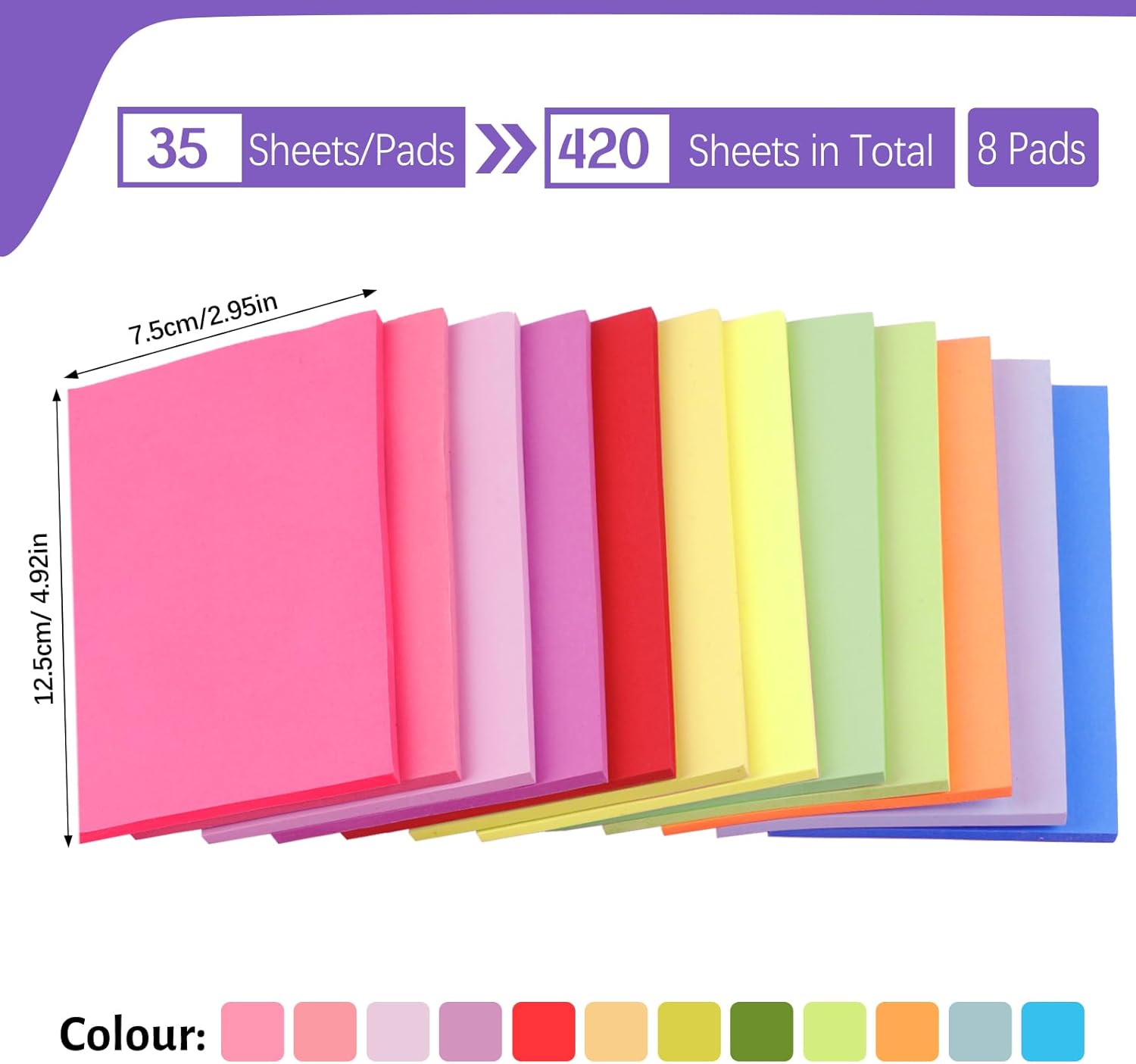 Super adesivo: i nostri foglietti adesivi presentano un'adesione particolarmente forte che aderisce in modo permanente a superfici lisce come schermi di computer, porte e pareti. Anche quando viene rimosso non rimane alcun residuo. 12 colori: i nostri foglietti adesivi grandi sono disponibili in 12 colori vivaci: rosso, giallo, giallo chiaro, blu, viola, ecc. Perfetti per contrassegnare pagine o evidenziare dettagli importanti, questi foglietti adesivi colorati non solo illuminano la tua giornata, ma aiutano anche a strutturare le attività e i compiti quotidiani. Portatili e riutilizzabili: questi foglietti adesivi misurano 3 x 5 pollici, perfetti per la tua tasca, non solo facili da trasportare, ma anche riutilizzabili e riposizionabili. Ampia applicazione: essendo articoli di cancelleria essenziali, i nostri foglietti adesivi sono perfetti per la scuola, l'ufficio e la casa. Sono perfetti per promemoria rapidi, elenchi di cose da fare, segnalibri o riepiloghi e sono un ottimo regalo per insegnanti e studenti. Contenuto della confezione: riceverai 12 blocchi di note adesive, 35 fogli per blocco, 420 fogli in totale. La quantità è sufficiente per l'uso quotidiano e la sostituzione. Questi foglietti adesivi sono realizzati in carta robusta su cui è facile scrivere con qualsiasi penna.