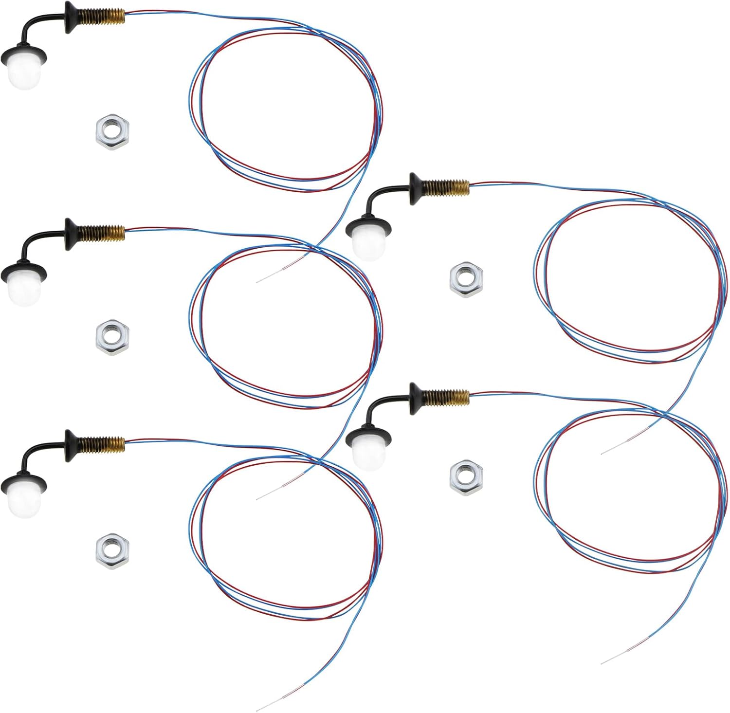 Confezione da 5 luci da cortile ferroviarie - Set di 5 luci a LED da cortile progettate per modellismo ferroviario o accessori per layout stradale. - Realizzato con materiali di alta qualità, sicurezza, rispetto dell'ambiente e durata. - Adatto per scala OO (1: modellini di trenini. - Ogni lampione ha un'altezza di circa 12 cm. - Richiede un alimentatore da 3 V e può essere illuminato per emettere un colore bianco luminoso.