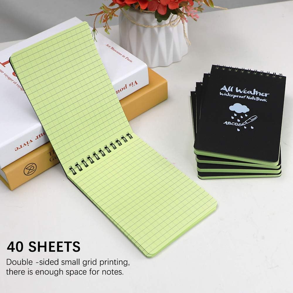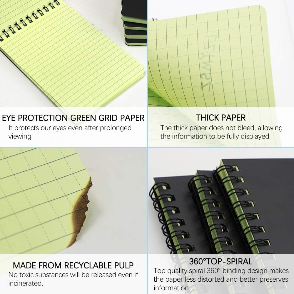 【Qualità Premium】 Realizzato con pasta di carta riciclabile. La carta è resistente e assorbe bene la maggior parte degli inchiostri. Nessuna sostanza tossica verrà rilasciata, anche se incenerita. 【Impermeabile a 360°, addio alla perdita di dati】La carta spessa può visualizzare le informazioni completamente senza rompere la carta, anche se è immersa nell'acqua. Respinge acqua, sudore, grasso e fango anche un piccolo incidente che è stato messo in lavatrice per la pulizia. 【Carta a griglia verde per la protezione degli occhi】 La carta prodotta con pasta riciclata non può rilasciare altre sostanze tossiche anche se incenerita, il che è estremamente rispettosa dell'ambiente. Il verde protegge i nostri occhi anche dopo un lungo sguardo. 【Rilegatore Wire-O in carta per appunti a spirale di qualità superiore】 La rilegatura Wire-O robusta e resistente agli urti rende impossibile la deformazione. Il filo rivestito in plastica dice addio alla ruggine anche se immerso nell'acqua. 【Adatto a persone diverse】 Progettato per persone diverse, il notebook può essere modificato per soddisfare le loro esigenze. Ideale per gli appassionati di attività all'aria aperta, appassionati di cucina, studenti, giornalisti e per l'uso in condizioni meteorologiche avverse come pioggia, neve, sudore, lacrime e fango.