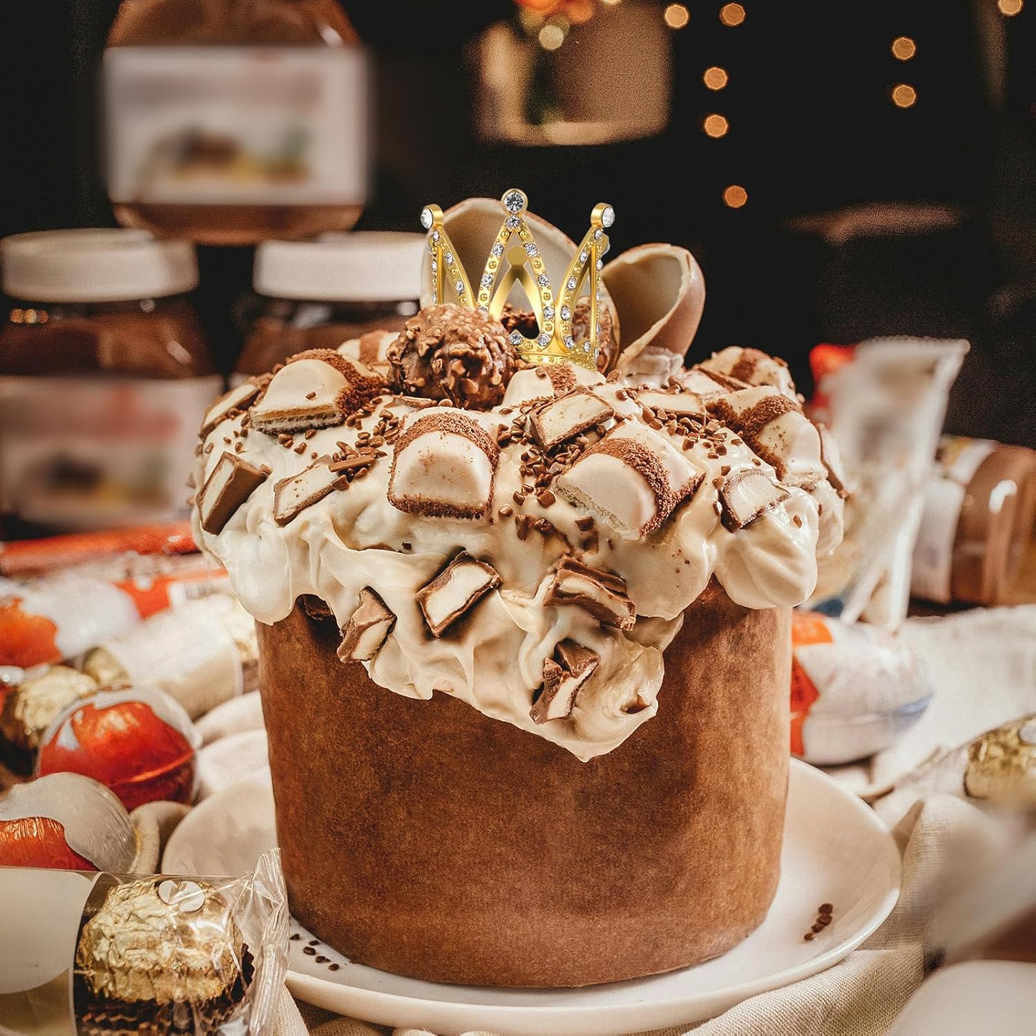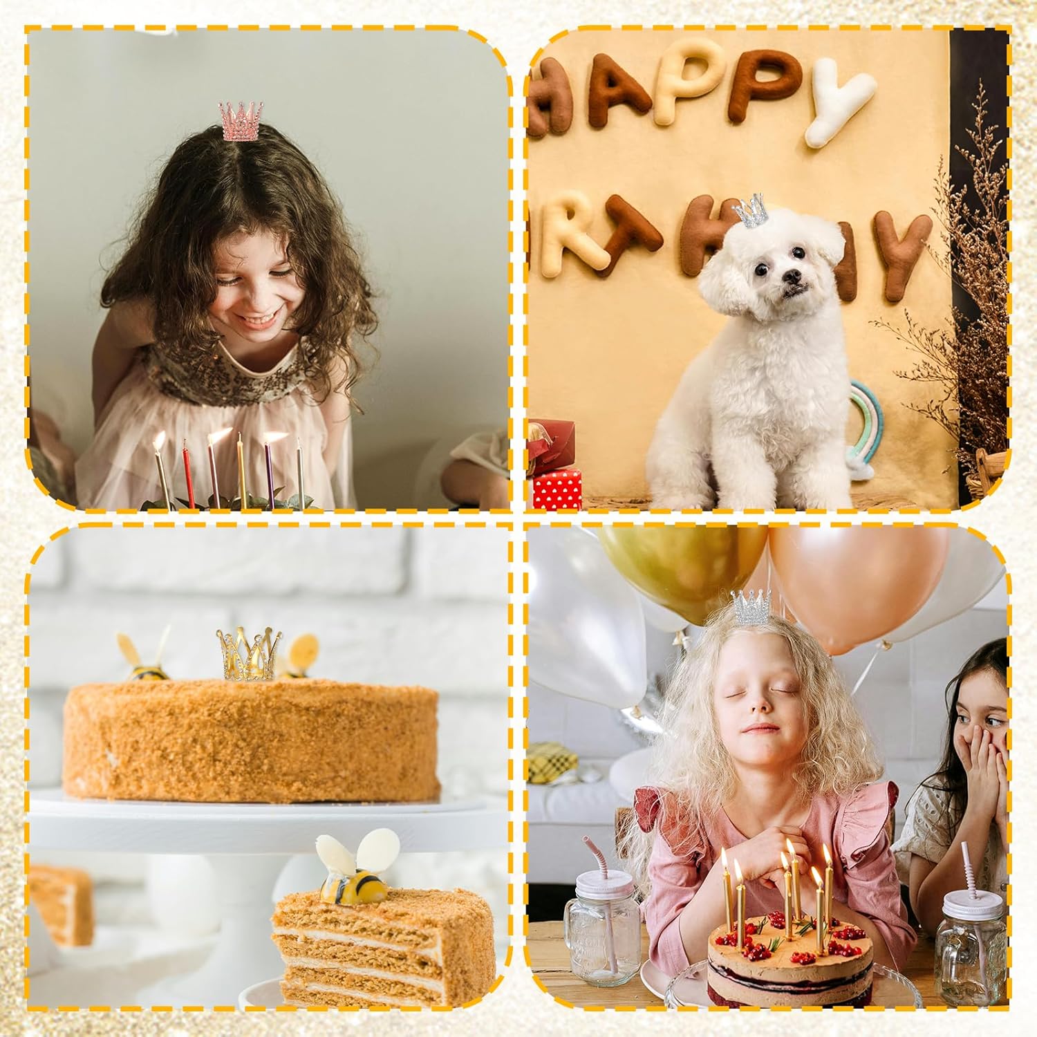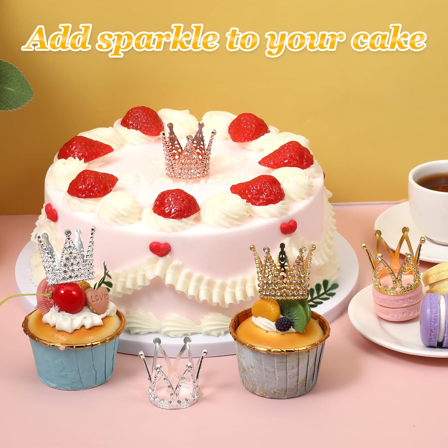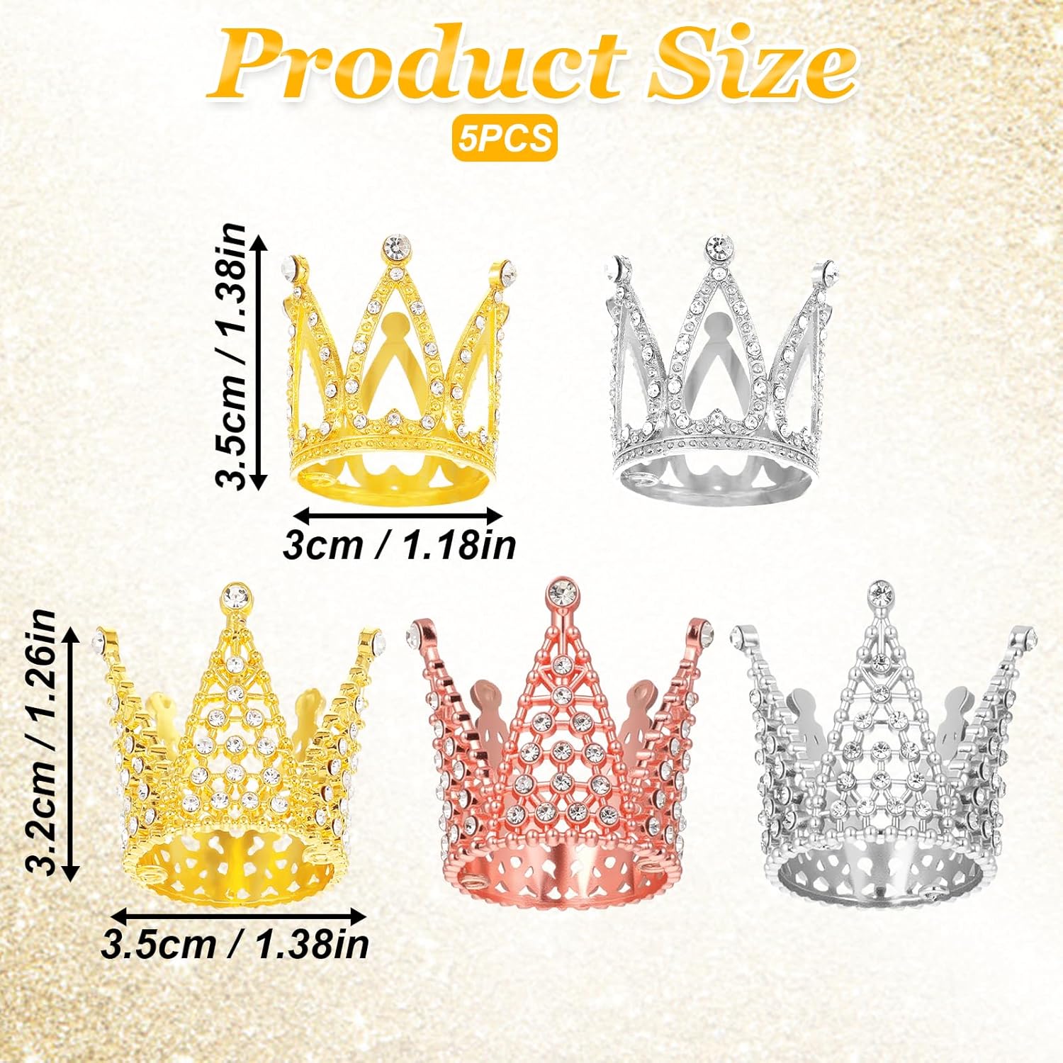 Quantità sufficiente: un totale di 5 decorazioni per ghirlande. Le decorazioni della ghirlanda sono disponibili in 3 colori e 2 stili: oro, argento e oro rosa. Combina le decorazioni della corona d'oro secondo i tuoi desideri e bisogni e crea così una decorazione da tavolo unica per la tua tavola da dessert. Le decorazioni della corona in argento soddisfano i tuoi vari desideri di decorazione. Materiali di alta qualità: i toppers mini corona sono realizzati in lega di zinco, toppers per torta con corona in argento con strass scintillanti che donano una squisita sensazione di lusso. Le mini ghirlande per decorare torte sono di alta qualità, piccole e leggere, non sbiadiscono, resistenti e riutilizzabili. Design raffinato: la corona da principessa è decorata con strass la cui brillante lucentezza metallica si abbina perfettamente ai diamanti scintillanti. Le decorazioni per la corona della torta principessa non solo rendono le tue torte e i tuoi cupcake attraenti, ma aggiungono anche più divertimento ai tuoi eventi. Usi multipli: le mini corone dorate sono adatte per matrimoni, addio al nubilato, feste di compleanno, feste di genere, cerimonie per adulti, feste a tema reale, battesimi, balli studenteschi, feste in costume, giochi di ruolo di principi e principesse e come oggetti di scena fotografici. Topper per torta in oro e argento adatto per realizzare gioielli, bracciali e collane. Accessorio perfetto: le mini corone dorate possono essere utilizzate non solo come decorazioni per torte, ma anche come bellissimi accessori per capelli da principessa per neonati, bambole, piccoli animali e ragazze. Le corone da principessa vintage sono adatte come oggetti di scena per foto, decorazioni per bouquet, decorazioni per la tavola, decorazioni per la casa o qualsiasi occasione in cui desideri mostrare il tuo fascino.