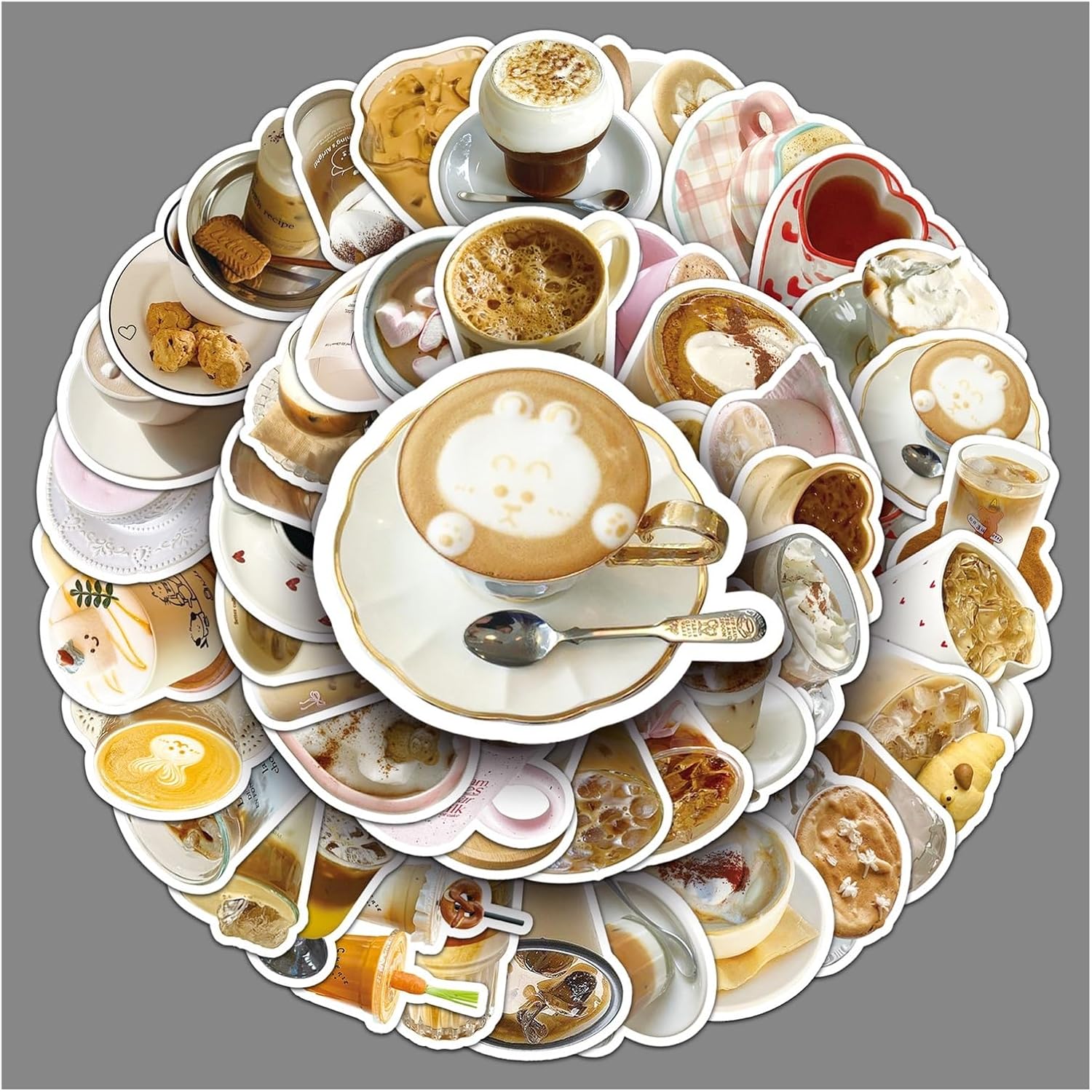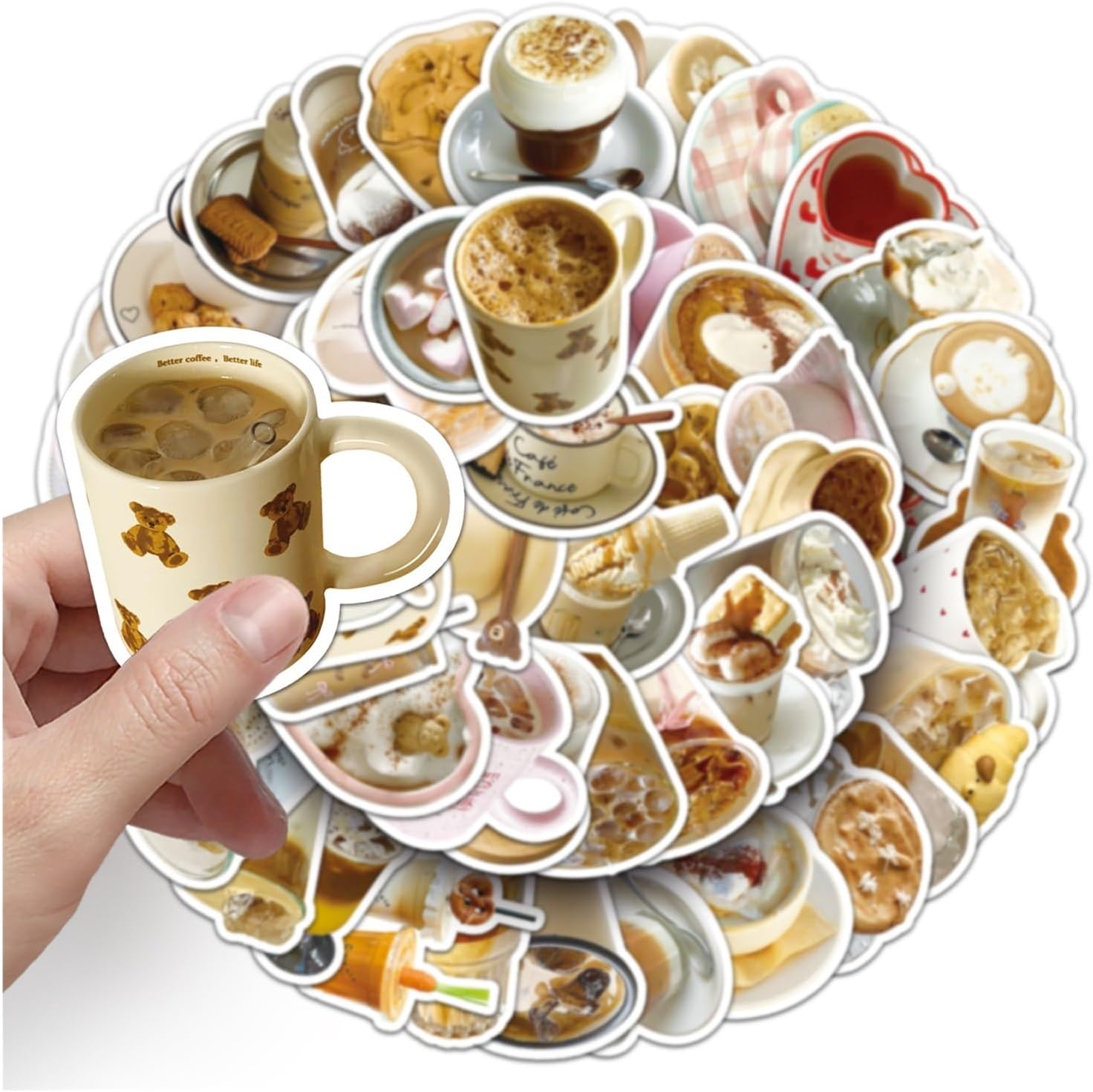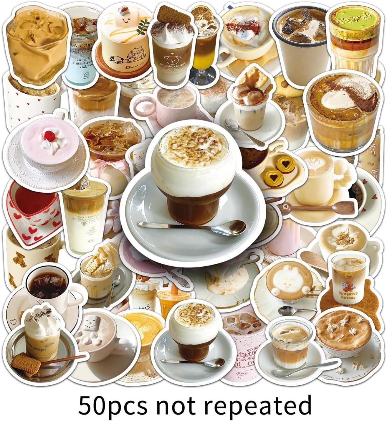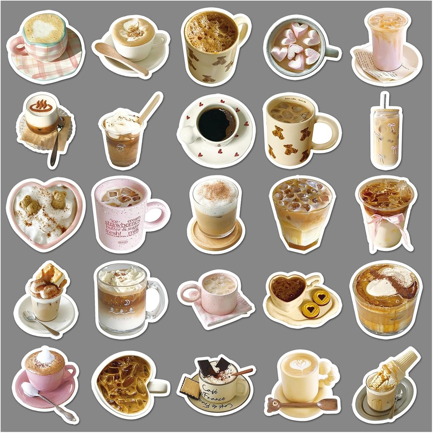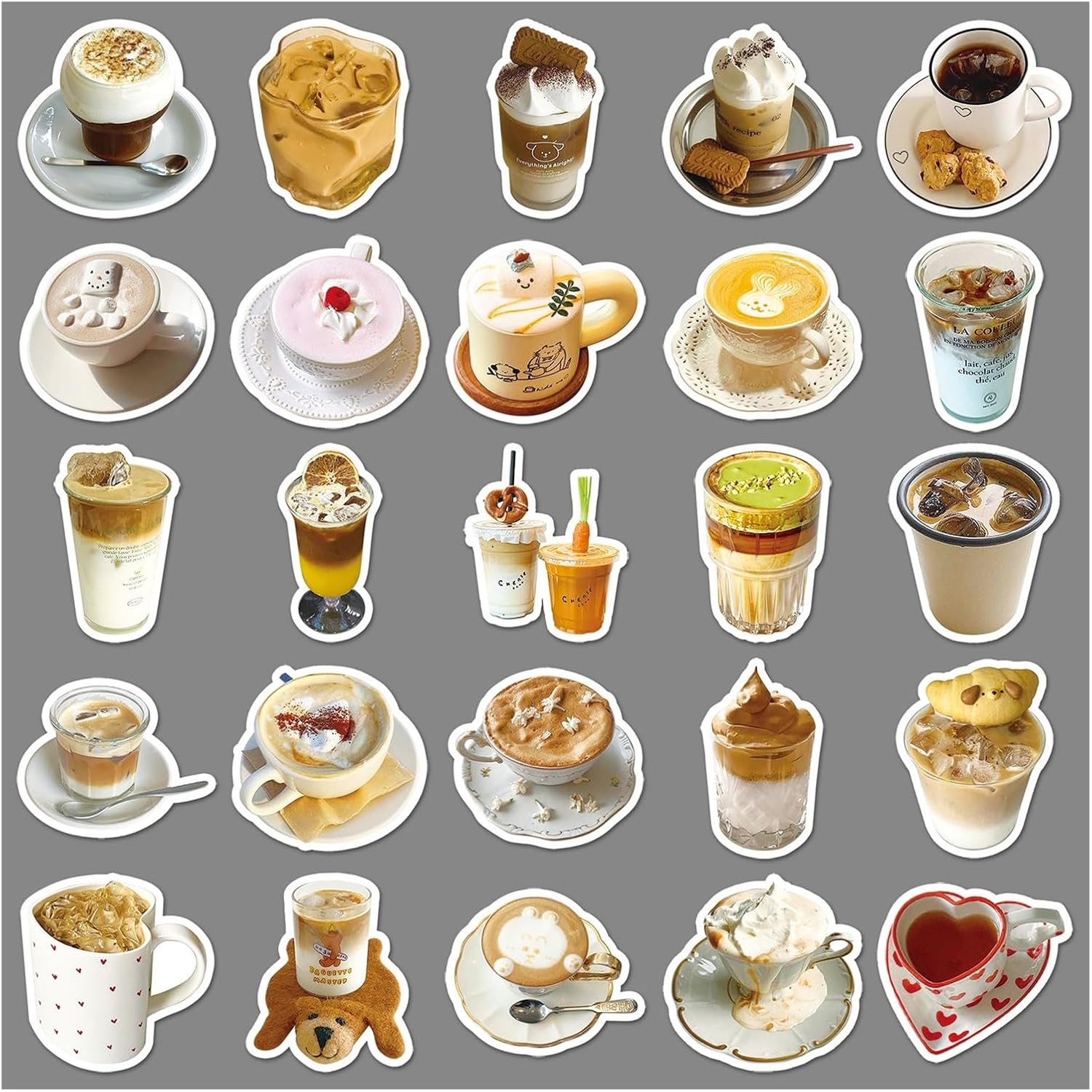 Confezione da 50 adesivi in vinile per caffè e bevande, carini ed estetici, per laptop, bottiglie d'acqua, valigie, skateboard, diari, ideali per amanti del caffè e adolescenti