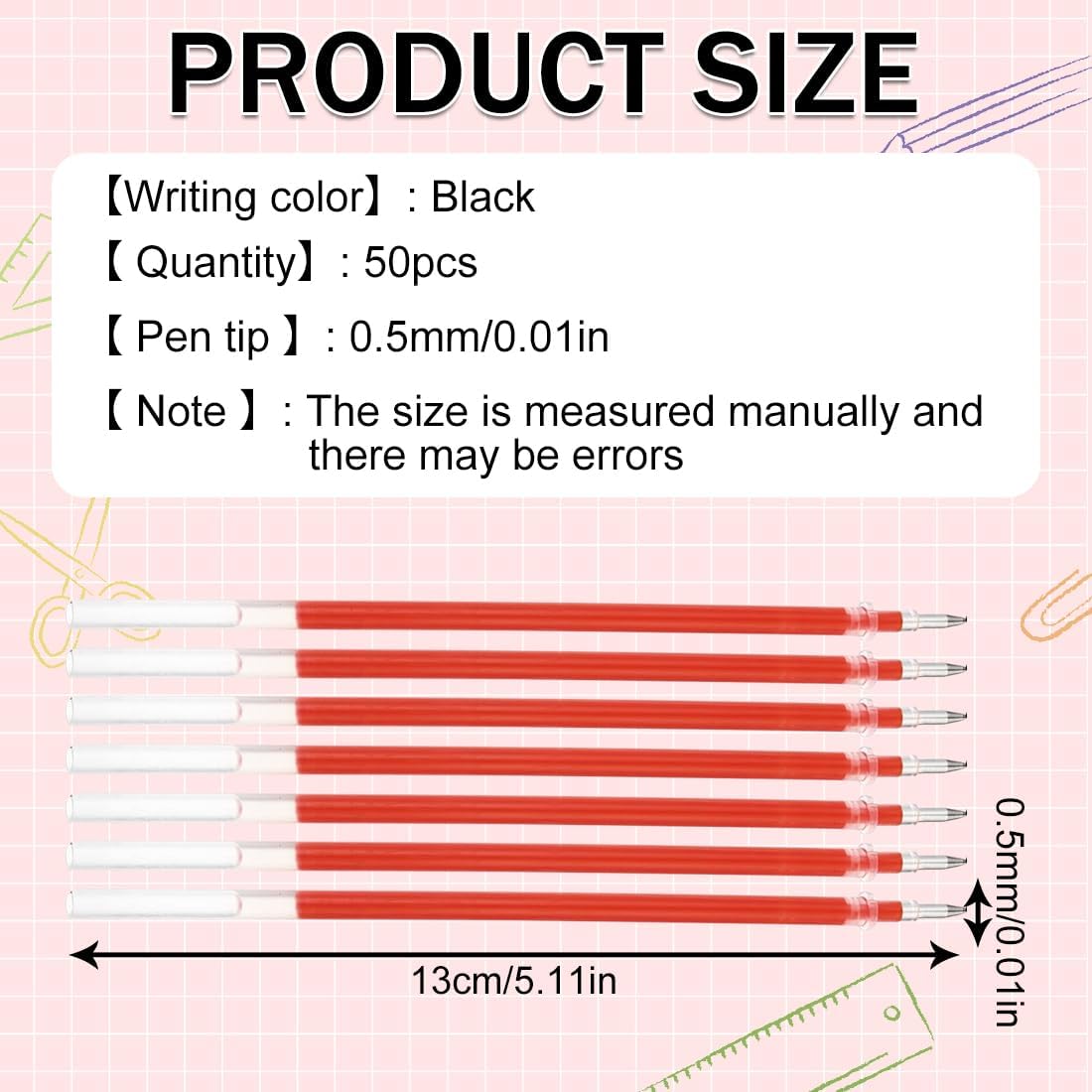 【Contenuto della confezione】 Riceverai 50 ricariche per penna a sfera rosse da 0,5 mm, adatte a penne a scatto, con una lunghezza di 145 mm; una quantità sufficiente per soddisfare le tue diverse esigenze di scrittura, studio e lavoro, e potrai condividerle con amici e compagni di classe. 【Facile da usare】 Puoi tagliare le ricariche in base alla lunghezza per adattarle a diverse penne, risparmiando tempo ed energia; sono facili da trasportare e pratiche; se le ricariche sono troppo lunghe, puoi tagliarle in base alle dimensioni della confezione. 【Occasioni applicabili】 Queste ricariche sono adatte a qualsiasi occasione, tra cui casa, classe, ufficio, negozio, ecc., e un numero sufficiente di ricariche tascabili è più facile da riporre; possono anche essere regalate. 【Prestazioni eccellenti】Le ricariche per penna a sfera sono dotate di una punta da 0,5 mm, che consente di scrivere o disegnare linee sottili sulla carta in modo fluido e semplice, abbinandosi perfettamente alla penna a scatto. 【Servizio di qualità】Per qualsiasi domanda sui nostri prodotti, non esitate a contattarci: faremo del nostro meglio per aiutarvi.