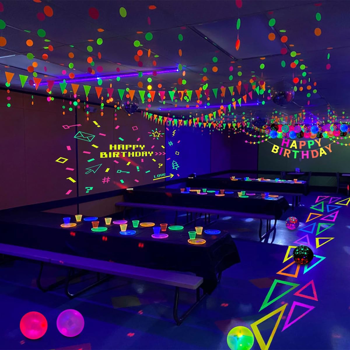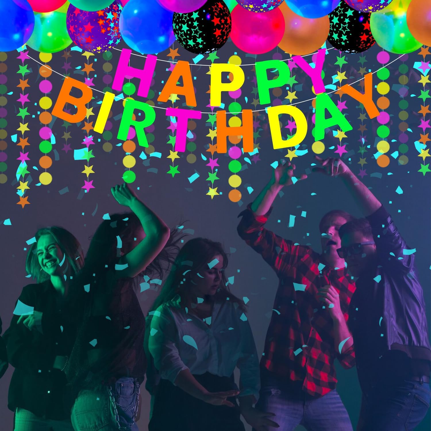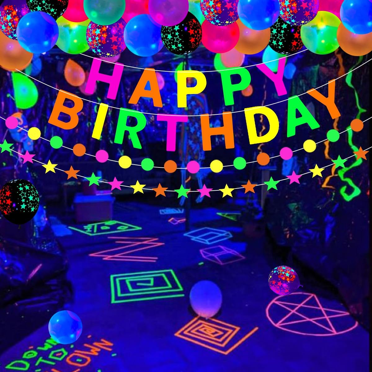 La confezione include: palloncini in lattice di colore misto da 20 pezzi da 12 pollici; Palloncini stellari reattivi alla luce nera da 20 x 12 pollici (10 viola, 10 neri); 6 nastri adesivi in tessuto fluorescente (1 giallo, 1 arancione, 1 verde, 1 rosa, 1 viola, 1 blu); 1 ghirlanda rotonda a pois di carta neon; 1 ghirlanda di stelle di carta al neon; 1 striscione fosforescente, 2 punti adesivi, 1 catena per palloncini. Questo set per feste è sufficiente per decorare la tua festa di compleanno e farà risplendere la tua festa. I bambini e gli adulti li adoreranno. Qualità affidabile: i palloncini che si illuminano al buio sono realizzati in lattice naturale, sicuri, non tossici, non facili da scoppiare e possono riflettere la fluorescenza di notte. Lo striscione a luce nera e le ghirlande di carta lucida sono realizzati in cartoncino spesso e robusto, colori brillanti, superficie liscia, leggero, non tossico, riutilizzabile e durevole. Le strisce luminescenti sono realizzate in cotone UV, che è durevole, impermeabile, facile da rimuovere senza lasciare residui e può essere utilizzato senza alcun effetto anche se calpestato molte volte. Design unico: le nostre forniture per feste a luce nera trasformeranno il tuo locale in un paese delle meraviglie al neon personalizzato, che contribuirà ad aggiungere un'atmosfera abbagliante. Gli effetti luminosi creati dagli oggetti attireranno immediatamente l'attenzione di tutti. Impressiona i tuoi ospiti e ti regala una grande festa. Palloncini al neon, striscioni fluorescenti, corde luminose e strisce fluorescenti emettono effetti fluorescenti sotto specifiche luci UV di notte. Nessuna reazione di fluorescenza sotto la luce normale Facile da usare: le luci al neon per compleanno sono preassemblate, quindi puoi appenderle direttamente. Gonfia i palloncini con aria o elio, quindi puoi usarli per decorare le finestre, la camera da letto, il soggiorno, la biblioteca, il giardino, l'interno o l'esterno come preferisci. Il nastro reattivo alla luce nera si applica a quasi tutto e può aderire a qualsiasi superficie asciutta. Puoi abbinare il kit con altri accessori per feste di compleanno a luce nera, quindi goderti una piacevole festa con i tuoi amici e familiari. Scelta ideale: le forniture per feste che si illuminano al buio sono adatte per feste di compleanno che si illuminano al buio, feste a tema neon, feste a tema luce nera, feste che si illuminano al buio, feste di compleanno al neon, decorazioni sceniche, baby shower, feste di crescita, feste in discoteca retrò, carnevale festivo, feste di compleanno a tema palloncini, feste in maschera, feste di ricongiungimento, matrimoni, buffet, riunioni di famiglia, sfondi fotografici. Possono offrirti un divertimento visivo diverso e rendere la tua festa più emozionante.