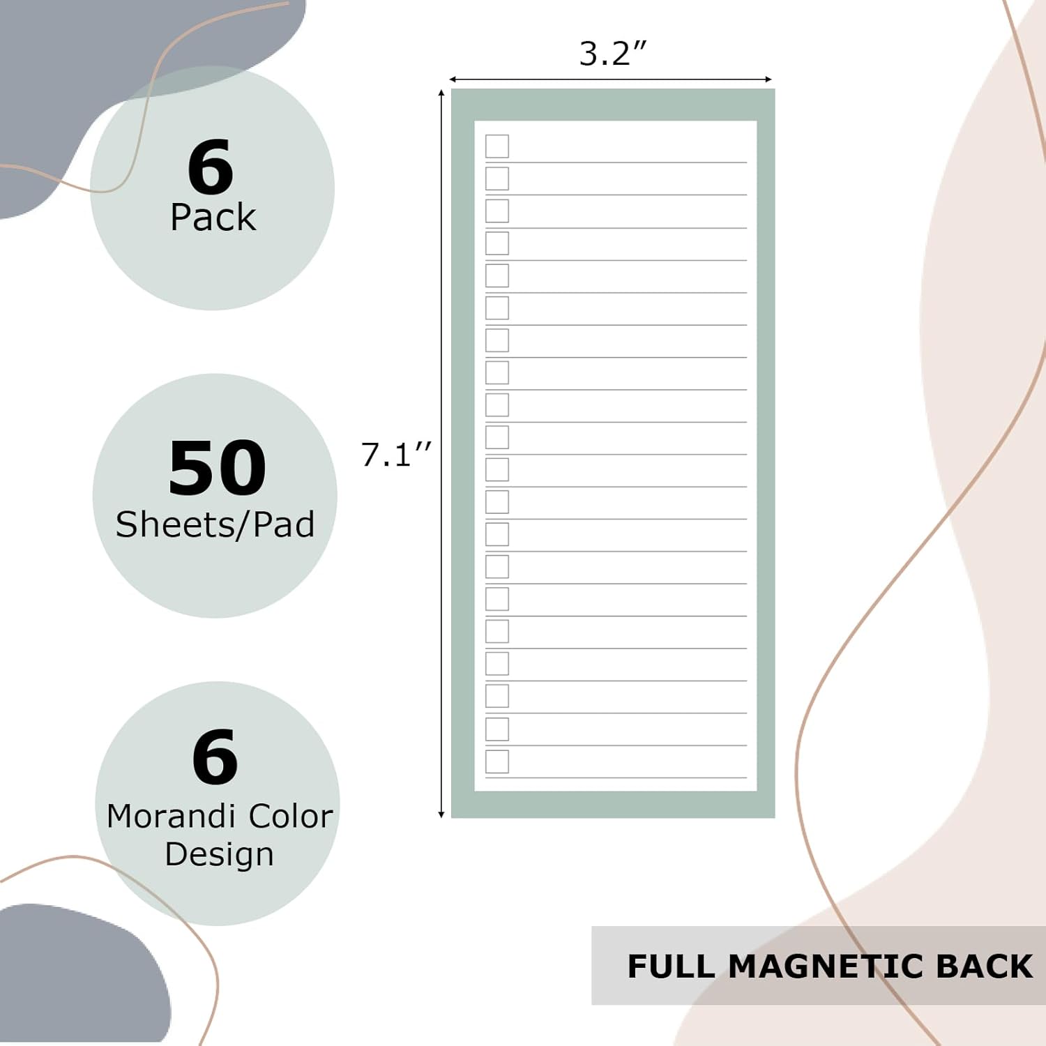 FOGLI PREMIUM: I nostri quaderni magnetici da frigorifero sono realizzati con carta stampata senza legno, che impedisce una facile penetrazione dell'inchiostro. La parte posteriore è completamente magnetizzata, garantendo un fissaggio sicuro a qualsiasi superficie magnetica. Non scivolerà, cadrà o si graffierà, fornendo una soluzione affidabile e duratura per le tue esigenze di prendere appunti. Design colorato Morandi: ciascuno di questi sei taccuini per la lista della spesa presenta un design minimalista con toni eleganti e sobri, offrendo semplicità ed eleganza. Ottimo per la pianificazione del frigorifero, le liste della spesa e per prendere appunti in generale. Il retro magnetico li rende perfetti per l'uso in frigorifero, creando un pratico ed elegante blocco note magnetico per la lista della spesa. Confezione conveniente: ottieni un set di 6 blocchi note magnetici per il frigorifero. Posizionali su superfici comode come il frigorifero, l'armadietto o l'armadietto. Usali per annotare appunti importanti, appuntamenti, piani o promemoria, assicurandoti di non dimenticare mai nulla di importante. Utilizzo versatile: questo versatile blocco magnetico per lista della spesa per frigorifero è perfetto per creare liste della spesa, liste della spesa, liste di cose da fare, promemoria e persino ricette. È ideale per l'uso in ufficio, a casa, a scuola ed è un regalo premuroso per gli insegnanti o per chiunque apprezzi gli strumenti organizzativi. Contenuto: Un set di 6 block notes magnetici da frigorifero, ciascuno da 50 fogli, per un totale di 300 fogli