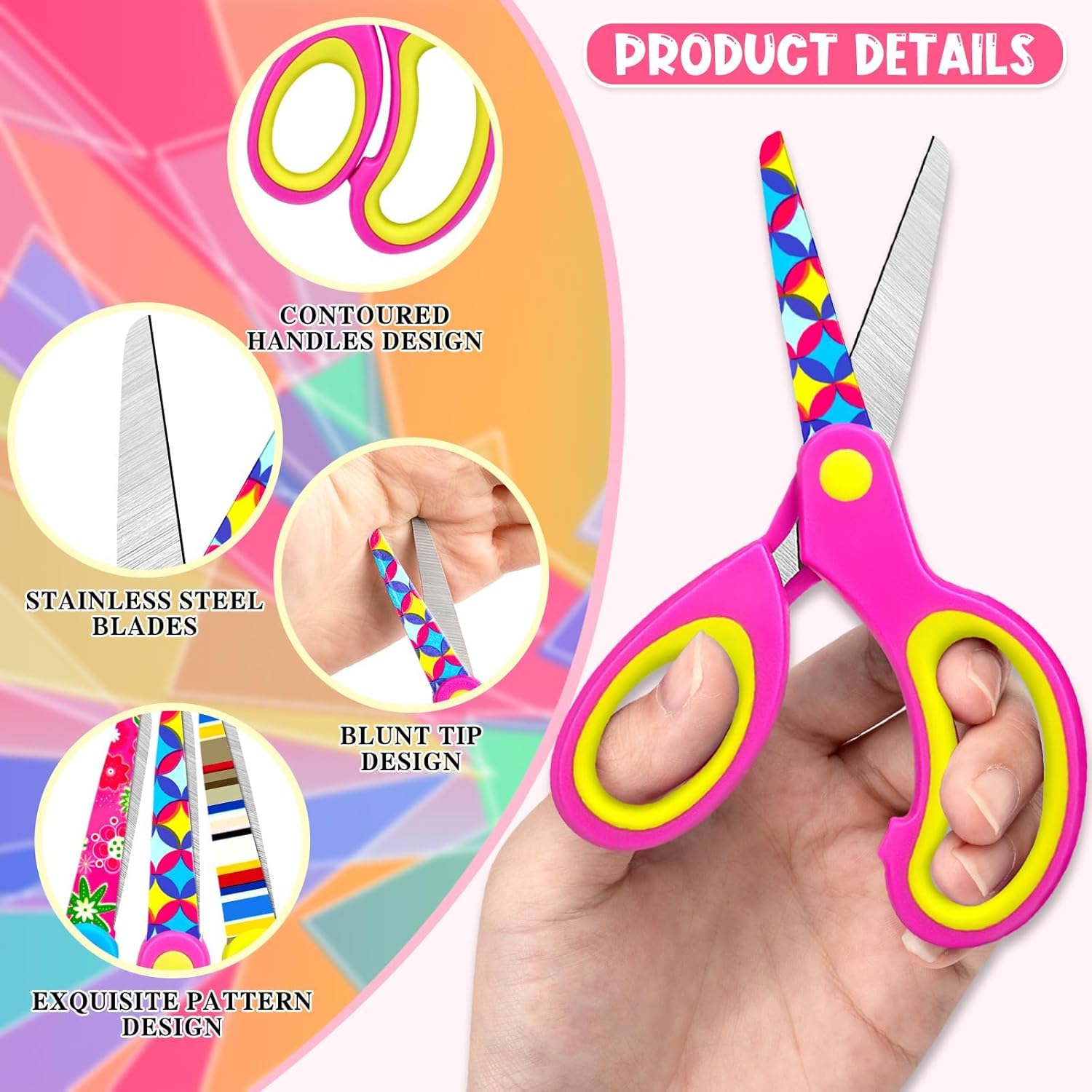 Materiale e dimensioni in acciaio inossidabile Materiale e dimensioni Acciaio inossidabile Materiale e dimensioni: le nostre forbici in plastica sono realizzate in acciaio inossidabile di alta qualità, non arrugginiscono e si deformano facilmente, possono mantenere un uso prolungato per tagliare le cose lisce e setose e senza sforzo, ogni forbici per bambini misura 13,5 x 5,6 cm Modelli preferiti dai bambini: riceverai 6 forbici di sicurezza, 3 colori, ogni forbici per bambini ha un pieno di motivi divertenti per bambini sulla lama, con colori vivaci per rendere queste forbici più interessanti, possono attirare l'attenzione dei bambini, aumentare l'interesse pratico dei bambini, stimolare la creatività dei bambini Design premuroso con bordo smussato: le nostre forbici per bambini sono progettate con un bordo smussato dalla punta della lama al bordo esterno della lama, che consente ai bambini di tagliare se stessi o gli altri involontariamente durante l'uso, o di colpirsi dimenticando di chiudere le forbici dopo l'uso Adatto per principianti: queste forbici per bambini di età compresa tra 8 e 12 anni sono progettate in base alle dimensioni della mano del bambino, sono ottimi oggetti di scena per le lezioni di artigianato scolastico, sono anche materiale scolastico per i bambini da utilizzare in classe da soli e sono una buona scelta per gli utenti di forbici per la prima volta Ampiamente usate per il fai da te: queste forbici prescolari possono essere utilizzate non solo come materiale scolastico, ma anche un buon strumento per l'ufficio e l'uso domestico, utilizzate per tagliare cartone, cartone, corda, rotoli di consegna e altre forniture artigianali, e anche un bel regalo per i bambini