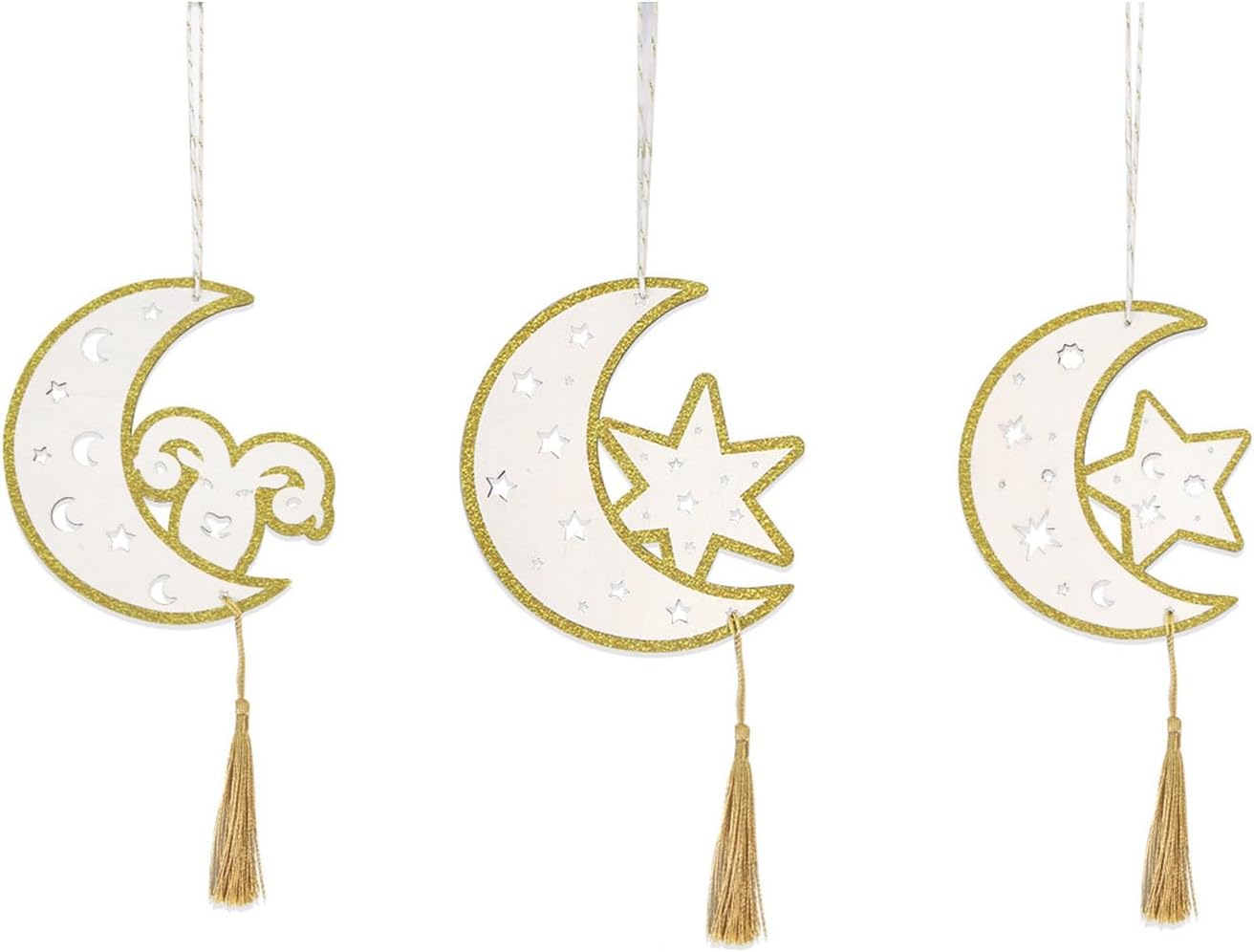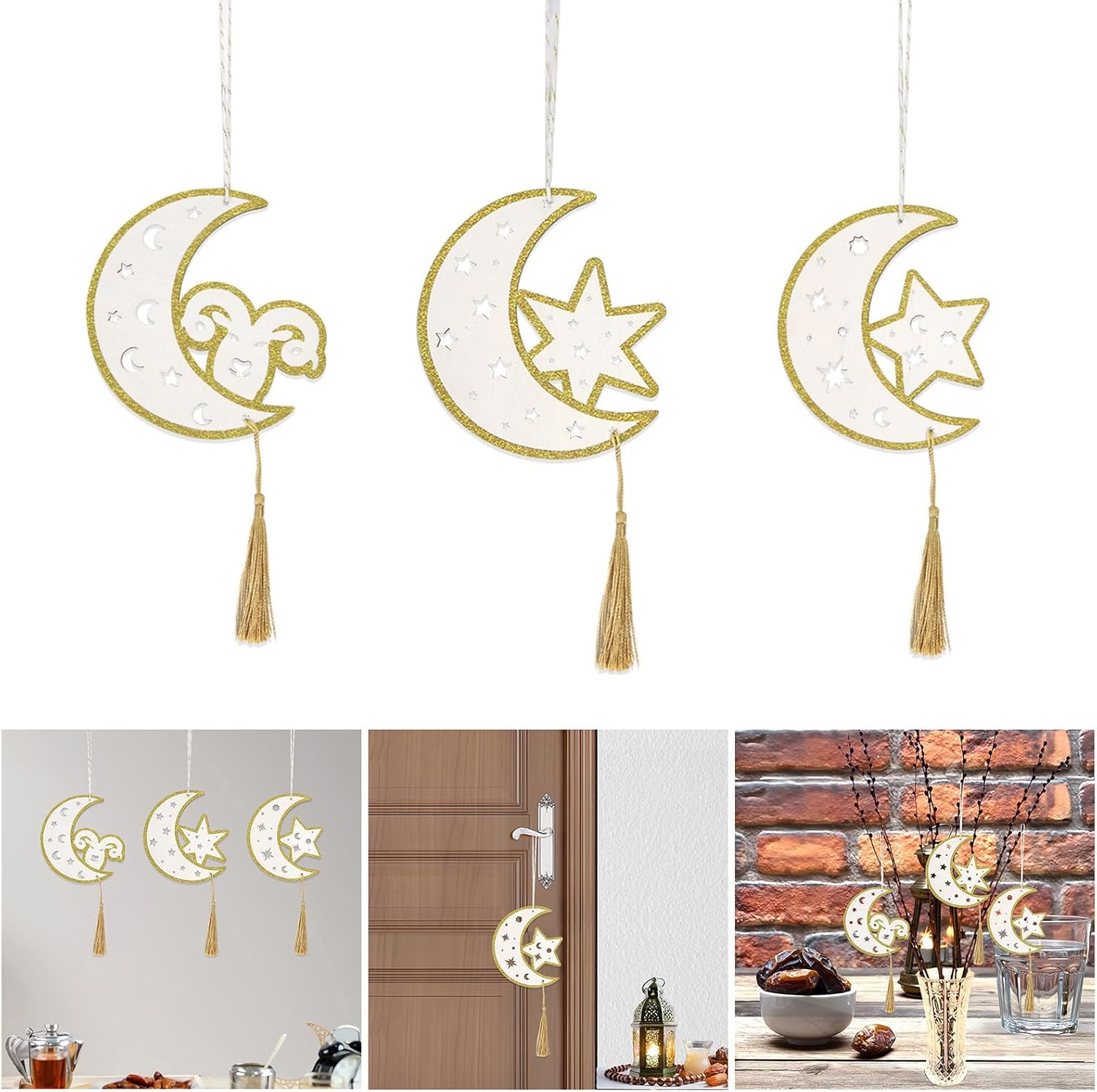 Realizzati in legno combinato con nappe, questi ornamenti sono finemente dettagliati e facili da appendere per famiglie musulmane, devoti religiosi e coloro che apprezzano la decorazione esotica, aggiungendo un tocco di fascino culturale a qualsiasi spazio Adatto per la decorazione della casa durante ramadan, ornamento per moschea o allestimento di luoghi per eventi di festival, portando calore e spiritualità ai tuoi dintorni Festeggia l'aria dei ramadan con il nostro ornamento fatto a mano con nappe in legno a forma di stella e luna, progettato per migliorare la decorazione del festival con eleganza e tradizione Queste decorazioni in legno servono come un bellissimo ricordo della fede e della celebrazione, rendendo un'aggiunta elegante alle tue collezioni per le vacanze
