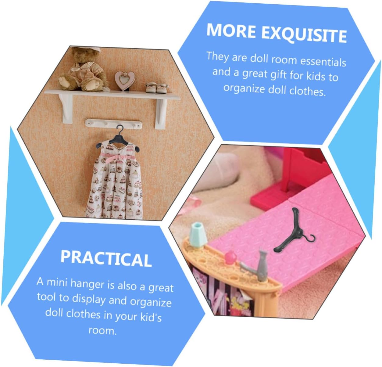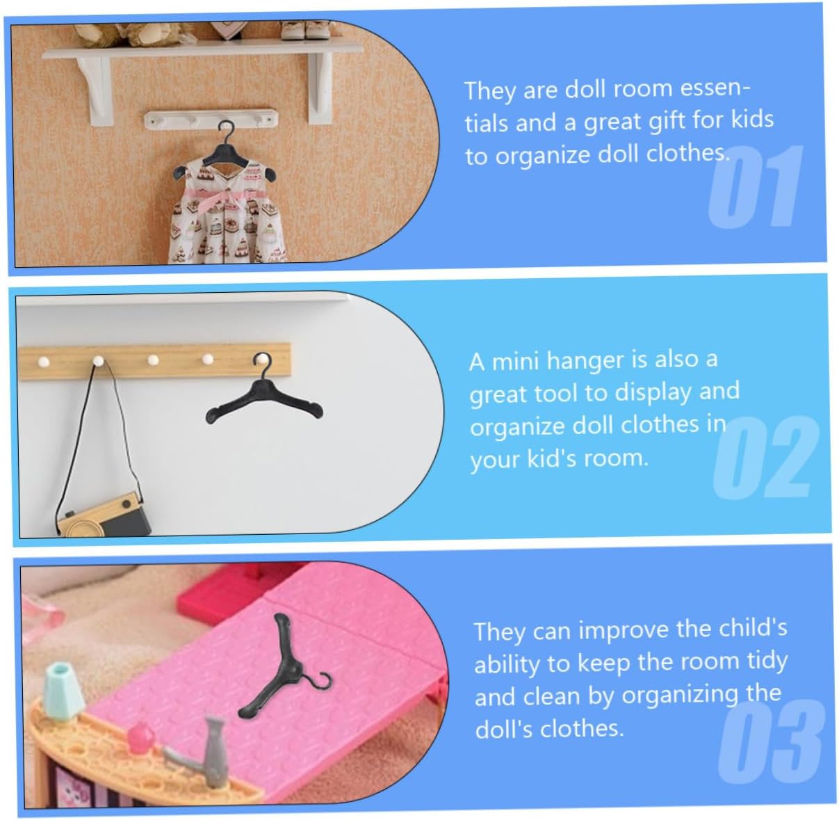 Grucce per vestiti in plastica - Superfici e angoli lisci che danneggeranno i vestiti delle bambole né le mani del tuo bambino, Grucce per vestiti in plastica Grucce per vestiti in miniatura - Puoi migliorare la capacità del bambino di mantenere la stanza ordinata e pulita organizzando i vestiti per le bambole, Grucce per vestiti in miniatura Mini grucce per vestiti - Sono un must per la stanza delle bambole e un ottimo regalo per organizzare i vestiti delle bambole. Mini grucce per casa Mini grucce per casa - Il materiale plastico rende queste grucce durevoli senza sbiadire o trasferirsi, per prestazioni eccellenti, Grucce per vestiti in miniatura Mini accessori per casa delle bambole - Materiale plastico, non arrugginisce, leggero e facile da trasportare, molto adatto per le ragazze che vestono bambole, grucce per casa delle bambole