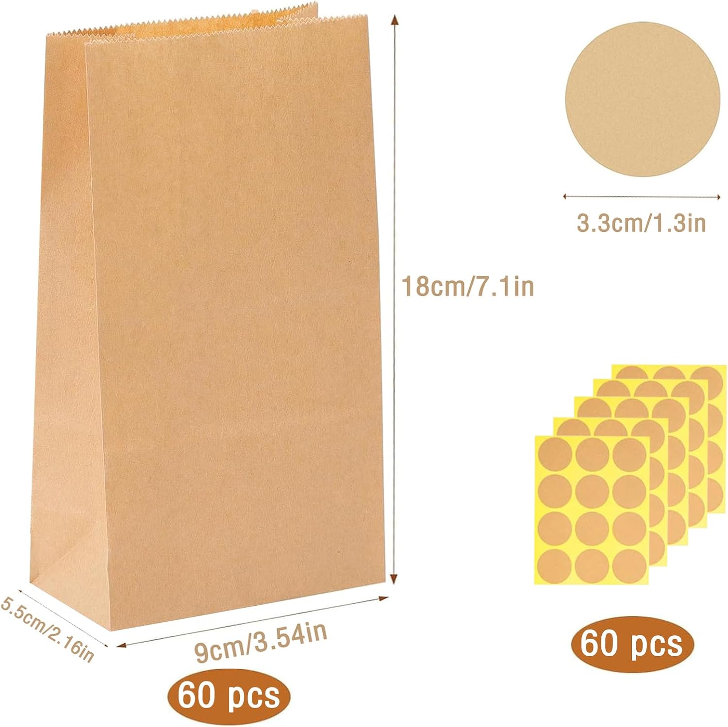 [Alta qualità al 100%] - I sacchetti di carta sono realizzati in carta kraft di alta qualità, possono essere riutilizzati più volte, inodori, biodegradabili. Non hanno un odore strano e sembrano più eleganti dei sacchetti di plastica. Sostieni uno stile di vita attento all'ambiente! [Piccoli sacchetti di carta con adesivi] - La confezione contiene 60 piccoli sacchetti regalo e 60 adesivi. NOTA: i sacchetti di carta kraft sono piccoli, misurano 9 x 18 x 5,5 cm, solo per piccoli regali, biscotti, dolci, sacchetti di frutta, panini, cereali, riso, semi di fiori e altro ancora. [Borse per calendario dell'Avvento fai da te] - Le buste con sacchetti di carta marrone non hanno grafica o parole sulla superficie, possono essere dipinte, stampate e abbellite secondo i tuoi desideri per creare disegni individuali e creativi, perfetti per l'artigianato e il fai-da-te. [Multiuso] - Queste pratiche borse per sandwich possono essere facilmente montate e piegate. Perfetti come sacchetti per calendario dell'Avvento da riempire, sacchettini di Natale da riempire, sacchettini per bomboniere, sacchettini per feste di compleanno, sacchettini per feste di compleanno per bambini, sacchettini per dolciumi di Halloween. [Servizio professionale] - Se hai domande, non esitare a contattarci, ti risponderemo entro 12 ore. Offriamo resi e cambi gratuiti per 12 mesi, il tuo acquisto è privo di rischi, sentiti libero di acquistare.