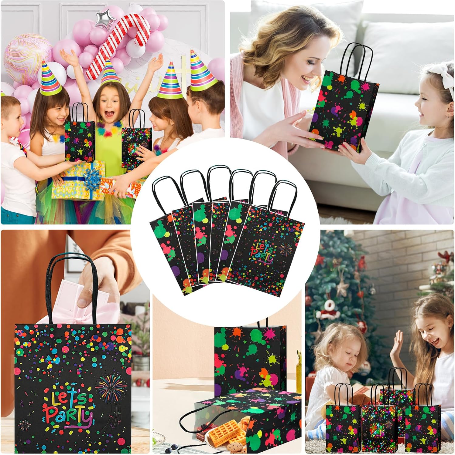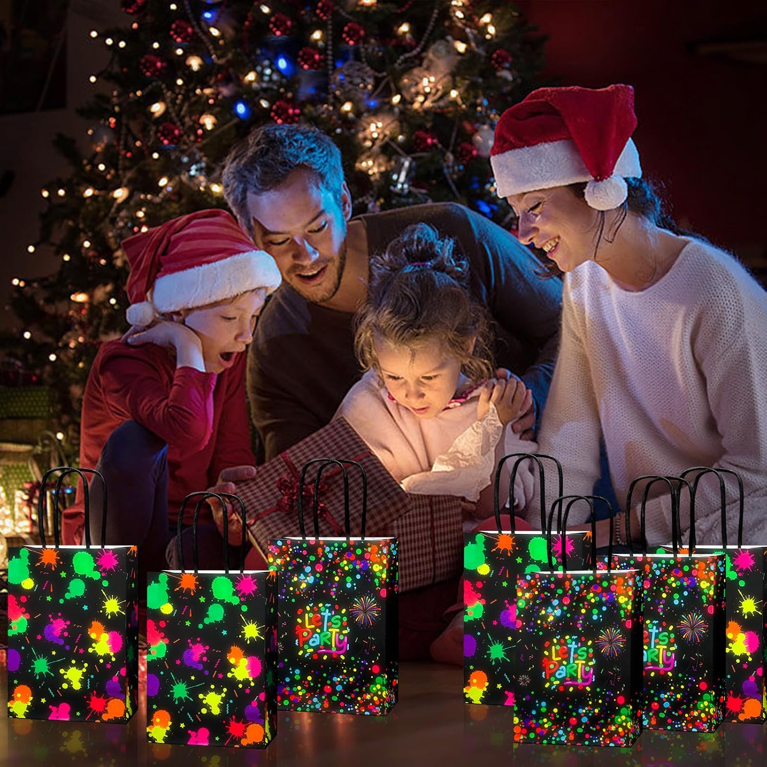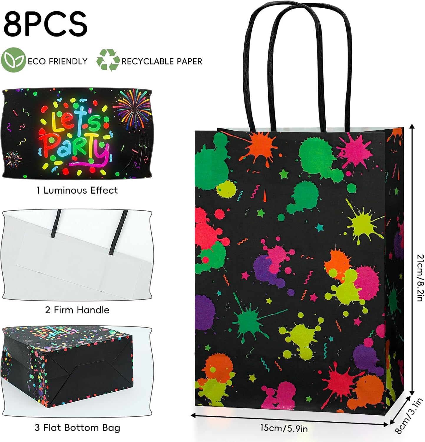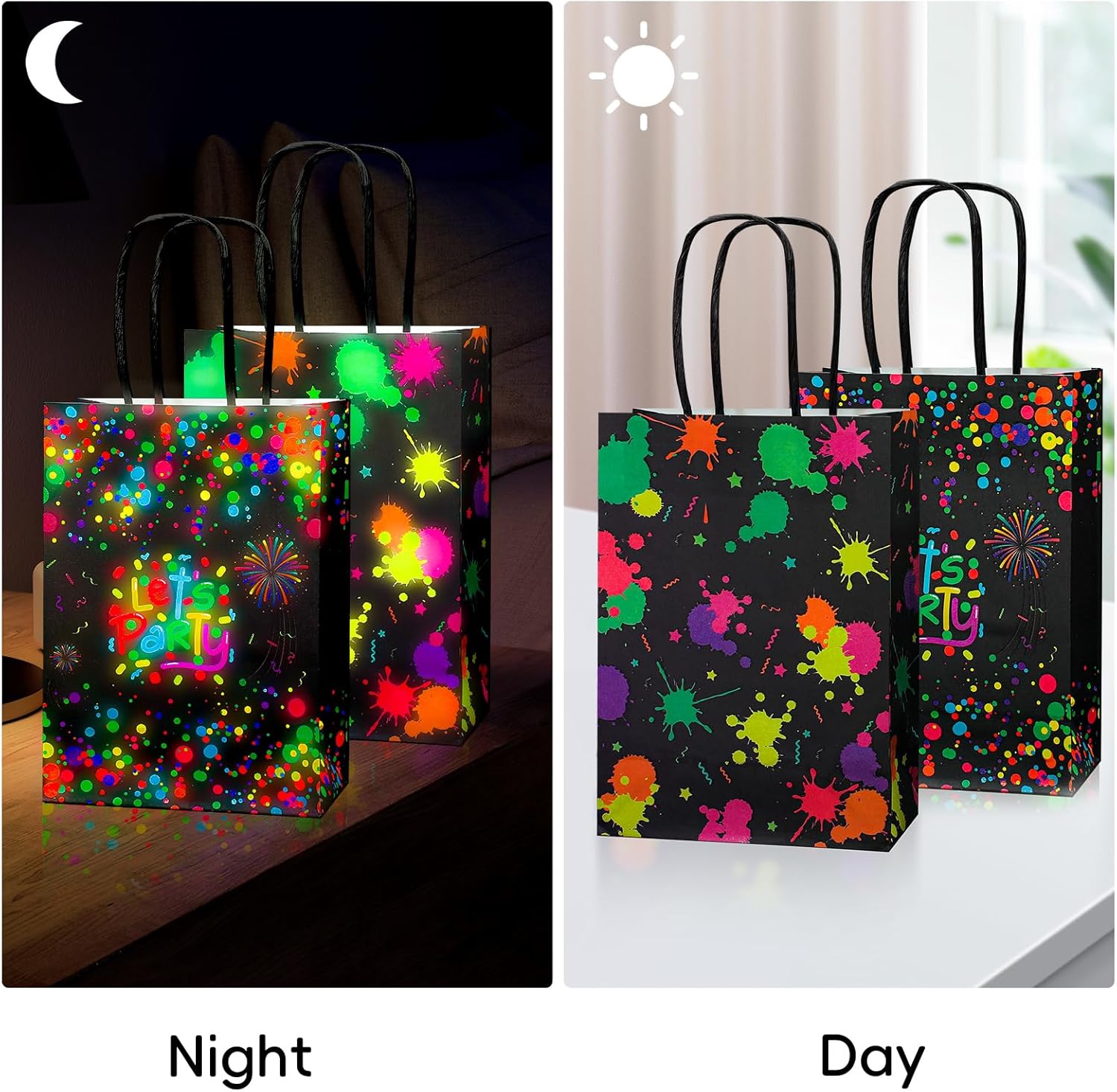【Effetto luminoso】 Riceverai 8 sacchetti regalo fosforescenti con manici, 15 x 21 x 8 cm x 5,9 x 8,2 x 3,1 in favori borsa da festa al neon e stampati con motivi luminosi, quantità sufficiente da utilizzare e sostituire. 【Effetto effetto luce】 Queste borse per feste di Natale sono stampate con motivi luminosi, sicuri al 100% che brilleranno intensamente al buio! La borsa da festa creativa crea un'atmosfera vivace per te e i tuoi ospiti o amici per godervi la festa. 【Materiale Premium】 I sacchetti per bomboniere che si illuminano al buio sono realizzati in carta kraft, non facile da strappare, il materiale è leggero e riutilizzabile, il che è molto rispettoso dell'ambiente. La stampa e la tintura artigianale sembrano belle e delicate. 【Ampia applicazione】 Le gag regalo fosforescenti non possono essere utilizzate solo come forniture per feste, ma possono anche essere utilizzate come confezioni quotidiane, adatte per piccoli snack, dolci, piccole torte, piccoli giocattoli. 【Preparazione da 10 MINUTI】 Esponi ciascuna borsa che si illumina al buio alla luce come la luce solare e la luce UV per 10-15 minuti e troverai borse luminose più luminose. Si illuminano solo le lettere e i motivi.