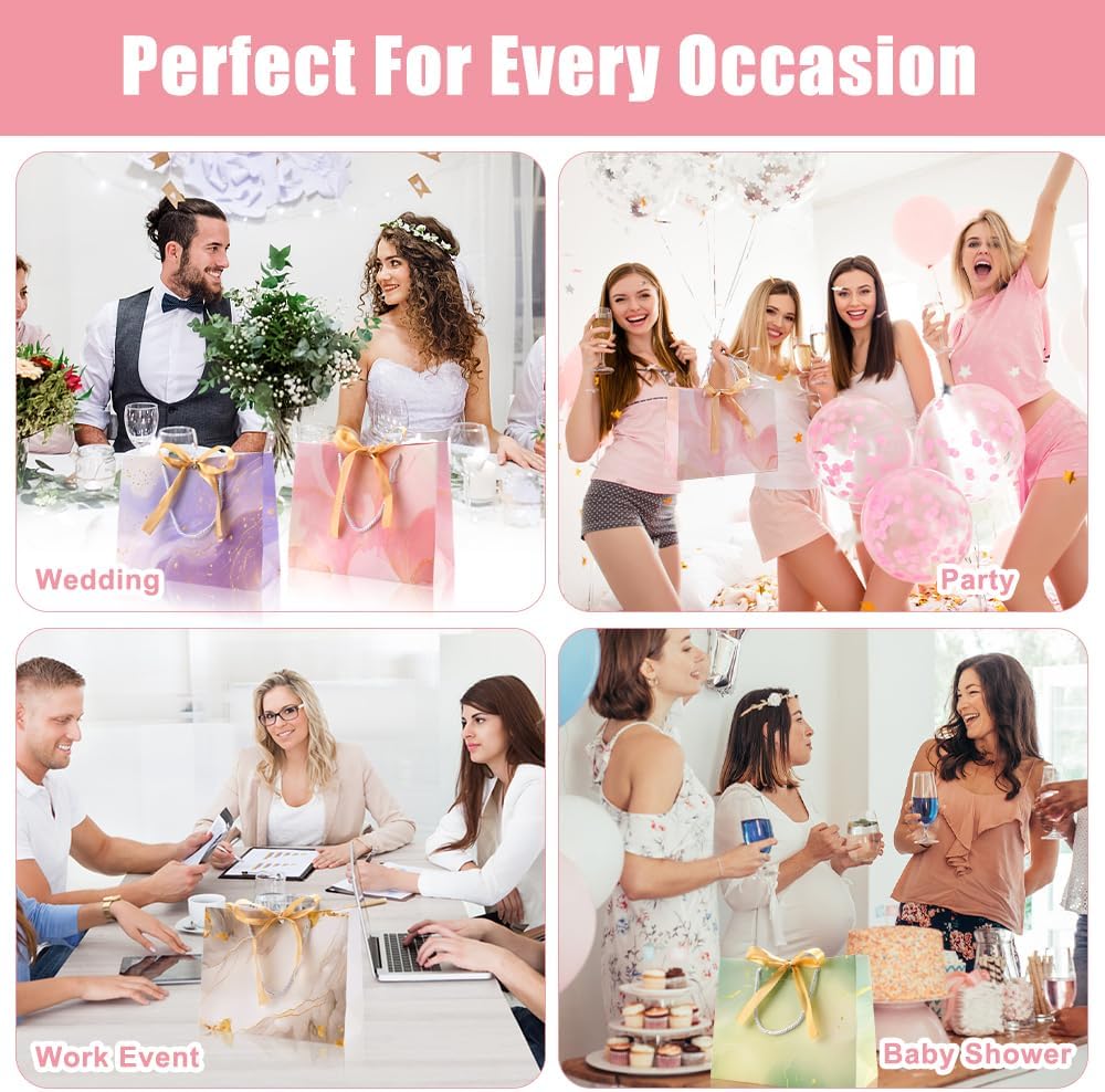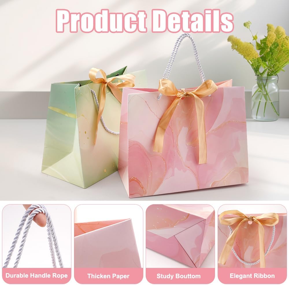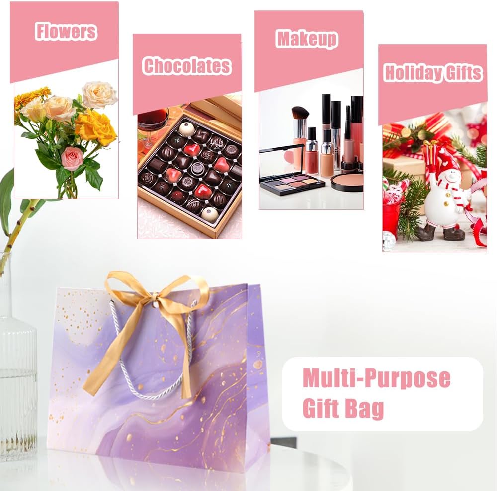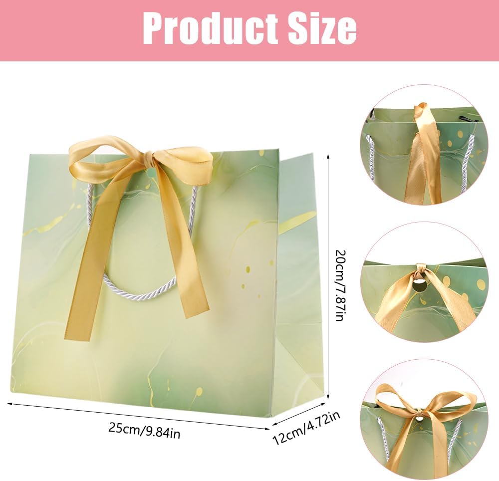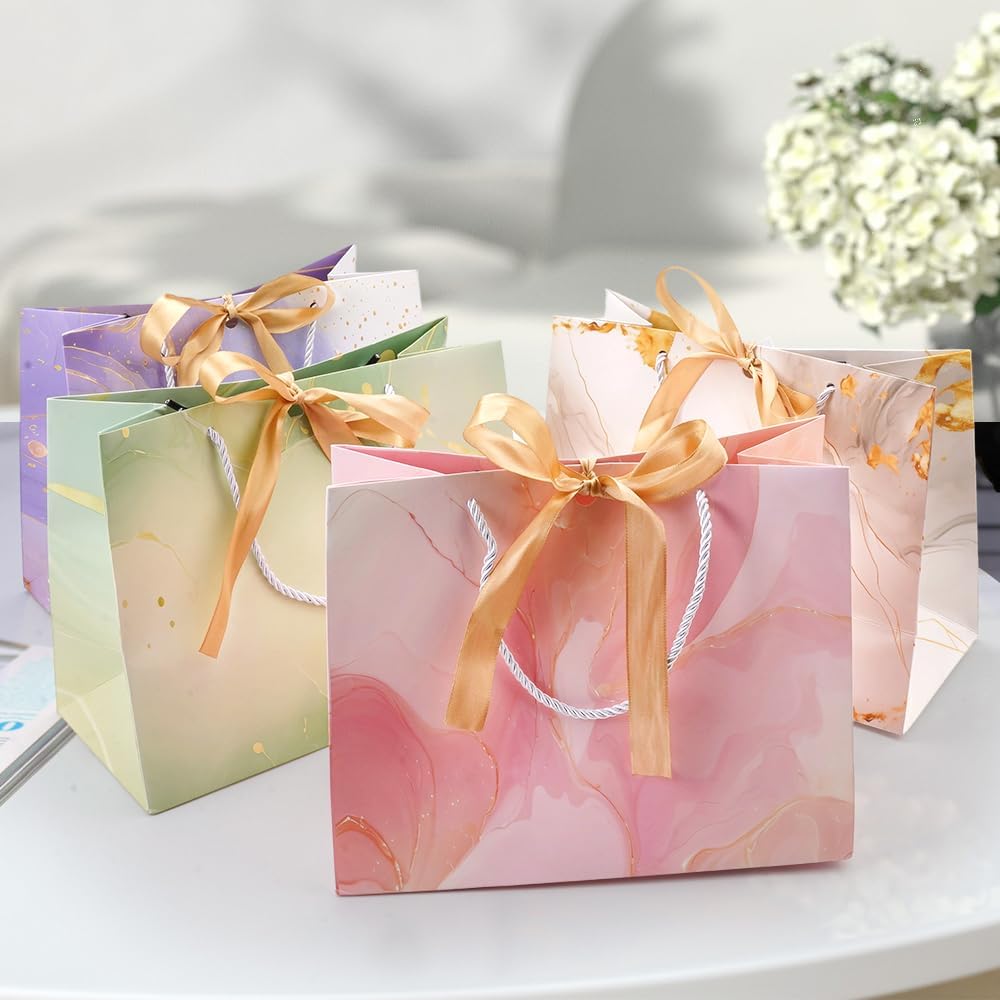 ELEGANTE SET BORSE REGALO: Il sacchetto regalo con fiocco contiene 8 sacchetti di carta con manici e nastri di dimensioni 25 x 20 x 12 cm, disponibili in quattro diversi colori: rosa, viola, bianco e verde. Questi versatili sacchetti regalo per matrimoni si abbinano facilmente a vari temi di eventi e preferenze personali e sono adatti a una varietà di scenari di regali. MATERIALE DI ALTA QUALITÀ: I sacchetti regalo di compleanno sono realizzati in carta spessa e di alta qualità con una consistenza liscia, una superficie resistente all'acqua e alla polvere e una struttura durevole e resistente agli strappi. Le robuste maniglie e la base rinforzata garantiscono un facile trasporto e un'ottima capacità di carico, consentendo di trasportare in sicurezza oggetti fino a 2,5 chilogrammi di peso. DESIGN ELEGANTE: la superficie della borsa da regalo presenta eleganti texture marmoree accentuate da nastri di alta qualità, evidenziando uno stile estetico sofisticato. Il sacchetto regalo migliora notevolmente la qualità complessiva del regalo e unisce un look alla moda con una qualità eccezionale, in modo che il destinatario apprezzi ancora di più il contenuto. RIUTILIZZABILE: il fondo di ogni sacchetto da regalo in carta è rinforzato con imbottitura per mantenerlo saldamente in posizione, garantendo durata e affidabilità. Quando non viene utilizzato, può essere ripiegato per risparmiare spazio e riutilizzato. VERSATILE PER MOLTE OCCASIONI: set di sacchetti regalo Versatile per San Valentino, compleanni, festa della mamma, matrimoni, feste e regali per lo shopping. Possono essere utilizzati anche come custodie per cosmetici, orologi, occhiali, cravatte e altri piccoli oggetti, evidenziando senza sforzo l'atmosfera festosa e l'eleganza del regalo.