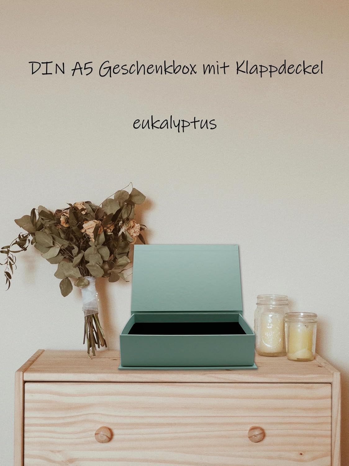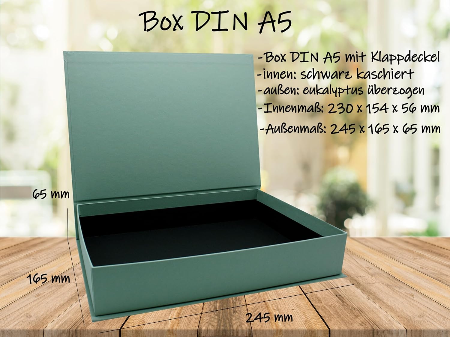 1 scatola regalo stabile e di alta qualità con coperchio, ideale per riporre documenti, lettere d'amore, portagioie o come confezione regalo per compleanni e tutte le altre celebrazioni. Riceverete una robusta scatola portaoggetti rivestita con carta di eucalipto di alta qualità: la scatola è rivestita internamente di nero e realizzata in robusto cartone per libri. Per te, come regalo o come decorazione. Dimensioni interne: 230 x 154 x 56 mm o lunghezza 23,0 cm x larghezza 16,5 cm x altezza 5,6 cm. Perfettamente adatto per documenti DIN A5 - dimensioni esterne: 245 x 165 x 65 mm o lunghezza 24,5 cm x larghezza 16,5 cm x altezza 6,5 cm. Design molto stabile, impilabile grazie al coperchio sporgente. Il contenuto è sempre protetto grazie al coperchio incernierato. Questa confezione regalo robusta e di alta qualità è disponibile in diverse dimensioni e colori - sfoglia il nostro negozio - NEUSER PAPIER: il professionista della carta e della carta da oltre 100 anni.