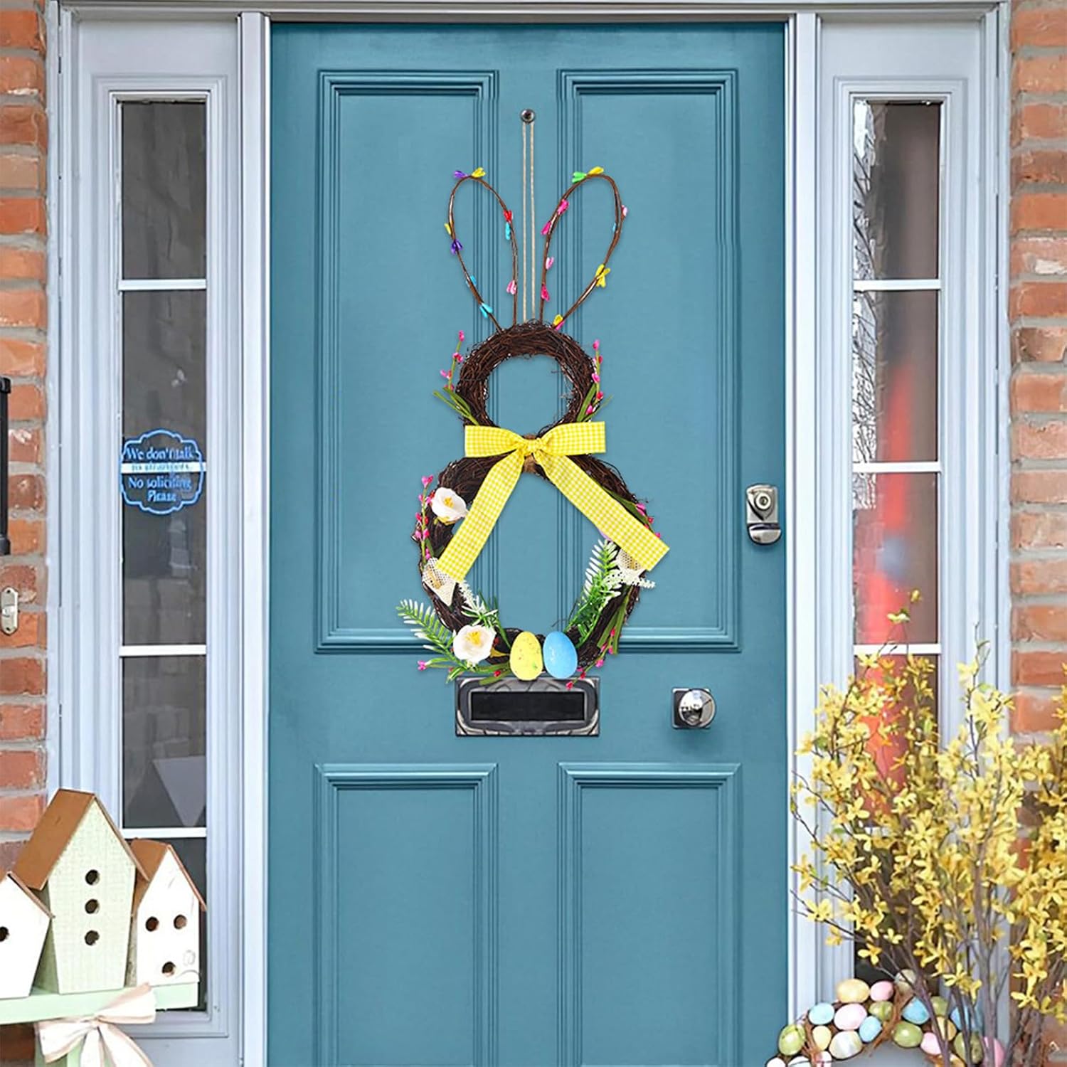 Materiali, materiali simulati, realistici e durevoli e non sbiadiscono facilmente, facili da appendere, facili da trasportare e riporre Ampiamente applicabile può essere appeso alla porta d'ingresso, sul cortile, alla finestra o alla recinzione artistica da giardino, adatto anche per casa, sala da pranzo, soggiorno, vacanze e feste, aggiungendo bella e calore in casa Meraviglioso dolce caldo amico famiglia o te stesso Design accattivante, il cartello da appendere alla porta di Pasqua ti porta un buon augurio di felicità Disegni a tema pasquale, la combinazione di coniglietti, mostra le atmosfere pasquali