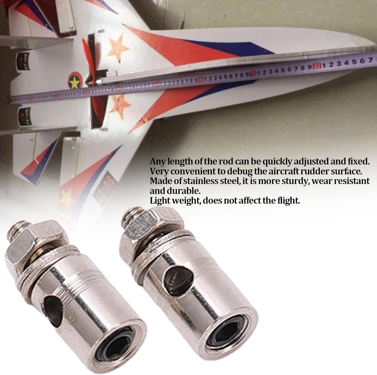 Acciaio inossidabile: realizzato in acciaio inossidabile di alta qualità, il connettore dell'asta di spinta è più robusto, resistente all'usura e durevole. Garanzia sulla quantità: sono inclusi un totale di 10 connettori servo con fermo dell'asta di spinta D1,8 mm, che possono soddisfare le tue esigenze di aggiornamento del tuo modello di aeroplano. Leggero: questi tappi per asta del connettore dell'asta sono leggeri e non influenzano il volo degli aeromodelli. Funzione principale: i connettori possono essere utilizzati per regolare e fissare rapidamente qualsiasi lunghezza del tirante, il che è molto comodo per il debug della superficie del timone dell'aereo. Applicazione: il diametro del foro è 1,8 mm, il diametro esagonale è 1,5 mm, i connettori dell'asta di spinta sono adatti per aste di spinta da 1,5 mm/0,06", 1,6 mm/0,06", 1,7 mm/0,07", 1,8 mm/0,07".
