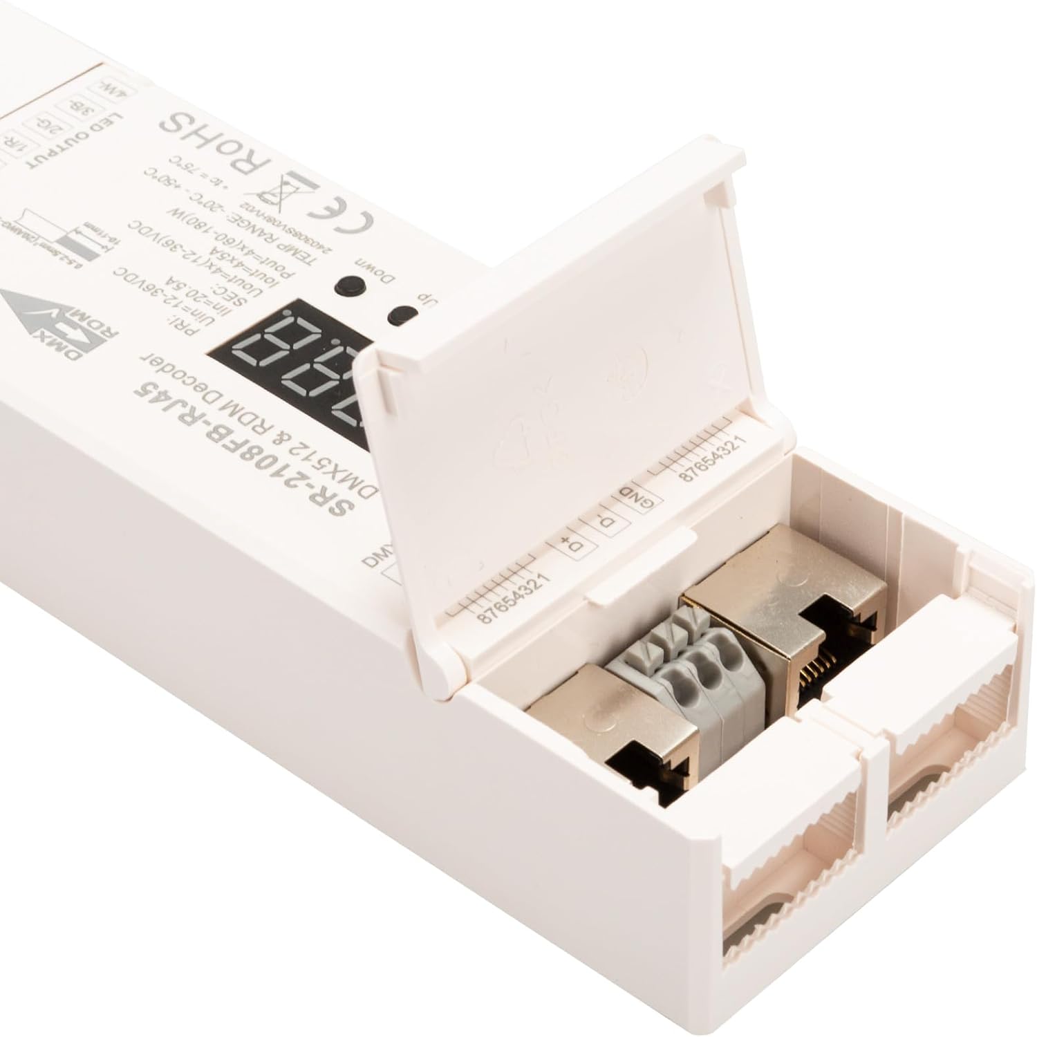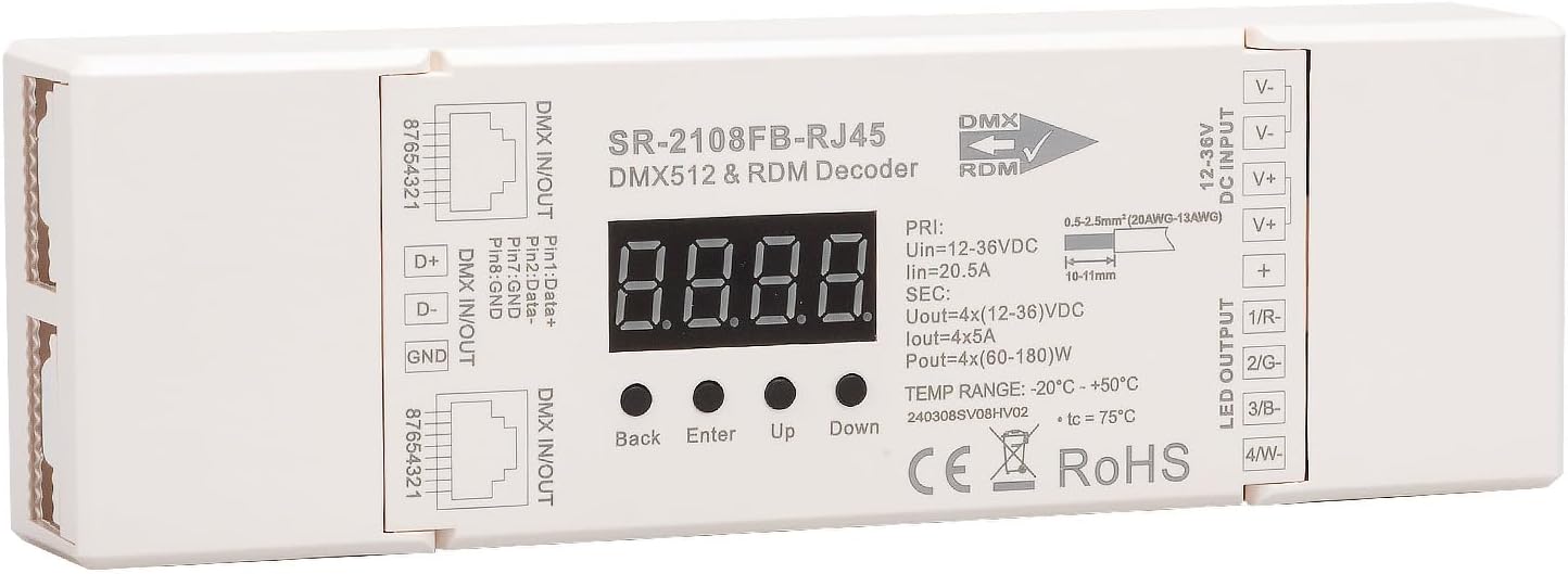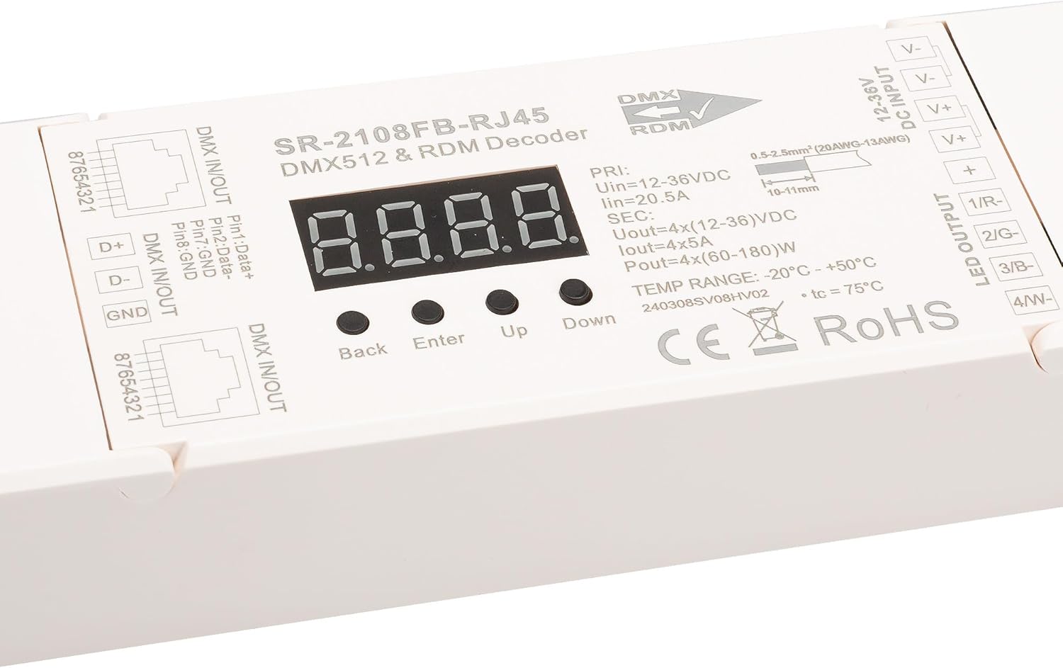 Decoder DMX/RDM a 4 canali con 5 A per canale, tensione costante 12-36 V PWM commutabile a 8/16 bit, frequenza selezionabile 500 Hz-30 kHz, gamma 0,1-9,9 modalità master e slave, 32 programmi RGB, controllo CCT per LED CW/WW RJ45 e morsetti a molla senza attrezzi, comunicazione RDM bidirezionale Robusto guscio in metallo, compatibile con DMX512, DMX512-A e RDM V1.0 12-36V CC 5A/CH 1-5CH Gamma regolabile