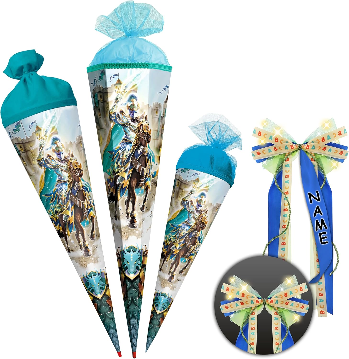 con bellissimo effetto 3D - stampa GLITTER e mica!! ____ stabile e di alta qualità - zaino per la scuola _____ Dimensioni: 35 cm di lunghezza (misurato solo il cartone) ___ Forma: ROTONDO ____ Motivo: "castello - cavaliere e cavallo" SPECIALE E INDIVIDUALE: _____ personalizzato con il NOME desiderato e il TESTO desiderato ___ / ____ il nome è richiesto - AUTOMATICAMENTE - per favore NON inviare un messaggio in anticipo LAVORO ARTIGIANALE genuino e made in Germany! _______ Materiale: cartone rivestito e di alta qualità - idrorepellente! ____ I coni scolastici lunghi 70 e 85 cm hanno una punta di legno stabile e fissata in modo permanente (originale Roth) _____ SUPER stabile e tanto spazio per fantastici regali! ____ ottimi colori di stampa! _______ / ___ il bordo superiore del sacchetto regalo ha un elegante bordo intrecciato e un'estremità in tulle dell'OCCHIO: ______ incluso un grande fiocco colorato coordinato - LED LIGHT & LIGHT - (nobile e fatto a mano) ______ la consegna dei bellissimi modelli di fiocchi è mista (puoi vedere esempi nelle immagini) per abbinarli, la marca _ alles-meine Gmbh __ offre oltre 1000 articoli relativi all'inizio della scuola ____ ad es. vari fiocchi come chiusure, piccoli zaini decorativi da appendere, candele, varie decorazioni per la stanza e la tavola, salvadanai ___ e persino imbottiture complete! ____ I coni scolastici sono ottime idee regalo... per l'inizio della scuola, dell'asilo e dell'asilo, per l'inizio della formazione o degli studi, per un nuovo lavoro! …. o un inizio diverso per una nuova fase della vita