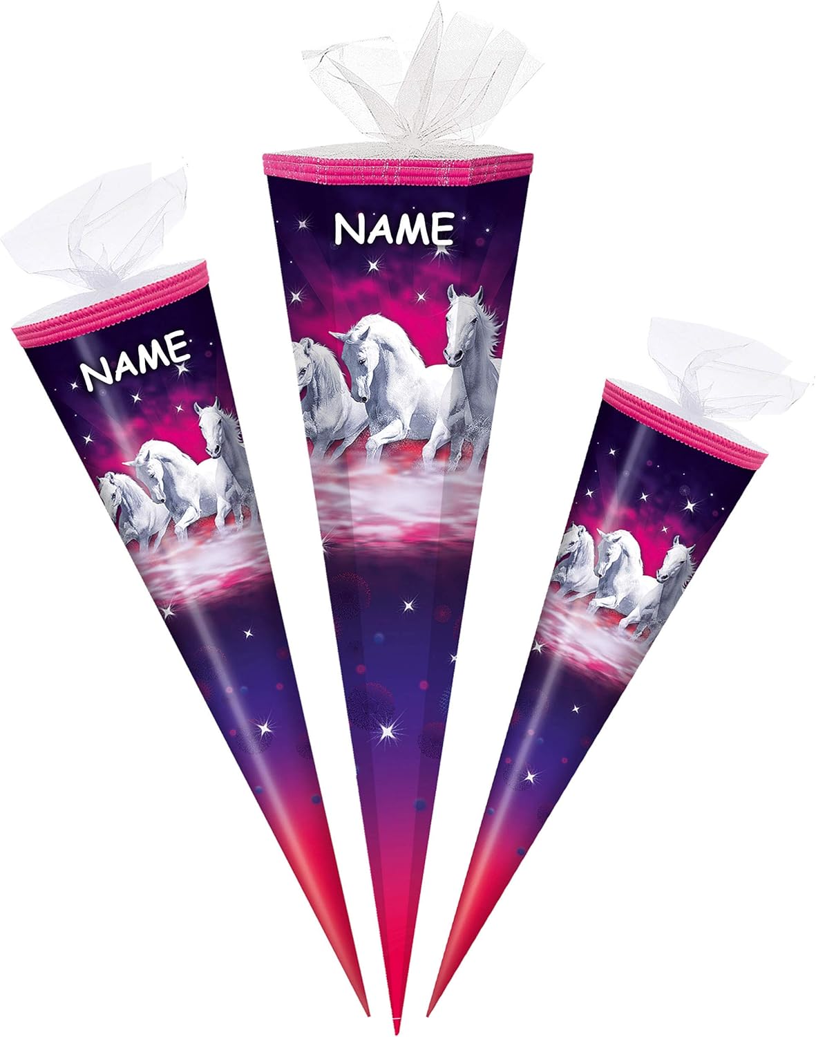 con bellissimo effetto 3D - stampa GLITTER e mica!! ____ stabile e di alta qualità - cono scolastico ___ 50 cm di lunghezza (misurato solo il cartone) ___ forma: ROTONDO ____ il bordo superiore ha un elegante bordo intrecciato e una finitura in tulle ____ motivo: "Cavalli da sogno - cavalli - stampo" l'OCCHIO: ______ il tuo cono scolastico individuale ___ incl. grande effetto 3D in colore coordinato _ LUCE LED E LUCE - fiocco - con il tuo NOME DESIDERATO + nome extra sullo zaino! Il nome è attaccato all'arco E al cono della scuola! ___ viene richiesto il nome - AUTOMATICAMENTE entro 4 ore - NON inviare un messaggio in anticipo ___ i modelli di fiocco vengono consegnati misti / cercheremo un bellissimo fiocco effetto 3D abbinato per il tuo cono scolastico (puoi vedere esempi nelle foto) prodotto in Germania! __ Materiale: cartone rivestito e di alta qualità - SUPER stabile! - idrorepellente! __ fantastici colori di stampa!_____ OPZIONALE è disponibile una punta in plastica abbinata, trasparente e solida da applicare (questo rende la punta del cono scolastico molto stabile e salda) ---- (questo articolo deve essere ordinato EXTRA al cono scolastico) da abbinare ai coni scolastici/sacchetti regalo ___ ci sono anche piccoli sacchetti da 10 cm come decorazione da appendere, targhette con il nome, decorazioni da tavola, coni scolastici con steli per composizioni floreali, motivi sparsi, ghirlande ecc. Articoli per feste