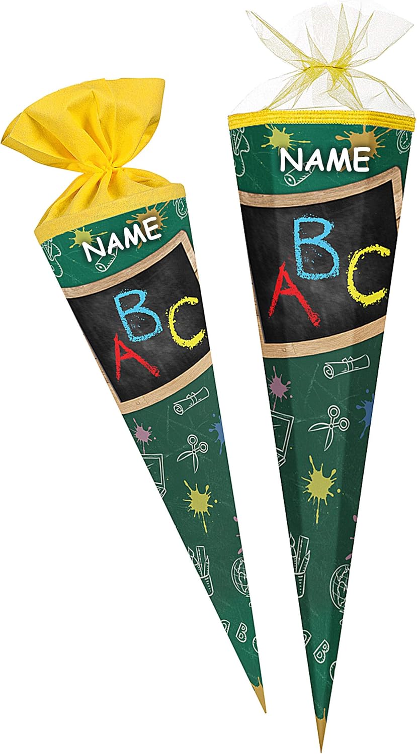 con bellissimo effetto 3D - stampa GLITTER e mica!! ____ stabile e di alta qualità - cono scolastico - lungo 50 cm (misurato solo il cartone) ___ il bordo superiore ha una finitura in tulle ___ Forma: ROTONDO ___ Motivo: "Lavagna scolastica / lavagna - lettere ABC" l'ATTENZIONE: ______ Il vostro cono scolastico individuale ___ compreso: individualmente con il vostro NOME DESIDERATO - il nome è fatto su misura ___ la richiesta del nome viene effettuata - AUTOMATICAMENTE entro 4 ore - per favore NON prima Invia un messaggio ___ incluso un grande effetto 3D in colore coordinato _ fiocco - questo renderà il tuo cono scolastico ancora più accattivante ______ la consegna dei bellissimi modelli di fiocchi è mista (puoi vedere esempi nelle immagini) made in Germany! __ Materiale: cartone rivestito e di alta qualità - SUPER stabile! - idrorepellente! __ fantastici colori di stampa!_____ OPZIONALE è disponibile una punta in plastica abbinata, trasparente e solida da attaccare (questo rende la punta del cono scolastico molto stabile e stabile) ---- (questo articolo deve essere ordinato EXTRA al cono scolastico) e come extra: IL LOOP individuale con il nome DESIDERATO - aggiungi semplicemente l'articolo "nome desiderato" come extra nel carrello, il nome verrà poi applicato al fiocco