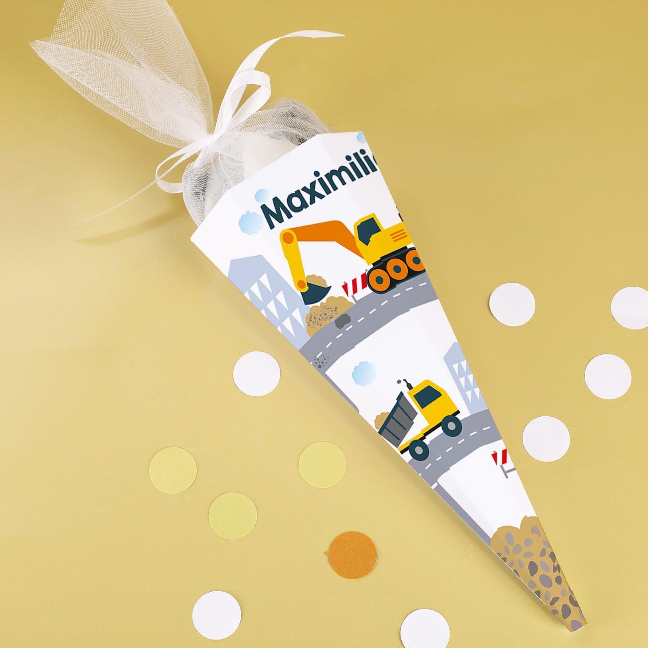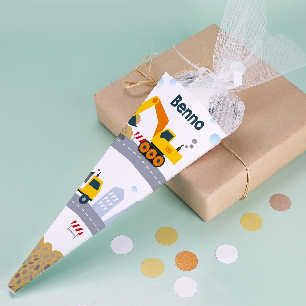 Inizia le tue giornate scolastiche con una grande busta di zucchero: questo rende il viaggio in classe ancora più piacevole! Questo esempio di cono scolastico è stampato con un cantiere tutt'intorno; puoi vedere un camion con cassone ribaltabile e un escavatore. Il nome di tuo figlio verrà posizionato sopra la pala dell'escavatore. Il risultato è un cono scolastico molto individuale che ti farà sicuramente sorridere. Una volta riempita, la bustina di zucchero può essere facilmente chiusa con una striscia di tulle nella parte superiore. In questo modo, tutte le cose rimangono riposte al sicuro finché non vengono disimballate! Il cono scolastico esagonale è alto 80 cm e ha un diametro di 26 cm all'apertura ed è stampato con inchiostro ecologico.