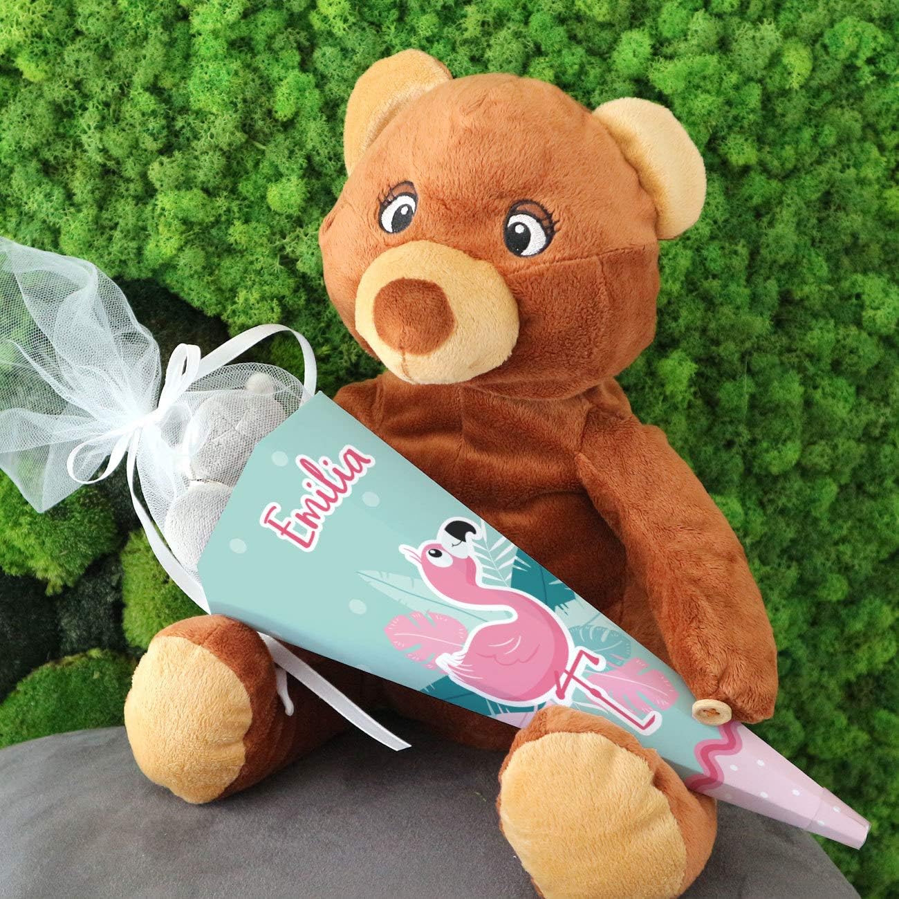 Per iniziare orgogliosamente la scuola: questo cono di zucchero in rosa e turchese ha sul motivo un animale molto speciale! Il fenicottero corre felice sulla borsa, mentre il paesaggio è decorato con grandi foglie rosa e turchesi. Sopra il fenicottero, sul cono della scuola, è ben visibile il nome del titolare della scuola. Per garantire che tutti i regali per l'inizio della scuola siano imballati in modo sicuro, la parte superiore del cono scolastico è rivestita di tulle bianco, che può essere legato con una striscia di tulle. Per un inizio scuola buono e motivato!