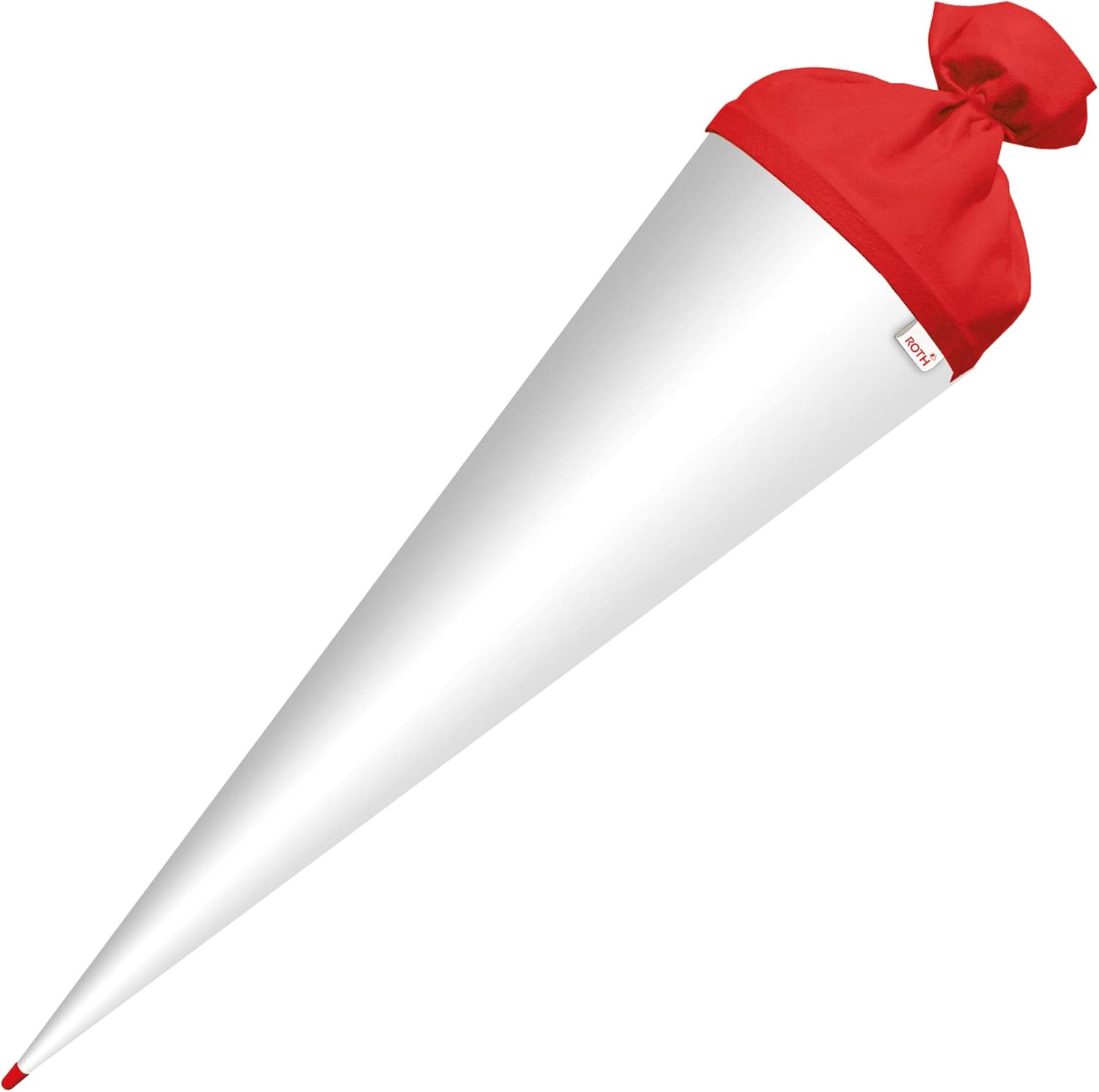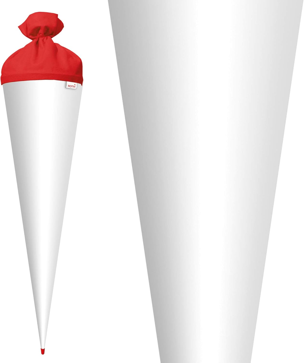 Cono scolastico artigianale di alta qualità per ragazze e ragazzi. Il cono scolastico bianco è alto 70 cm e rotondo. Chiusura in feltro rosso. Per il fai da te, dipingere e incollare. Prodotto di qualità della ROTH in Sassonia
