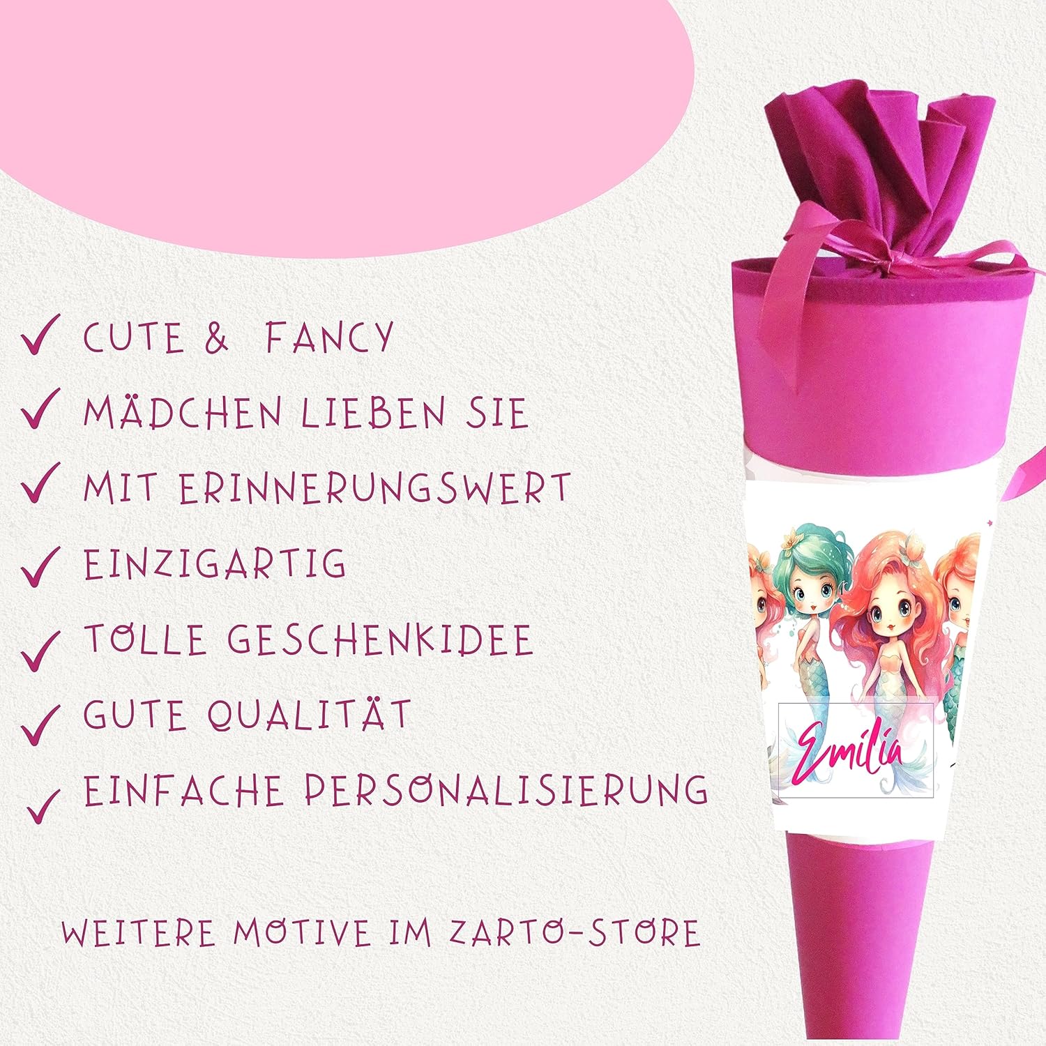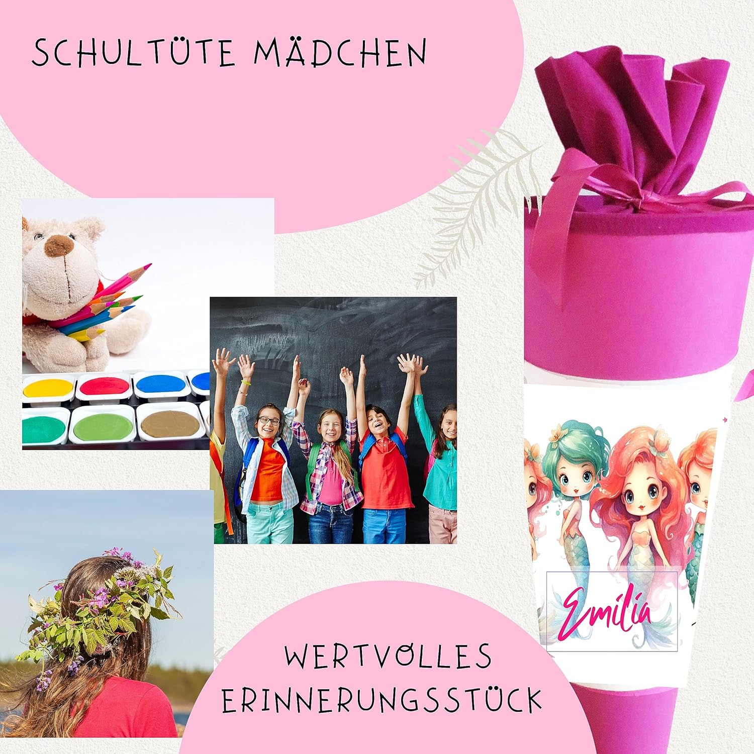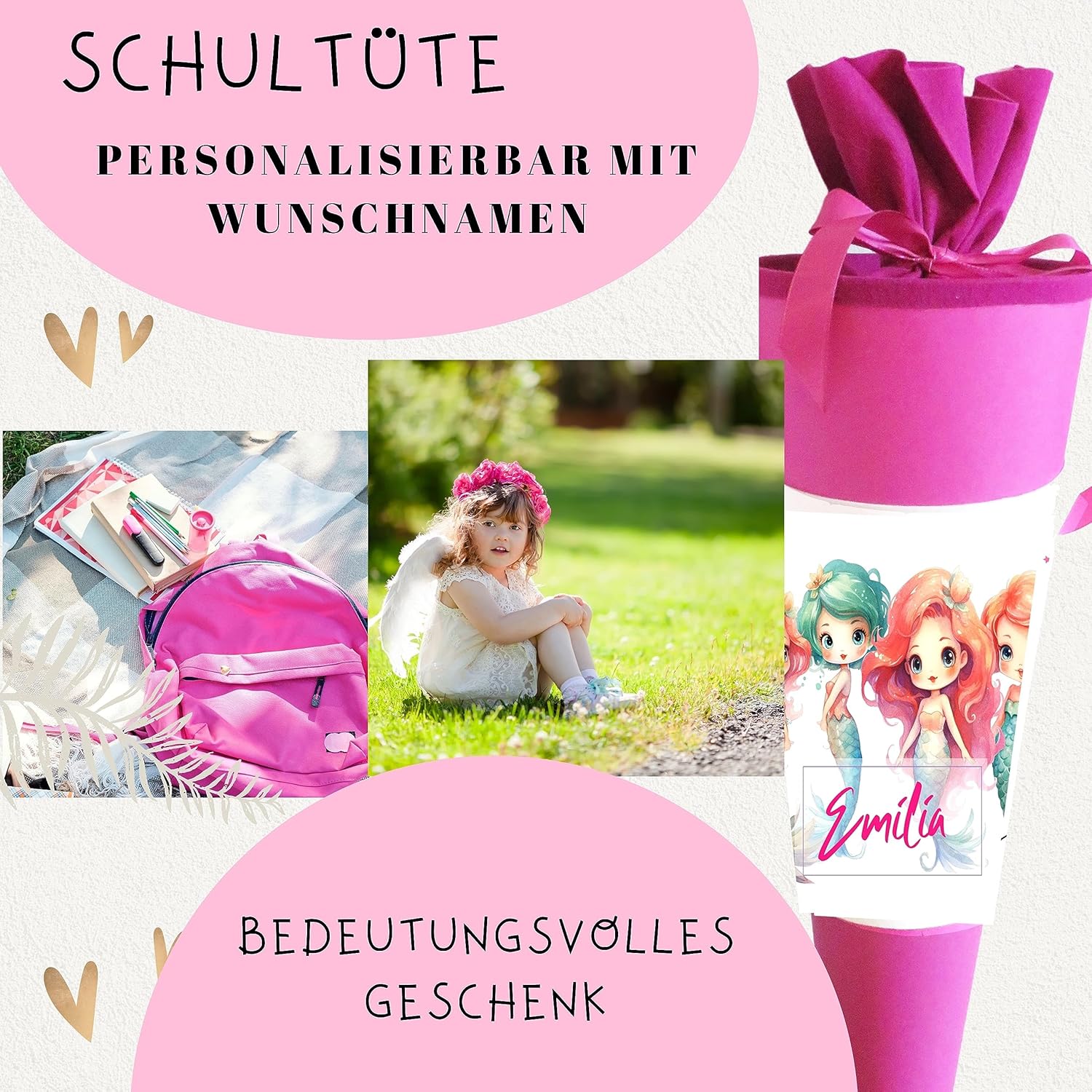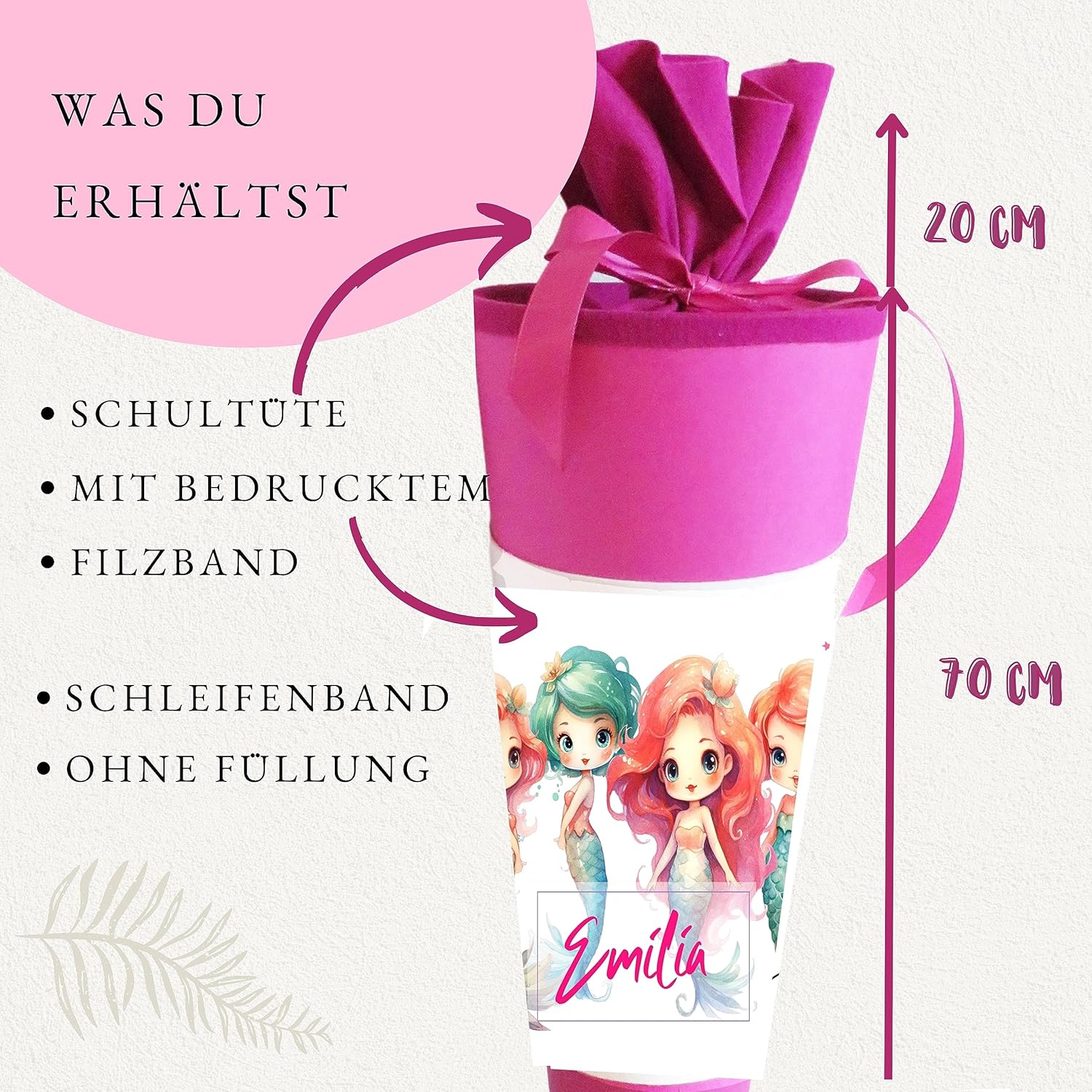Cartella scolastica personalizzata per ragazze: Immergiti nel fiabesco mondo sottomarino con la nostra borsa scolastica personalizzata per ragazze con motivo a sirena! Un regalo che trasformerà il ritorno a scuola in un'avventura magica e farà risplendere l'immaginazione della tua ragazza. UNA SIRENA CHE SI CHIAMA...: personalizza il cono della scuola con il nome della tua ragazza e trasformalo in uno scrigno di tesori unico che cattura i suoi sogni e desideri. La sirena ti accompagnerà nel tuo viaggio e regalerà momenti indimenticabili. MOMENTI FAVOLOSI: il motivo della sirena incarna la grazia, la libertà e la magia del mondo sottomarino. Il nostro cono scolastico personalizzabile non è solo un regalo, ma un simbolo del potere di realizzare i tuoi sogni e rimanere fedele a te stesso. Con il nome desiderato – Realizziamo questi coni scolastici individualmente a mano. Stampiamo l'etichetta in feltro con il nome desiderato, cuciamo insieme il nastro e lo fissiamo sul cono della scuola. Lo zaino viene quindi avvolto con amore e parte per il suo viaggio. UN INIZIO SCUOLA INDIMENTICABILE: regala alla tua ragazza un inizio scuola pieno di magia delle sirene! Con il nostro cono scolastico personalizzabile si sentirà una vera sirena e presenterà con orgoglio il suo cono scolastico. Crea con noi momenti magici che saranno ricordati per sempre! Fornitura: zaino per la scuola in cartone con etichetta in feltro e nome desiderato / chiusura strisce di feltro da 20 cm / altezza ca. 70 cm/nastro - SENZA IMBOTTITURA