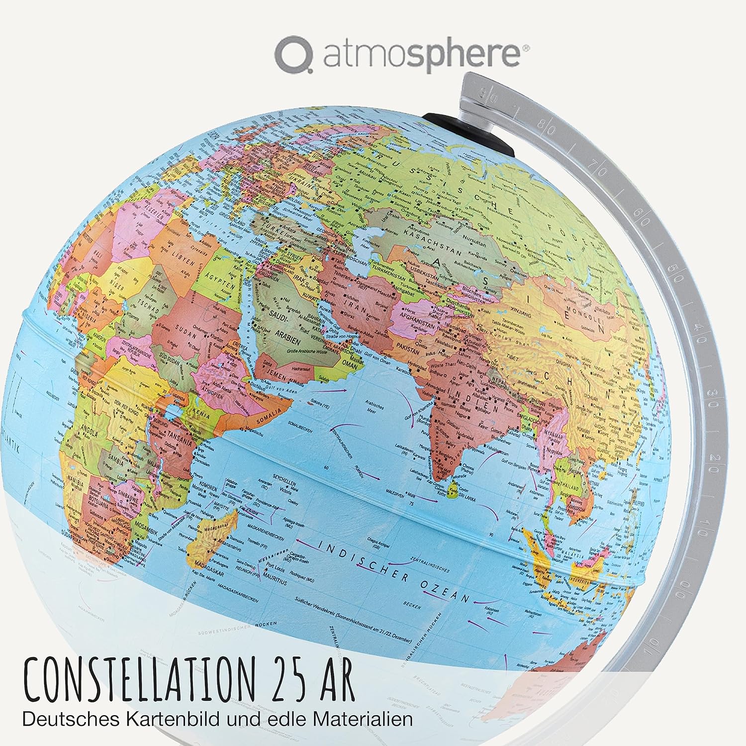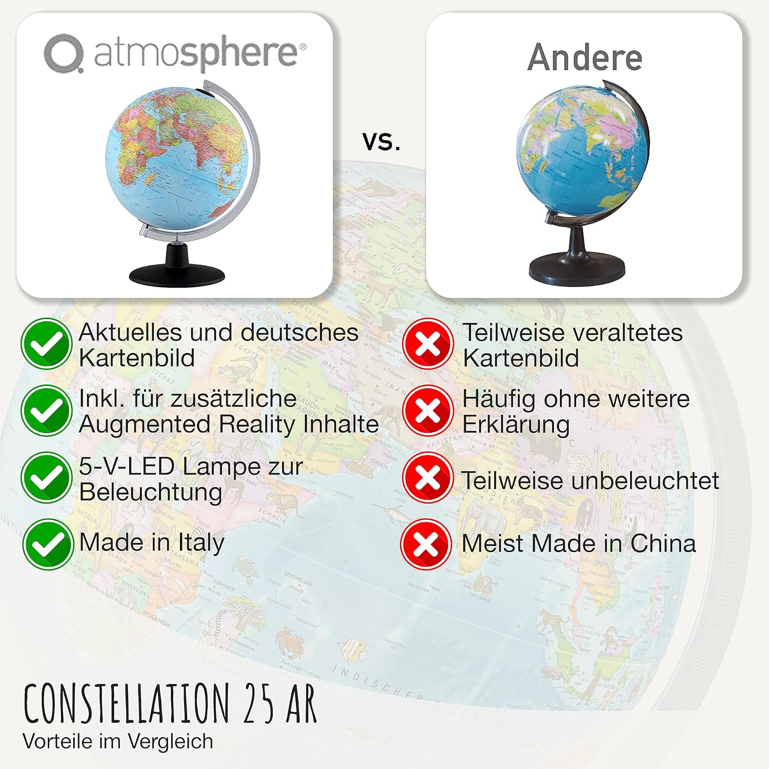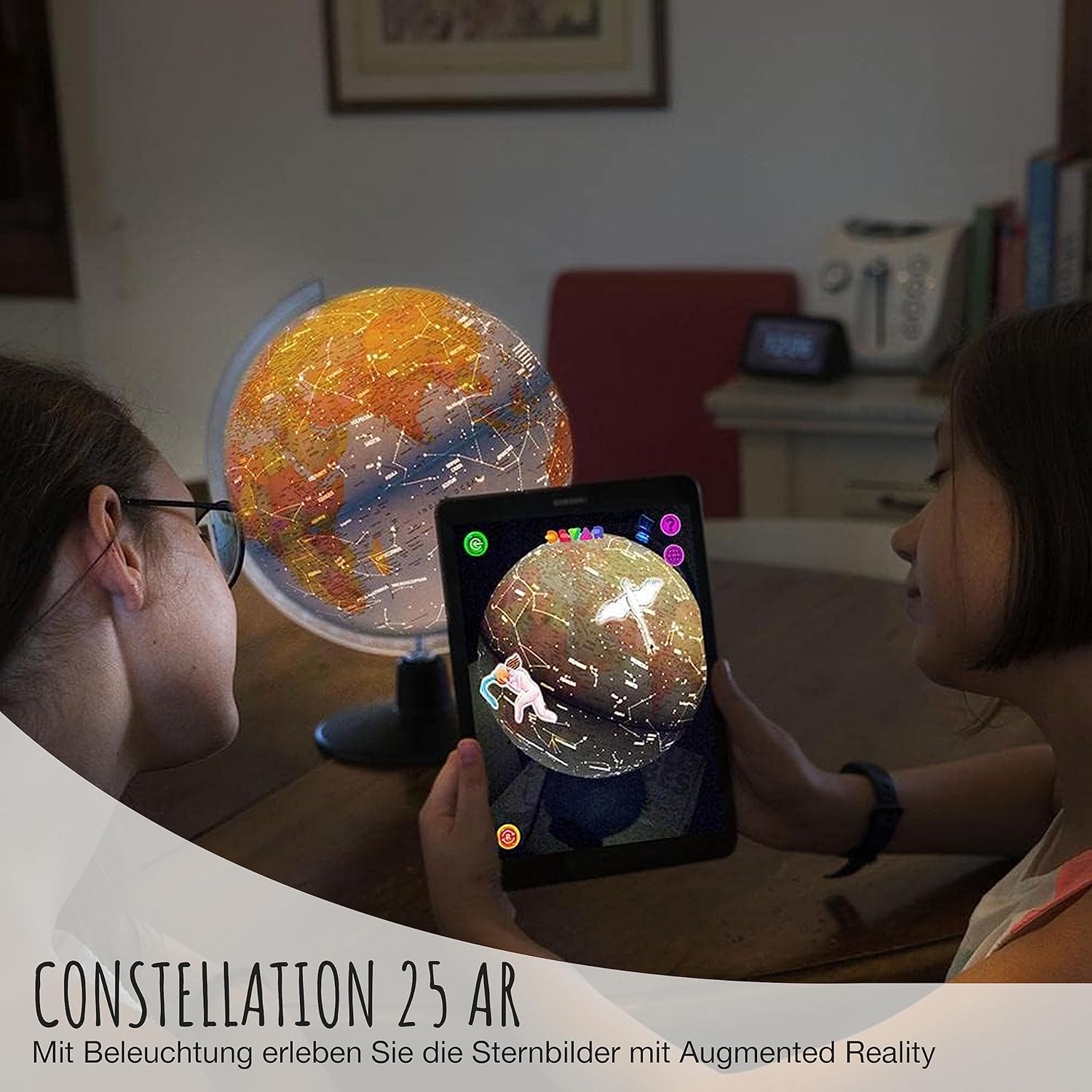 🌍 SCOPRI E IMPARA - Mappamondo interattivo per adulti e bambini appassionati di geografia e astronomia e vogliono scoprire il mondo delle stelle. Con un diametro di 25 cm e un'altezza di 30 cm, ha dimensioni compatte. 🌍 IMMAGINE DEL GLOBO DEL MONDO E DELLE STELLE - Accendi la luce per far brillare il globo e osserva le costellazioni nel cielo ruotare attorno all'asse terrestre. A luci spente, il mappamondo presenta la cartografia politica attuale con etichette in tedesco. 🌎 CON APP PER LA REALTÀ AUMENTATA - Scarica l'app “GlobeARound Constellation”, recentemente sviluppata nel 2024, su uno smartphone o tablet. La nuova app offre contenuti ancora più interessanti. Usalo per mirare alle costellazioni e approfondire la tua conoscenza con contenuti di realtà aumentata. 🌏 RISPARMIO ENERGETICO E LED LUMINOSO - Con la lampada LED interna da 5 V alimentata da un cavo USB, il globo luminoso diventa una lampada decorativa da scrivania o da comodino. Illumina la sfera e crea un'atmosfera magica per ammirare la terra anche al buio. Fornitura: con cavo USB, senza alimentatore. 🌎 QUALITÀ DALL'ATMOSFERA Q - Le più recenti tecniche di produzione e materiali pregiati vengono utilizzati per offrire una qualità convincente con un interessante rapporto qualità-prezzo. Il globo soddisfa i più alti standard di sicurezza e qualità. Guarda tu stesso.