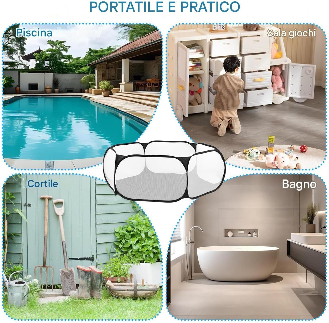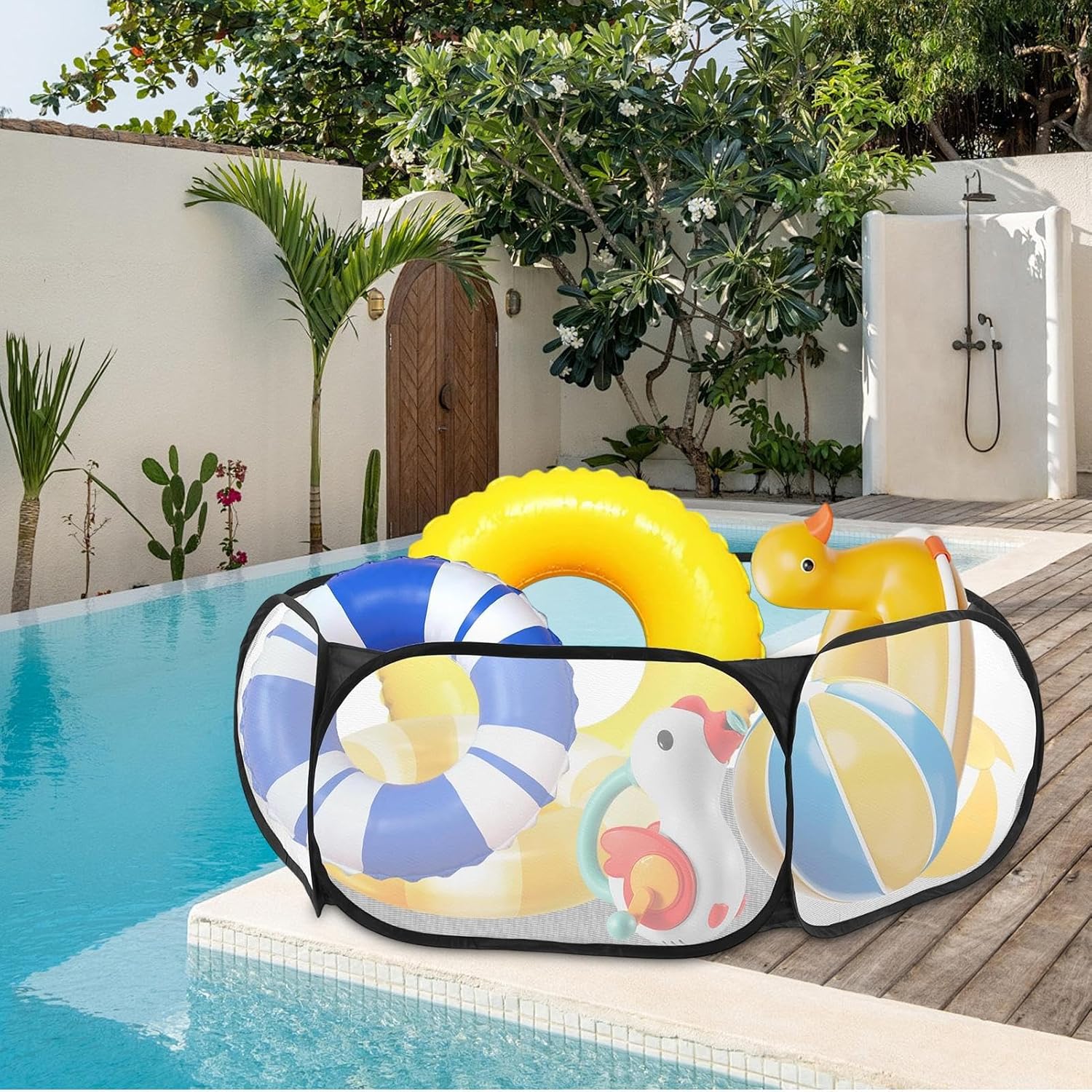 Occasioni Multiple: Essenziale per parchi acquatici e vacanze balneari, migliora l'esperienza in piscina domestica. Gestisci gonfiabili in modo affidabile con funzionalità intuitive per tutte le esigenze ricreative. Praticità d'uso: Integra un a scomparsa automatica e supporto elastico per maneggevolezza ottimizzata degli oggetti acquatici consentendo organizzazione ordinata e accesso rapido attraverso funzionamento immediato e coerente Soluzione Massimizzata Stoccaggio: Offre area generosa per conservare multipli accessori da piscina in sicurezza, prevenendo disordine e mantenendo aspetto pulito e organizzato per utilizzo pratico Tessuto a Rapida Asciugatura: Il contenitore utilizza mesh traspirante a rapido essiccamento per migliorare il ricircolo d'aria e accelerare l'evaporazione 'umidità durante la conservazione Risparmio spazi: Progetto pieghevole assicura portabilità senza sforzo e capacità di archiviazione immediata, permette di organizzare gonfiabili mantenendo l'area bagno ordinata e libera da ingombri