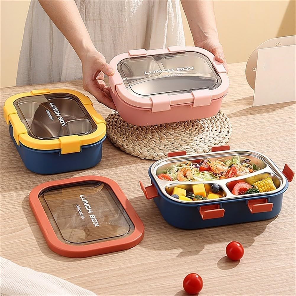 Design a prova di perdite: ogni scomparto di questo portapranzo in acciaio inossidabile è completamente sigillato per mantenere i pasti freschi e separati, eventuali fuoriuscite durante il trasporto. Aspetto alla moda: con un esterno luminoso, questo contenitore per il pranzo combina stile contemporaneo con praticità, rendendolo un'ottima scelta per scuola, lavoro o attività all'aperto. [Tre scomparti] Perfettamente progettato per chi ha appetiti più piccoli, contiene facilmente frutta, panini e pasti leggeri attraverso i suoi tre scomparti. Facile da pulire: il vassoio rimovibile in acciaio inossidabile è lavabile in lavastoviglie per una pulizia senza problemi. Quattro chiusure laterali sicure, il coperchio rimane ben chiuso ma consente un facile accesso. Design facile da usare: realizzato per comodità; si prega di ricordare che il vassoio in acciaio inossidabile non è adatto per l'uso nel microonde.