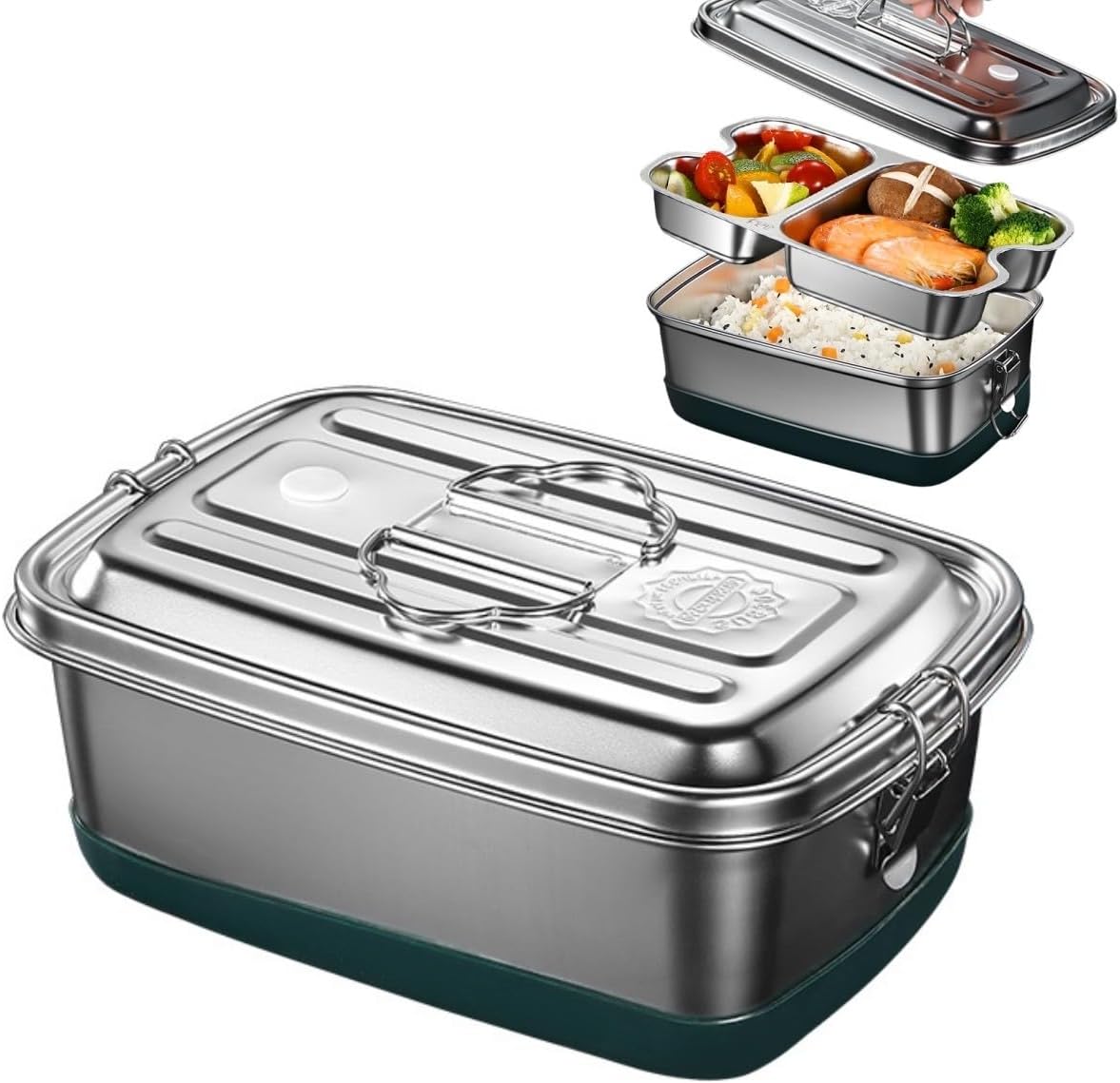 Materiale in acciaio inox: realizzato in acciaio inossidabile 304, questo portapranzo offre un'eccezionale longevità ed è resistente alla ruggine, sicurezza alimentare e durata per l'uso quotidiano. Scomparti regolabili per la preparazione dei pasti: il divisore rimovibile consente di personalizzare l'organizzazione dei pasti, mantenendo il cibo separato per mantenere il sapore e il valore nutrizionale. Design a prova di perdite: con una fibbia sicura e un anello di tenuta in silicone integrato, questo contenitore previene efficacemente le perdite, rendendolo per il trasporto senza disordine al lavoro o a scuola. Facile da pulire: l'esterno liscio in acciaio inossidabile resiste alle macchie e può essere pulito senza sforzo a mano, fornendo comodità per stili di vita frenetici. [Compatto e portatile] Il suo design a doppio strato massimizza la capacità di archiviazione pur rimanendo leggero, perfetto per i pasti in viaggio, sia in ufficio, a scuola o attività all'aperto.