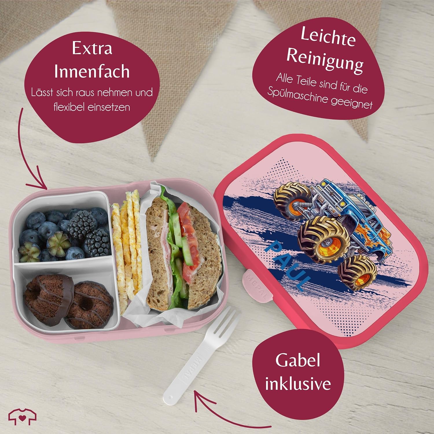 Perfetto per ogni occasione: vuoi regalare un regalo davvero speciale questa volta? Oppure stai cercando "monster truck rosa"? Sorprendi i tuoi piccoli con il regalo giusto per questo evento e rendili felici con il nostro design. Regalo per bambini o appassionati di monster truck: stai cercando un "portapranzo con nome rosa" per fare un regalo al tuo protetto o ai tuoi figli? Allora questo fantastico motivo sarà un vero successo! La combinazione di Monster Truck e nome desiderato è qualcosa di molto speciale e completa il look divertente. Con questo motivo attirerai sicuramente l'attenzione e farai brillare tutti. Motivo con testo a scelta: i regali personalizzati sul tema Monster Truck sono particolarmente apprezzati. Realizzato su misura per i tuoi desideri, questo fantastico design con un monster truck e il nome desiderato è perfetto per il tema del monster truck. Rendi davvero felici i tuoi piccoli con questo motivo originale con il testo desiderato! Inserto Bento: questo bellissimo contenitore per il pranzo per bambini consente di separare il cibo grazie all'inserto Bento rimovibile e può quindi essere utilizzato in diversi modi. Che si tratti del classico pranzo o della frutta fresca e secca per la scuola, grazie agli scomparti tutto rimane fresco e appetitoso. Forchetta snack: il contenitore per il pranzo ti invita a gustare un'ampia varietà di cibi con la piccola forchetta snack. Il contenitore per snack non è adatto al microonde. Per riscaldare il cibo è quindi necessario toglierlo dal contenitore del pranzo