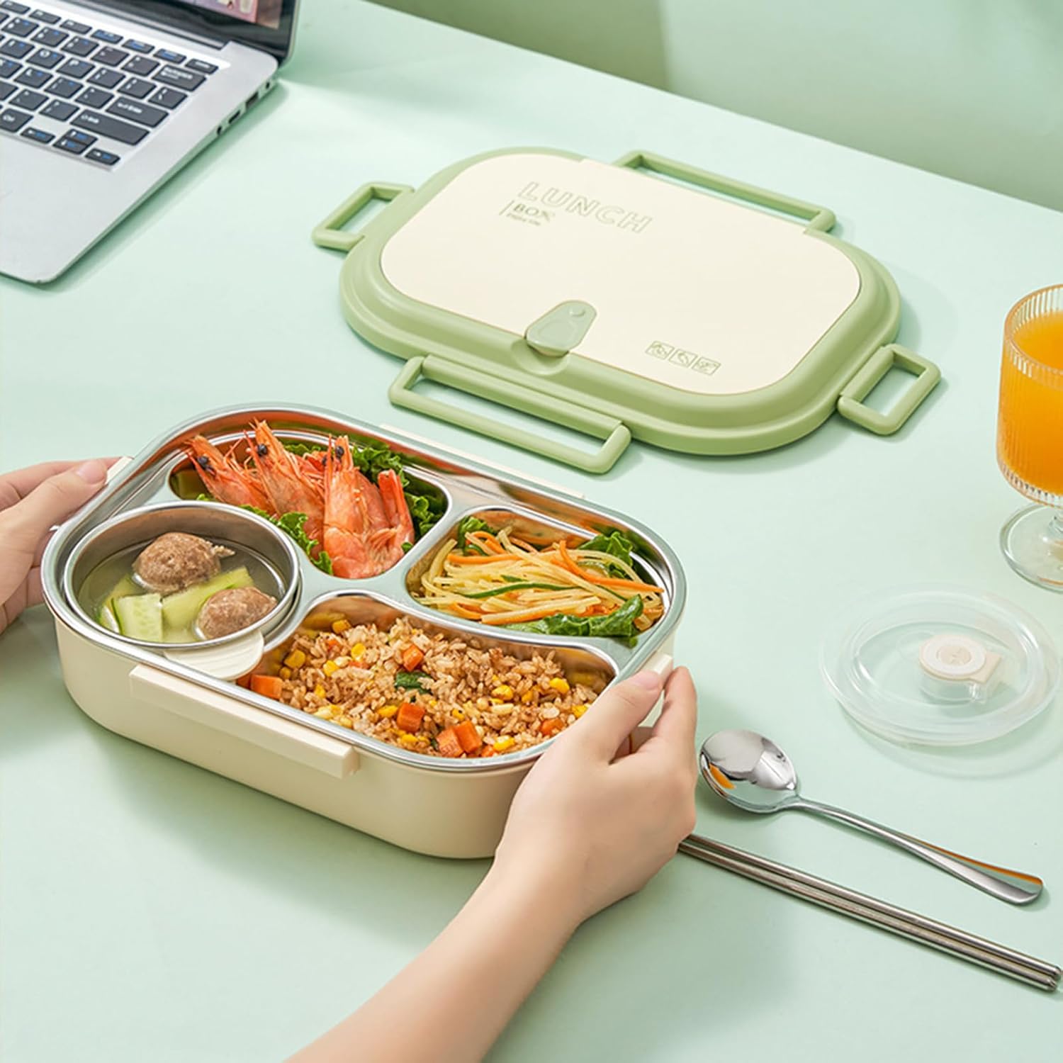Pratico stoccaggio: i contenitori per il pranzo in acciaio inossidabile offrono una suddivisione intelligente con 4 o 5 scomparti per separare gli snack a prova di gusto per la scuola o l'ufficio. La pratica porzionatura mantiene il cibo fresco e organizzato tutto il giorno, ideale per i viaggi Posate aggiuntive incluse: questo contenitore per il pranzo in acciaio inossidabile ti farà risparmiare il trasporto di posate separate, poiché sono inclusi un cucchiaio e le bacchette. Gli angoli arrotondati ben progettati consentono una pulizia rapida e accurata, aumentando la versatilità per la preparazione e il trasporto dei pasti. Struttura robusta: realizzato in acciaio inossidabile 304 e PP, questo contenitore per il pranzo in acciaio inossidabile è sicuro, sano e privo di sostanze nocive. Le proprietà antiruggine e resistenti all'usura li rendono e forniscono una soluzione affidabile per la conservazione quotidiana dei pasti al lavoro o a scuola e promuovono abitudini ecologiche. Riscaldamento flessibile: questo contenitore per il pranzo in acciaio inox per bambini consente il riscaldamento tramite piastra riscaldante o bagno di acqua calda per mantenere il cibo in modo ottimale. Il design adatto al microonde semplifica ulteriormente il riscaldamento. Ideale per gite in famiglia e uso scolastico quotidiano. Chiusura sicura: il contenitore in acciaio inox a prova di perdite garantisce una protezione affidabile contro le perdite grazie al suo anello di tenuta in silicone e ai quattro clic laterali. Ideale per zuppe, insalate o salse, per evitare che si sporchi nella borsa o nel bagagliaio durante il pendolarismo o in viaggio.
