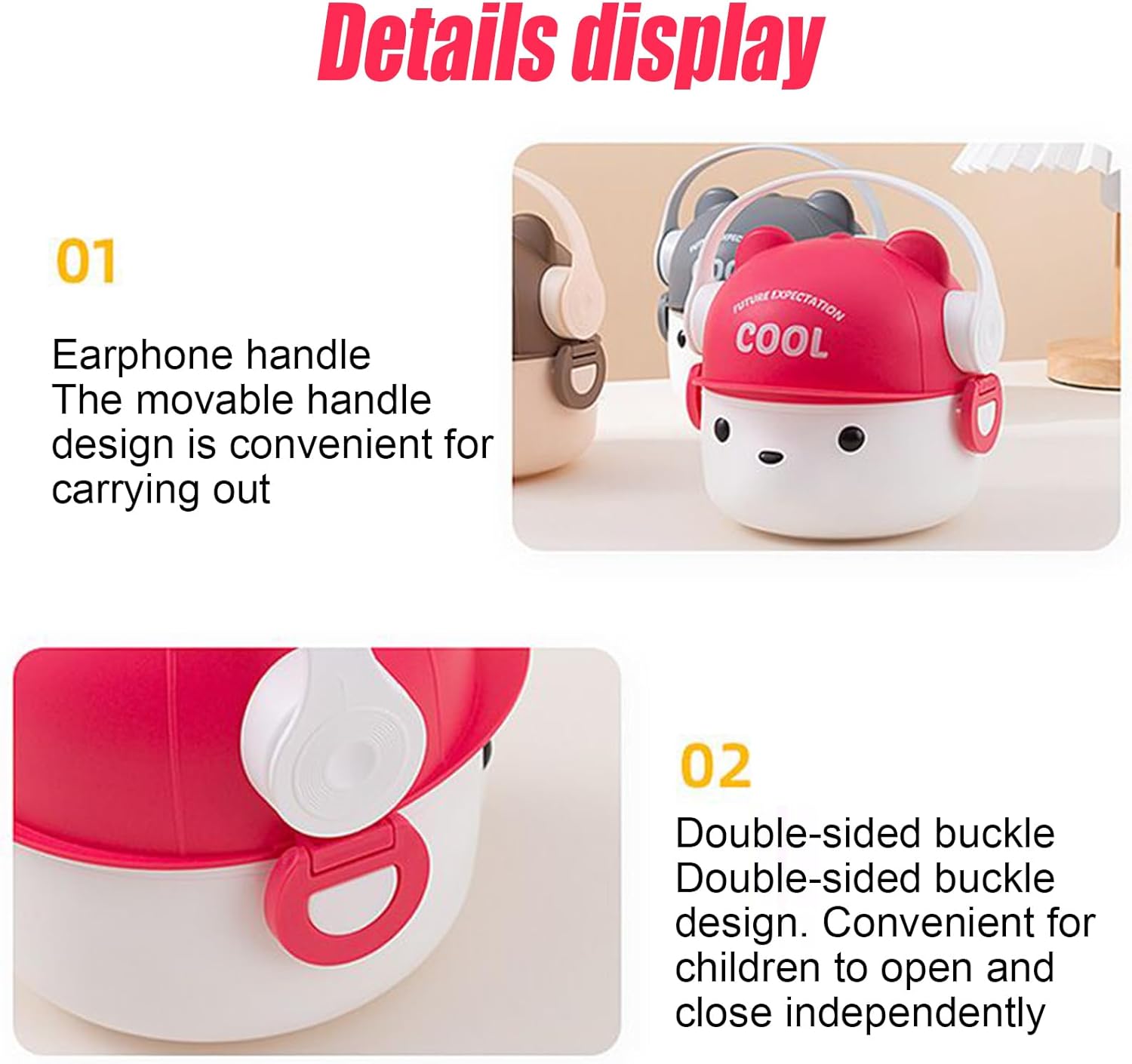 Design orientato ai giovani: progettato con un approccio orientato ai giovani, questo portapranzo per bambini combina un vivace trasportino e un tipo unico, rendendo i pasti deliziosi e visivamente accattivanti per i bambini Isolato e facile da pulire: il portapranzo combina proprietà resistenti alla temperatura con isolamento a doppio strato e un nucleo in acciaio inossidabile, garantendo una conservazione inodore e una facile pulizia grazie al suo design facile da pulire Porzioni di cibo versatili: progettata con un layout anti-miscelazione, la scatola per il pranzo partizionata organizza la preparazione dei pasti in porzioni versatili, preservando gusti e trame distinti per le preferenze di ogni bambino Design business-friendly: una soluzione che fa risparmiare tempo con riscaldamento istantaneo per i contenitori per il pranzo dei bambini, progettata per l'uso diretto al microonde, rendendolo adatto alle aziende e uno studente necessario per stili di vita frenetici Trasporto sicuro e organizzato: dotato di un meccanismo a scatto e di una guarnizione a prova di fuoriuscite, questo portapranzo per bambini garantisce prestazioni resistenti agli urti per evitare perdite durante i viaggi o l'uso quotidiano, mantenendo i pasti ben tenuti e organizzati per i bambini attivi all'aperto