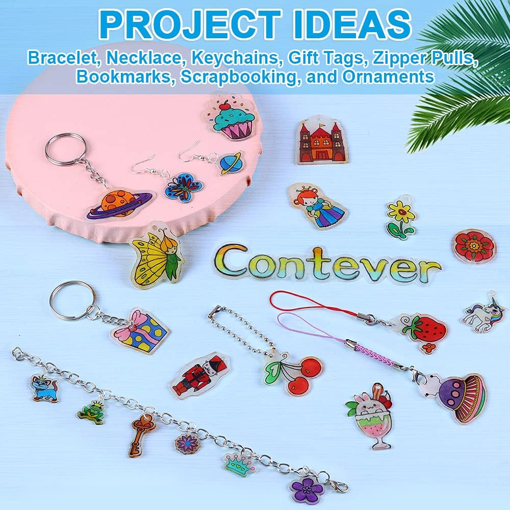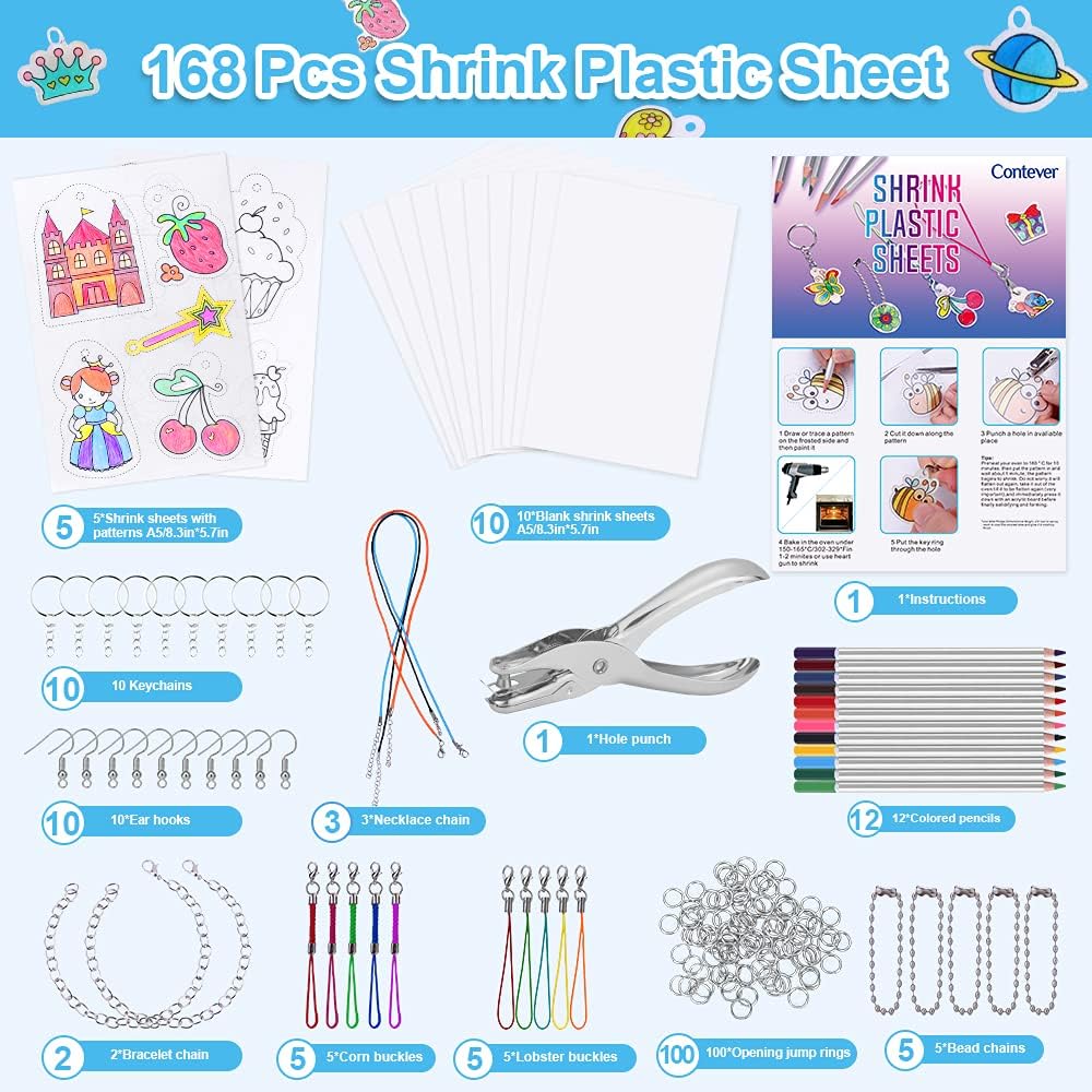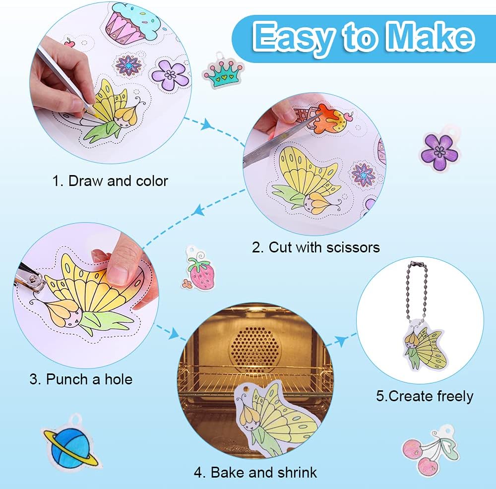 【REGALI FATTI A MANO】Kit di fogli di shrink plastic sono la scelta perfetta per i regali di compleanno dei bambini, molto adatti alle famiglie e ai bambini per creare insieme e godersi il tempo genitore-figlio e il divertimento artigianale. This educational toy is perfect for both boys and girls age at 6 7 8 9 10 11 12 13. Questo è l'ideale per promuovere le relazioni genitore-figlio e i regali dei bambini. 【FACILE DA USARE】Il film termoretraibile colorato è vuoto, puoi progettare il tuo modello preferito su di esso. Disegna motivi sulla superficie ruvida della plastica carta termoretraibile, colora, ritagliare e praticare un buco, cuocere in forno o soffiatore ad aria calda. L'oggetto verrà ridotto al 20% della sua dimensione originale. Questo è davvero interessante! 【ISPIRA LA CREATIVITÀ】Realizzando giocattoli di carta shrink artistica, i bambini hanno migliorato le loro abilità pratiche durante il processo di disegno e carta tagliata.Kit di carta plastica termoretraibile giocattoli offre un divertimento illimitato ai bambini e può stimolare completamente la loro immaginazione e creatività. 【AMPIE APPLICAZIONI】I modelli sono apprezzati da adulti e bambini, come fiori, animali, astronavi, fate. Perfetto per questo foglio di shrink plastic può essere utilizzato per pendenti fai-da-te, portachiavi, gioielli, etichette regalo, segnalibri e ornamenti ecc. 【PLASTICA TERMORETRAIBILE KIT】Include 5 fogli termoretraibili con motivi,10 fogli termoretraibili vuoti,1 Istruzioni,12 matite colorate, 10 Cerchio chiave,5 catene di perline,100 Anelli di salto di apertura,1 Istruzioni,1 perforatore,10 Ganci per le orecchie,5 fibbie di mais,5 Fibbie per aragosta,2 Catena del braccialetto,3 Catena per collana. Il plastica termoretraibile contiene una varietà di accessori per soddisfare le esigenze creative.