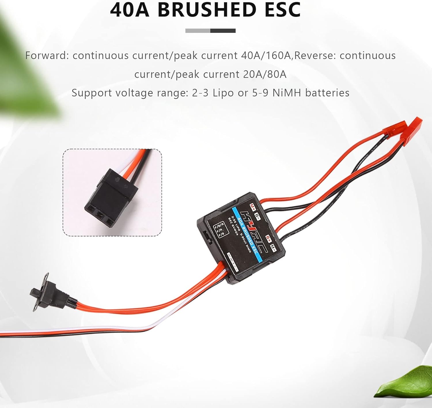 2 batterie al litio o 6 nichel idrogeno: motore di dimensioni 280, 370 o 380 RPM è inferiore a 30000 @ 7,2 V Uscita BEC: 3 A/6 V (modalità regolatore a commutazione) Batteria al litio a 3 celle o Ni- a 9 celle: il regime motore di 280, 370 o 380 è inferiore a 20.000 a 7,2 V Supporto: motore/numero Tx Modalità di funzionamento: unidirezionale, bidirezionale, arrampicata