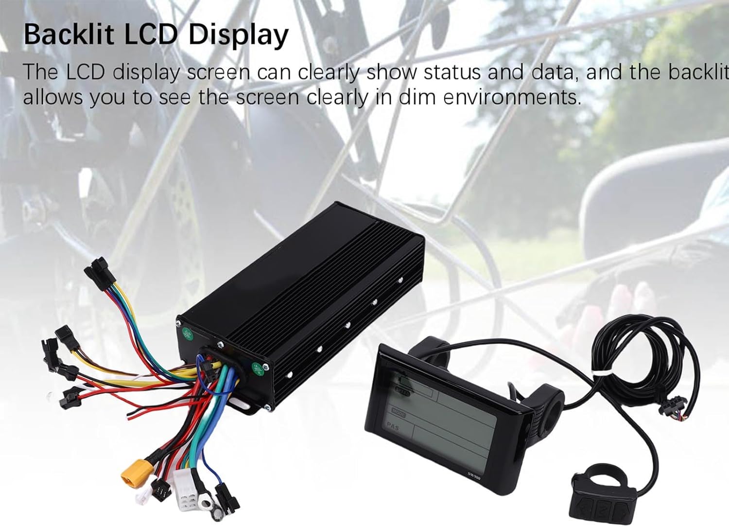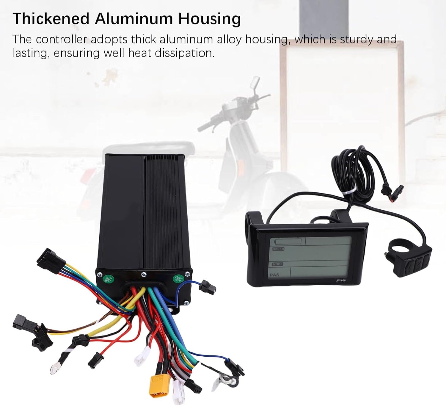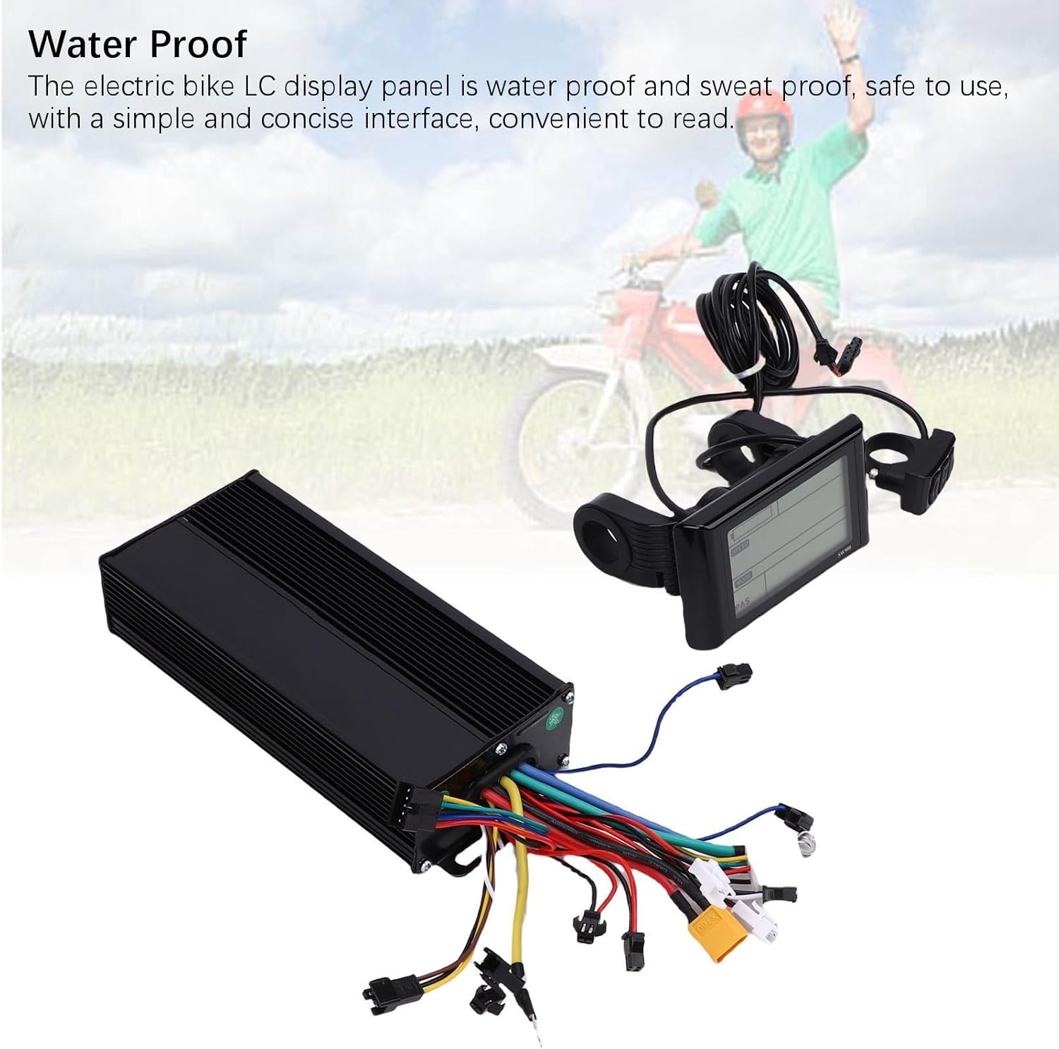 Controller a tre modalità: il controller è un controller a 3 modalità a onda sinusoidale, compatibile con motori brushless Hall e non Hall, con funzione di autoapprendimento. Ampiamente applicabile: il controller del motore è adatto per motori brushless da 36 V 1000 W, 36 V 1500 W, 48 V 1000 W, 48 V 1500 W, 52 V 1000 W e 52 V 1500 W. Alloggiamento in alluminio ispessito: il controller adotta un alloggiamento spesso in lega di alluminio, robusto e duraturo, che garantisce una buona dissipazione del calore. Display LCD retroilluminato: lo schermo LCD può mostrare chiaramente lo stato e i dati e la retroilluminazione consente di vedere chiaramente lo schermo in ambienti scarsamente illuminati. Resistente all'acqua: il display LC della bici elettrica è impermeabile e resistente al sudore, sicuro da usare, con un'interfaccia semplice e concisa, comoda da leggere.