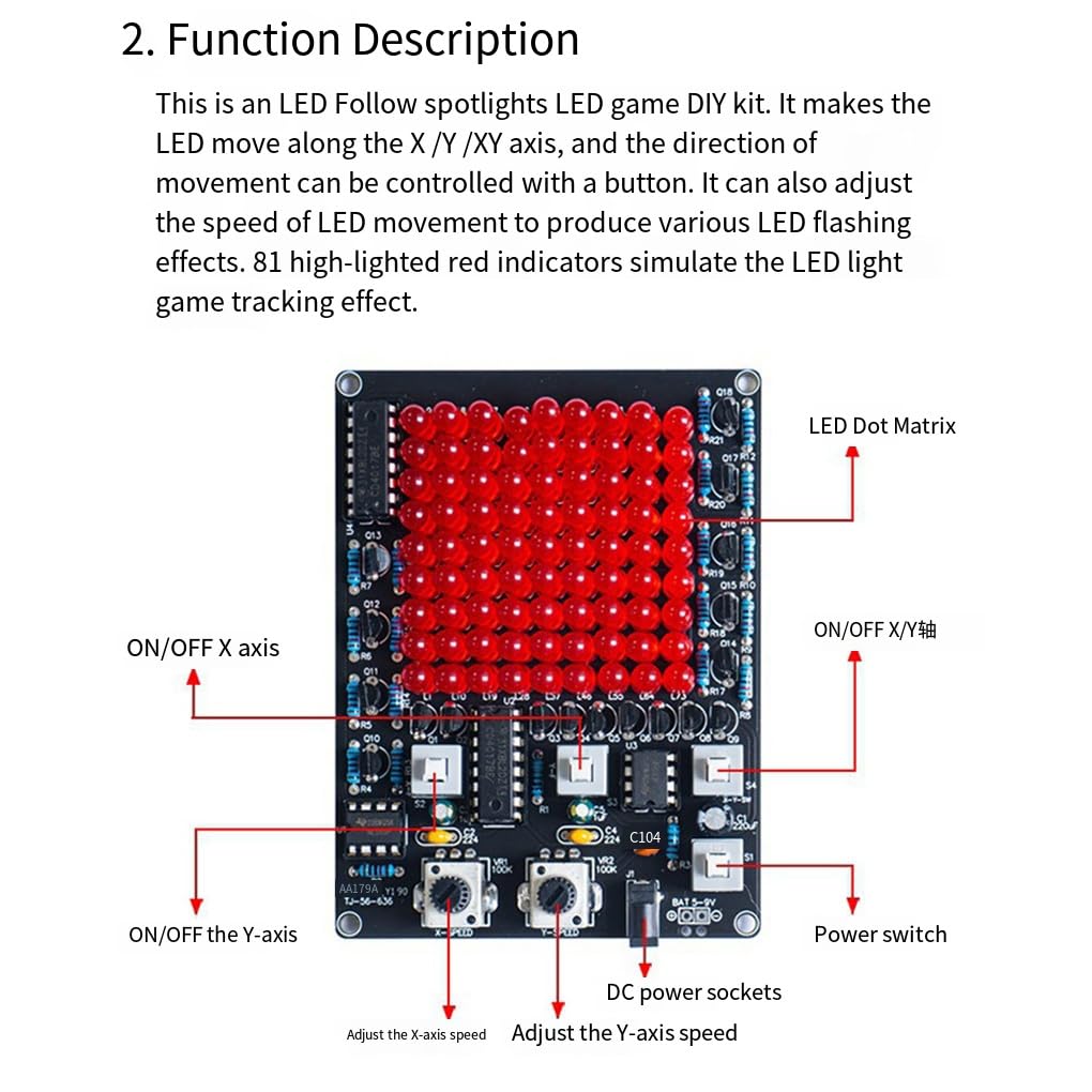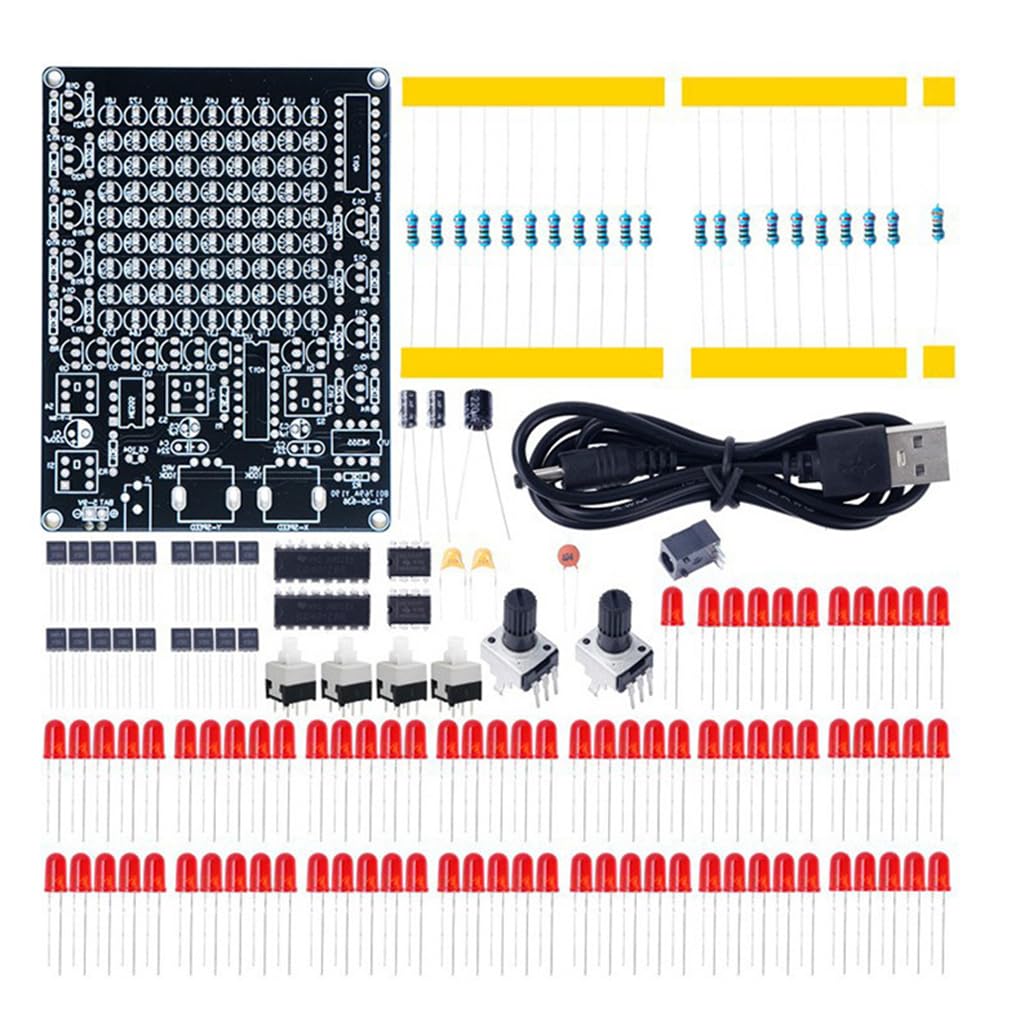 Gioco LED interattivo: questo kit elettronico LED fai-da-te ti consente di creare un gioco di faretti seguiti a LED personalizzabile. Controlla il movimento del LED lungo diversi e regola facilmente gli effetti lampeggianti Effetti LED regolabili: le parti di addestramento alla saldatura incluse in questo kit di giochi di luci a LED fai-da-te consentono effetti LED e lampeggianti regolabili. Sperimenta 81 indicatori luminosi ad luminosità per un'esperienza di gioco realistica Progetto creativo fai-da-te: il kit di saldatura per giochi di luce a LED è per gli appassionati di elettronica che desiderano migliorare le proprie capacità di saldatura. il tuo gioco LED interattivo con funzionalità mobili e regolabili Movimento LED personalizzabile: con questo kit di accessori per luci di tracciamento LED DC, puoi controllare la direzione e la velocità del movimento LED utilizzando i pulsanti. Simula facilmente il gioco per l'effetto di tracciamento Divertimento senza fine: questo kit di saldatura fai-da-te con luce di tracciamento offre ore di intrattenimento e opportunità di apprendimento per coloro che sono interessati a progetti elettronici fai-da-te. effetti lampeggianti a LED unici e migliora le tue capacità di saldatura