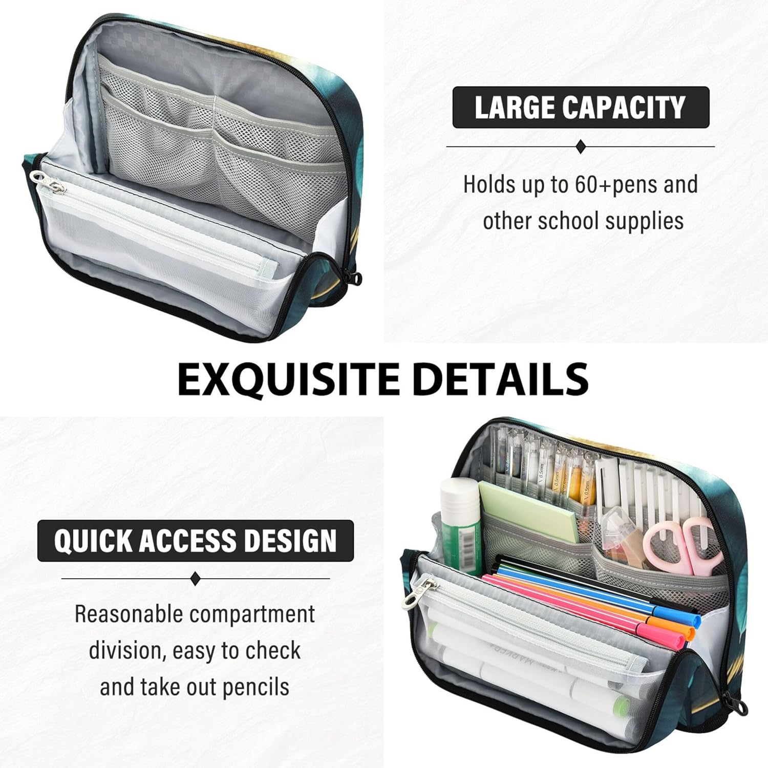 Struttura pieghevole e salvaspazio: gli astucci con cerniera utilizzano chiusure magnetiche per trasformarsi in un supporto verticale, consentendo una rapida panoramica e una disposizione ordinata di strumenti o articoli di cancelleria Materiale di alta qualità: realizzata in resistente tessuto di nylon, la cassetta degli attrezzi per insegnanti è resistente ai graffi, facile da pulire e costruita per resistere all'usura quotidiana Organizer tutto in uno: che si tratti di matite, temperamatite o foglietti adesivi, l'astuccio per ragazze ha scomparti per gestirli tutti, evitando il disordine e mantenendo le cose ordinate Un sacchetto, molti scopi: astuccio per matite per bambini passa facilmente da un astuccio per la scuola, un astuccio per il trucco o un porta attrezzi da viaggio, ideale per studenti, professionisti e creativi Opzione regalo personalizzata: disponibile in stampe vivaci con testo personalizzabile o design fotografico, i simpatici astucci sono un regalo unico per bambini, artisti o viaggiatori