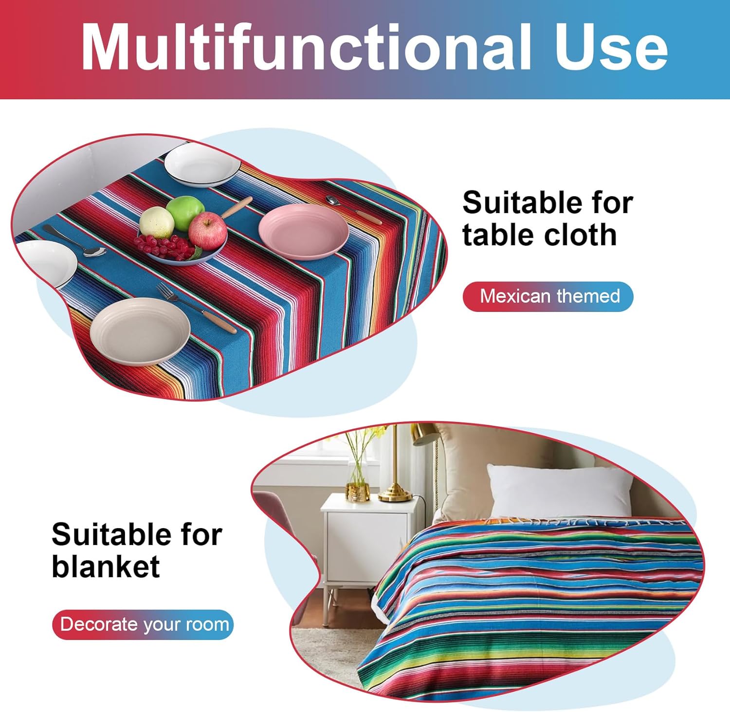 Realizzato in cotone resistente di alta qualità, facile da pulire, resistente alle macchie. È cucito su tutti e i lati, filo non facilmente allentato. Adatto per feste a tema messicano, compleanno, matrimonio, festa, ringraziamento, halloween, natale e festa tribale. 100% di zecca e di alta qualità. Tessuto a mano con motivo a strisce luminoso, decorazione di nappe con frange, stile lungo rettangolo. Multifunzione: adatto per tovaglie, da picnic, coperte, decorazioni per pareti, tavolini e qualsiasi cosa tu debba coprire.