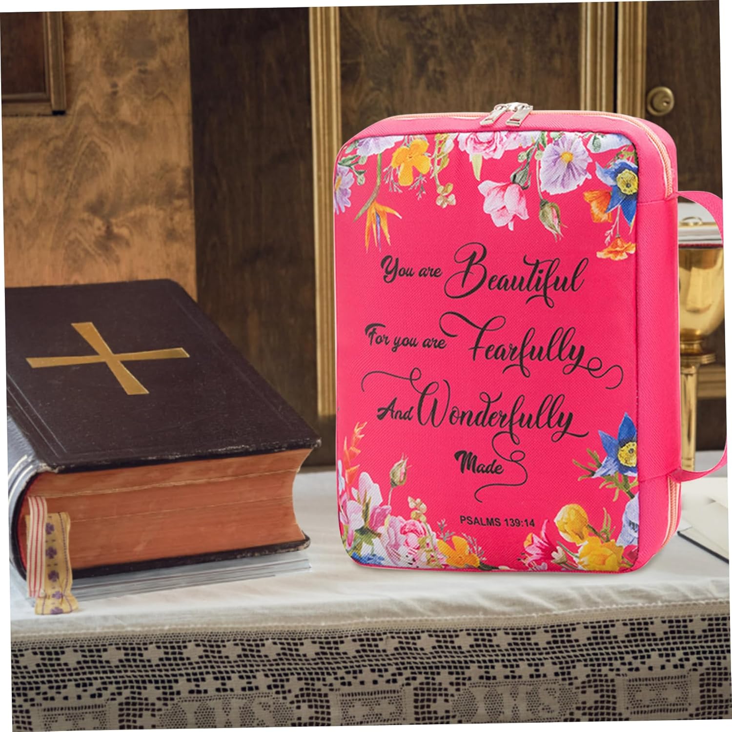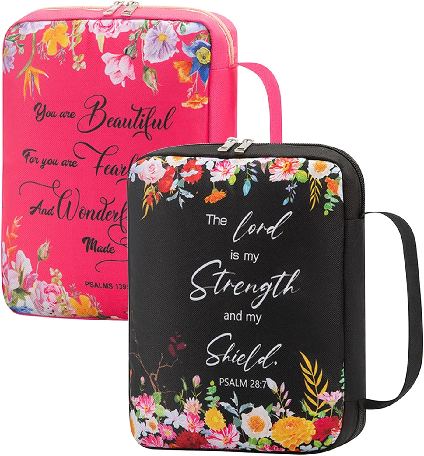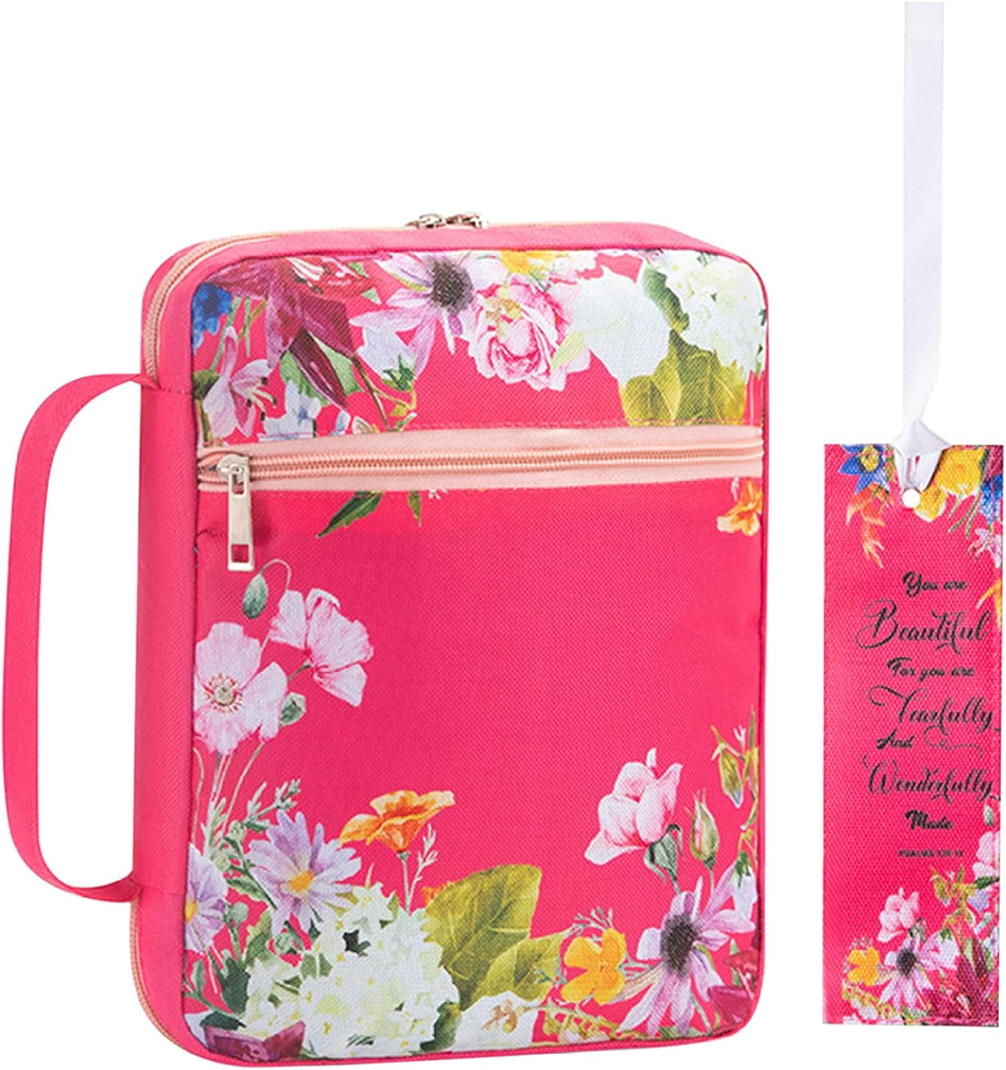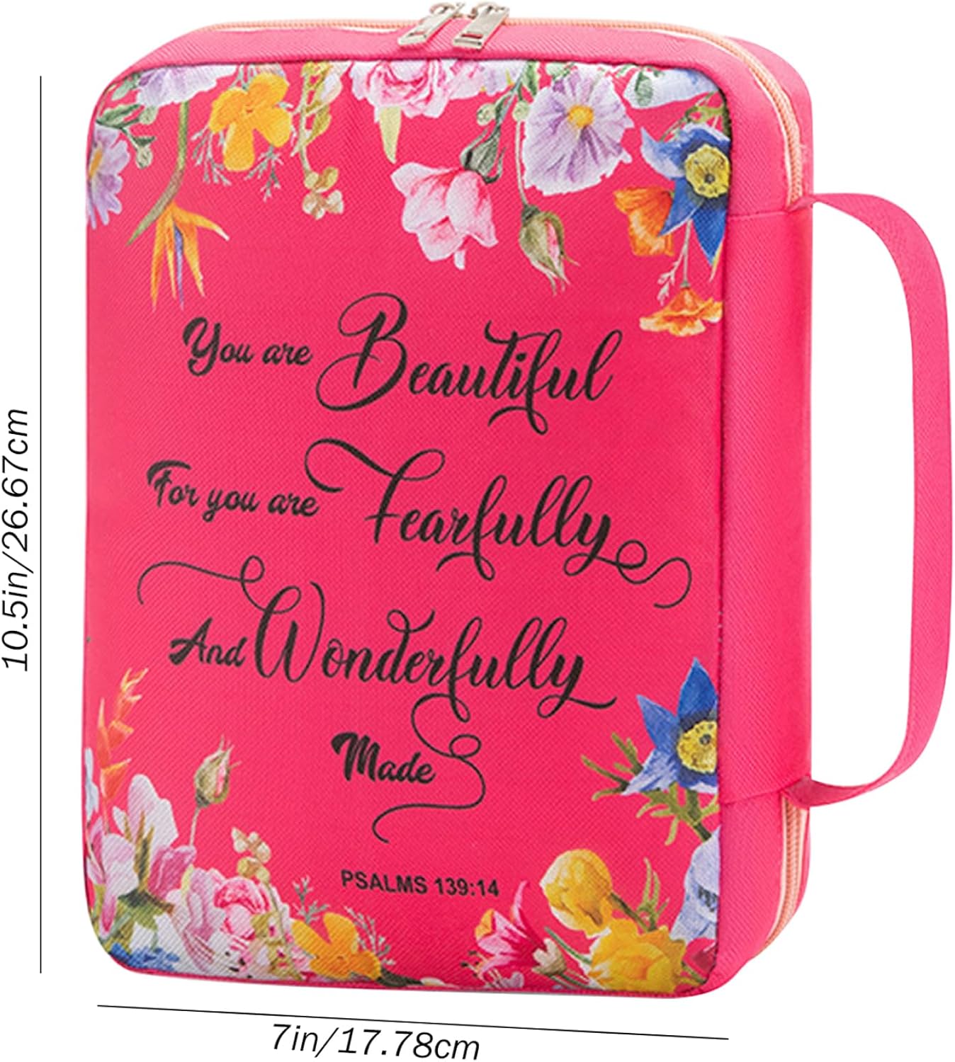 Stampa vivace: la custodia della Bibbia da donna è decorata con una vivace stampa digitale con disegni floreali e di testo. I colori sono vibranti e i motivi squisiti, rendendolo particolarmente attraente per gli utenti di sesso femminile. Comoda maniglia e segnalibro: progettata con una maniglia, la copertina della Bibbia consente un facile trasporto e trasporto. Inoltre, viene fornito con un segnalibro, che rende facile continuare a leggere o studiare la Bibbia o segnare pagine in altri materiali di lettura. Versatile e multifunzionale: oltre ad essere una custodia per il trasporto della Bibbia, può anche fungere da custodia per documenti, organizer per cancelleria, custodia per tablet, valigetta, borsa per il pranzo, custodia per cosmetici, ecc. La sua versatilità lo rende un accessorio pratico per vari scopi. Dimensioni spaziose con tasche multiple: con dimensioni di circa 7x10,5 pollici (17,78x26,67 cm), la borsa per Bibbia offre ampio spazio per riporre la tua Bibbia. Dispone inoltre di diverse tasche interne per riporre oggetti aggiuntivi come penne, opuscoli, ecc. Inoltre, è presente una tasca esterna con cerniera per riporre comodamente altri oggetti personali. Materiale per una protezione migliore: la copertina della Bibbia è realizzata in tessuto resistente e materiale Oxford, fornendo un'eccellente protezione per la tua Bibbia da polvere, umidità, macchie d'acqua e persino macchie di olio. Garantisce che il tuo prezioso libro rimanga pulito e ben conservato.