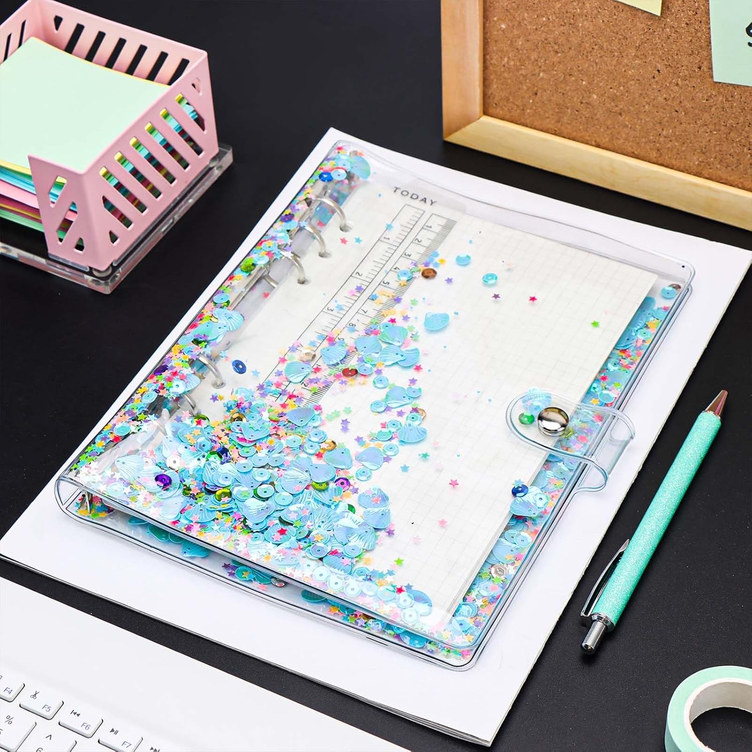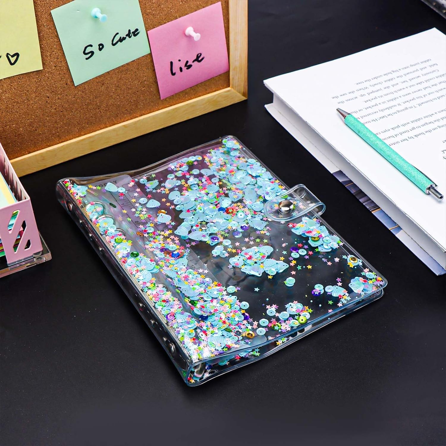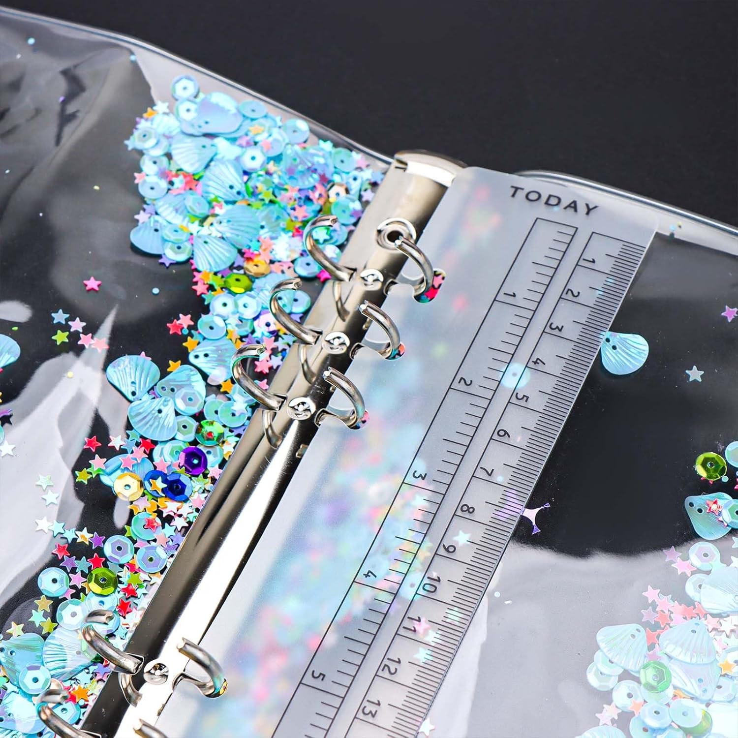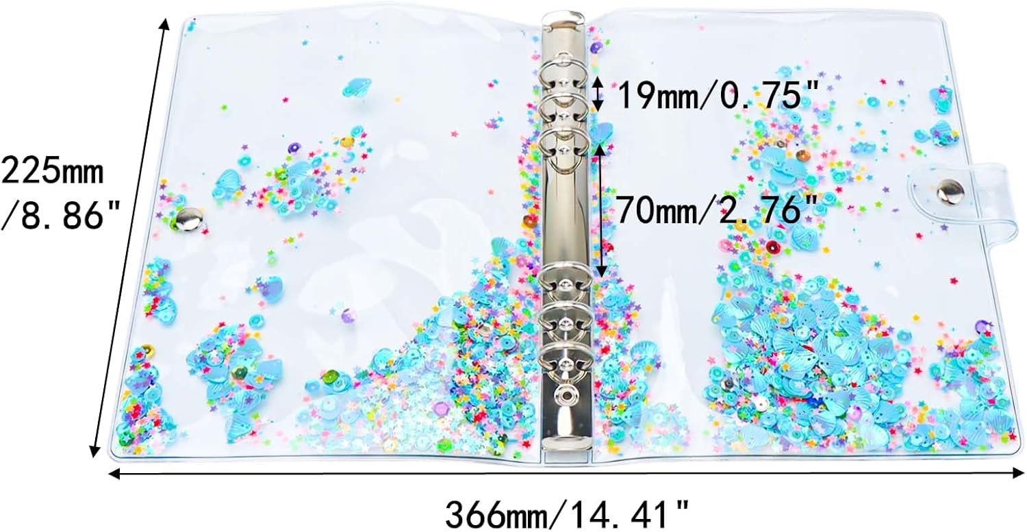 Materiale: la copertina per raccoglitori A5 è realizzata in morbido PVC, riutilizzabile e glitterata, chiusura con bottone a pressione con anelli rotondi in acciaio inossidabile resistenti Caratteristiche: la custodia per notebook A5 ha un design a doppio strato, viene fornito con un rullo e ci sono alcune scintille al centro, tra cui forme multiple, come fiori, conchiglie, cuore, stella, calcio, cerchio. Rendere la tua scrittura più interessante; Multiuso: la copertina A5 viene fornita con 6 anelli rotondi, non solo può essere inserita con 6 tasche per raccoglitori, buste per contanti, inserti per raccoglitori, divisori per raccoglitori, ma anche un bel regalo per diari di viaggio, diari, dirigenti aziendali, album da disegno e pagine da disegno, ricaricabile e facile da usare Dimensioni: questa copertina blu trasparente per raccoglitori formato A5 misura circa 366 x 225 mm Contenuto della confezione: 1 copertina per quaderno A5 blu e 1 righello per confezione. (I fogli interni non sono inclusi)