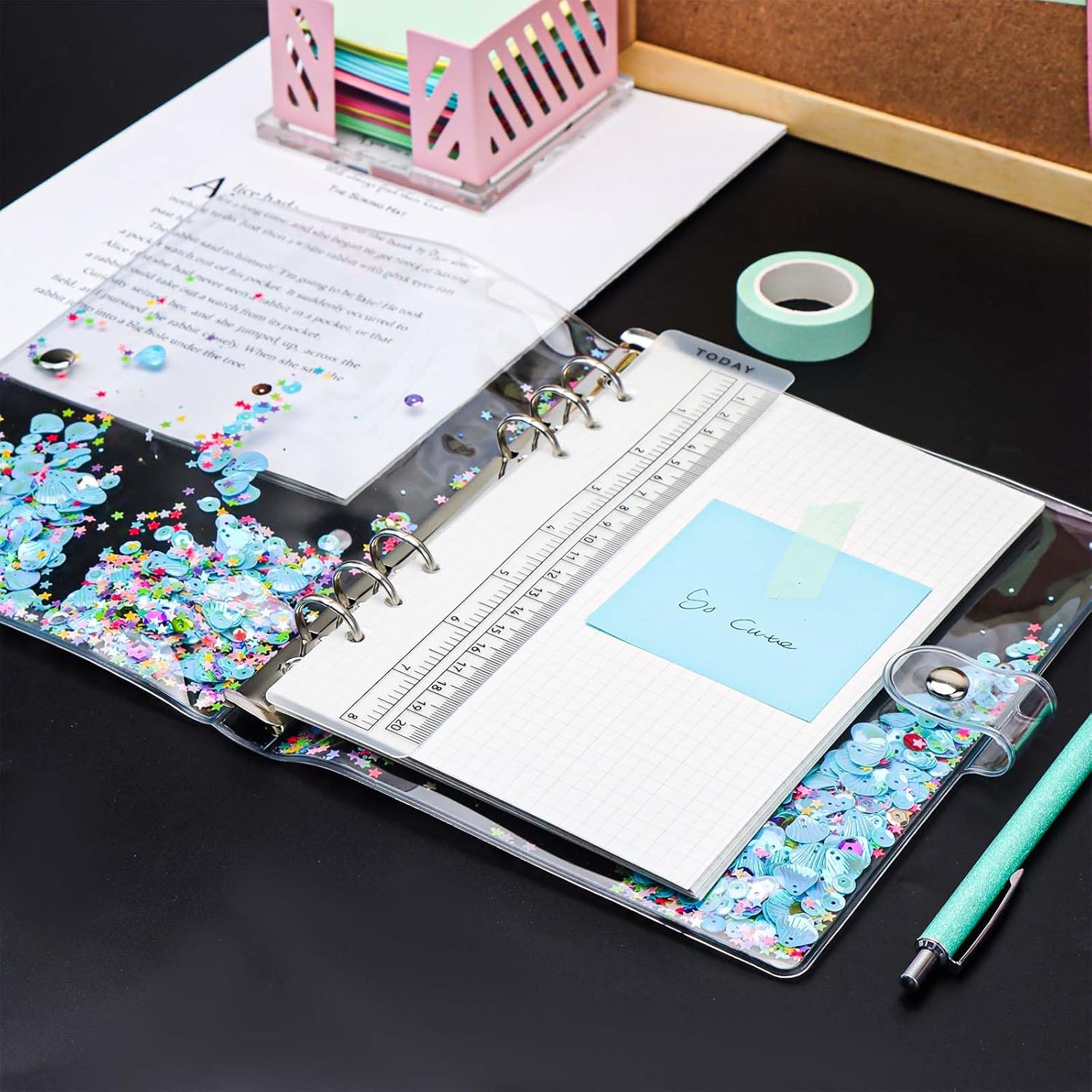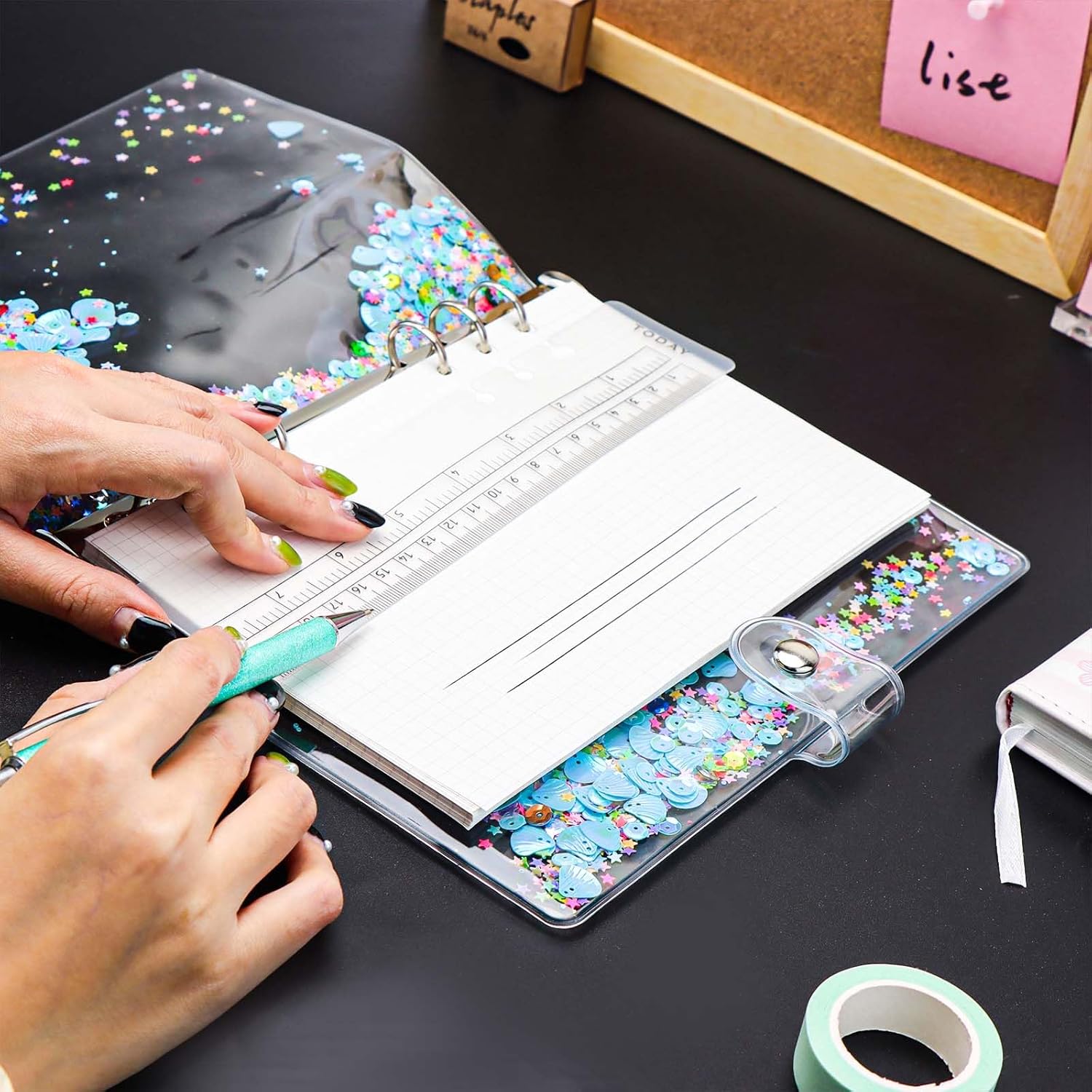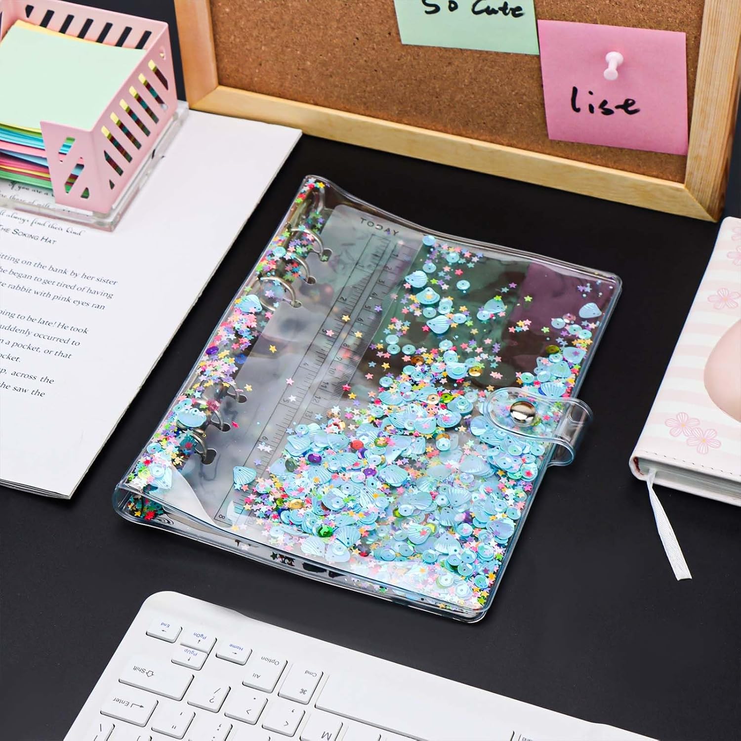 Materiale: la copertina per raccoglitori A5 è realizzata in morbido PVC, riutilizzabile e glitterata, chiusura con bottone a pressione con anelli rotondi in acciaio inossidabile resistenti Caratteristiche: la custodia per notebook A5 ha un design a doppio strato, viene fornito con un rullo e ci sono alcune scintille al centro, tra cui forme multiple, come fiori, conchiglie, cuore, stella, calcio, cerchio. Rendere la tua scrittura più interessante; Multiuso: la copertina A5 viene fornita con 6 anelli rotondi, non solo può essere inserita con 6 tasche per raccoglitori, buste per contanti, inserti per raccoglitori, divisori per raccoglitori, ma anche un bel regalo per diari di viaggio, diari, dirigenti aziendali, album da disegno e pagine da disegno, ricaricabile e facile da usare Dimensioni: questa copertina blu trasparente per raccoglitori formato A5 misura circa 366 x 225 mm Contenuto della confezione: 1 copertina per quaderno A5 blu e 1 righello per confezione. (I fogli interni non sono inclusi)