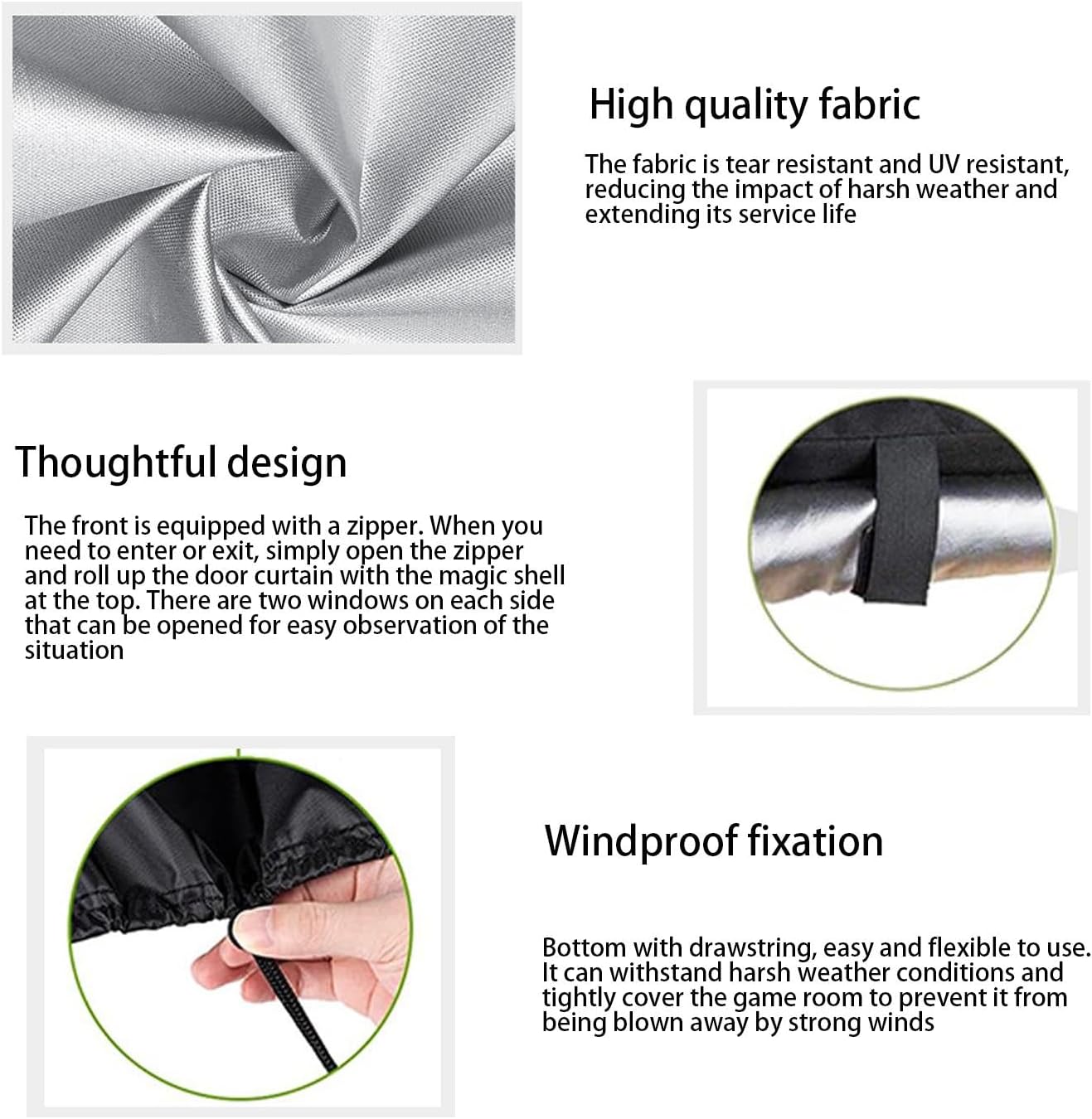 Materiale resistente: proteggi la casetta all'aperto del tuo bambino con la nostra resistente copertura in tessuto Oxford 420D. È fatto per durare e fornisce una protezione senza eguali resistente alle intemperie, impermeabile, resistente ai raggi UV e agli strappi da sole, pioggia, neve, vento e polvere Protezione completa: mantieni la casetta dei giochi del tuo bambino al sicuro in tutte le stagioni con questa copertura appositamente costruita, progettata per casette all'aperto e fornisce una copertura tutto l'anno Comodo stoccaggio: tieni la casetta dei bambini coperta e protetta dalle intemperie con questa copertura pieghevole e facile da riporre per bambini all'aperto. È anche conveniente per la pulizia quotidiana Funzionalità antivento: entra e esci facilmente dalla casetta dei bambini con 2 cerniere frontali e una copertura arrotolabile con nastro adesivo. Il design antivento offre comode regolazioni per una perfetta vestibilità su qualsiasi casetta in legno Comodo da usare: la cerniera laterale lo rende facile da indossare e togliere, impedendo a polvere, detriti e altri contaminanti di entrare nella casetta dei giochi, rendendolo facile da usare