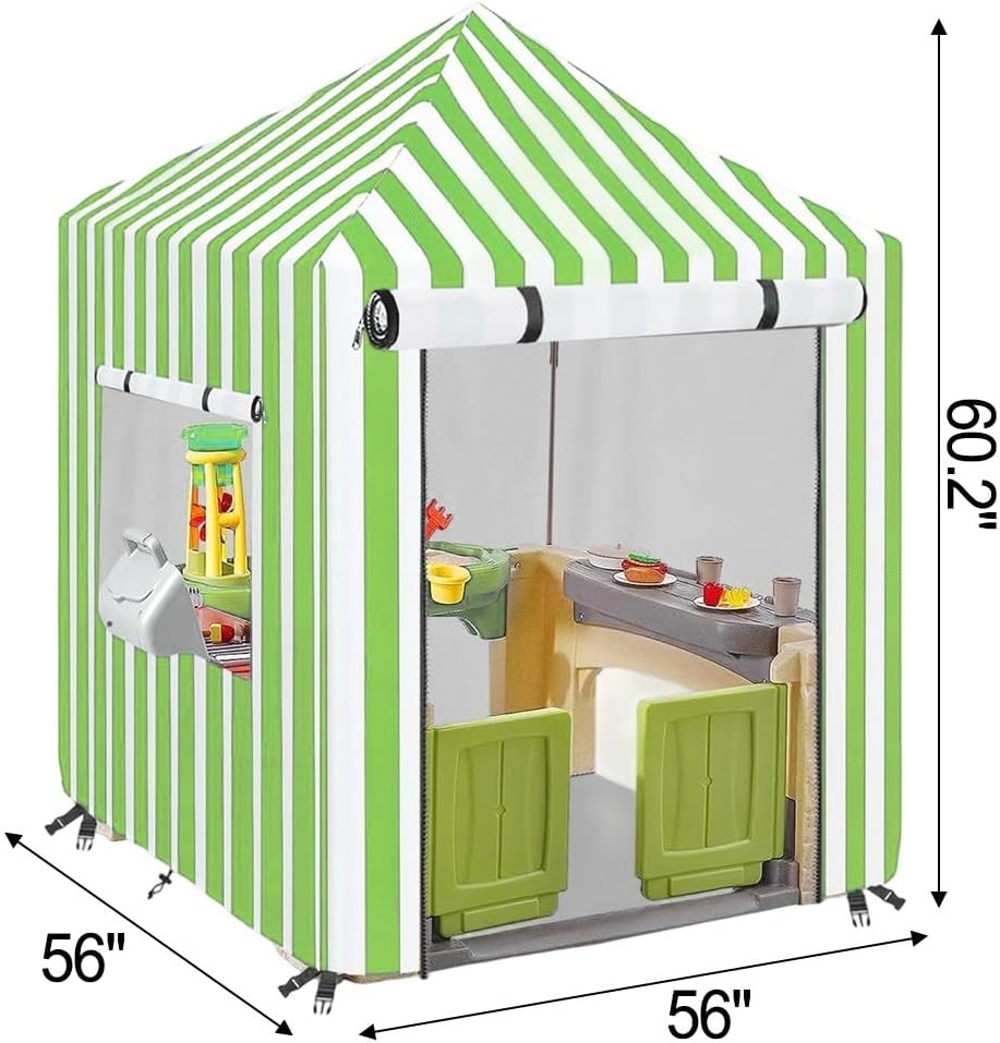 Resistenza alle intemperie: realizzata in tessuto rivestito in argento 210D di alta qualità, questa copertura per casetta offre una protezione eccezionale contro pioggia, neve e umidità, mantenendo la struttura in legno all'aperto del bambino asciutta e sicura per tutte le stagioni, mentre le cuciture rinforzate aggiungono una maggiore durata per un uso a lungo termine. Protezione solare: la nostra copertura resistente ai raggi UV protegge la tua casetta da gioco in legno dai dannosi raggi solari che causano sbiadimento, crepe e deterioramento, prolungando significativamente la durata della struttura della struttura del gioco, mantenendo il suo aspetto vivace e l'integrità strutturale per anni di gioco continuo. Design sicuro: dotato di cinghie regolabili e fibbie robuste, questa copertura da 152,9 x 142,2 x 142,2 cm rimane saldamente in posizione anche durante forti venti e tempeste, offrendo una completa tranquillità mentre evita movimenti inaspettati o danni allo spazio di gioco all'aperto dei tuoi bambini. Compatibilità versatile: progettata per adattarsi a varie forme e dimensioni di casette in legno, questa copertura multiuso è disponibile in quattro colori attraenti (blu, giallo, rosa, verde) per completare l'estetica del tuo giardino fornendo una protezione costante per il posto speciale del tuo bambino. Facile installazione e conservazione: la custodia leggera ma robusta presenta un design facile da usare che consente un'installazione e una rimozione rapida e senza attrezzi in pochi minuti, inoltre si piega in modo compatto quando non in uso, rendendo la conservazione stagionale semplice e conveniente per i genitori impegnati.