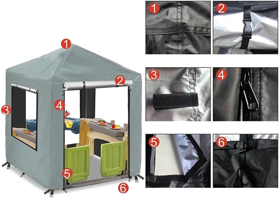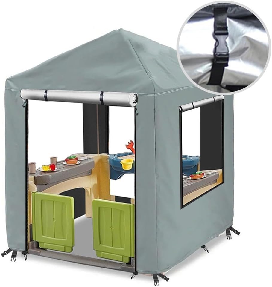 Vestibilità precisa: questa copertura per casetta misura 142,2 cm di larghezza x 142,2 cm di profondità x 152,9 cm di altezza, specificamente progettata per casette Step2 e modelli di dimensioni simili di altre marche. Prima dell'acquisto, misurare attentamente la casetta per confermare la compatibilità per una protezione ottimale. Protezione resistente alle intemperie di alta qualità: realizzata in tessuto Oxford 420D di alta qualità con rivestimento impermeabile in PU, questa copertura offre una maggiore resistenza agli strappi, protezione UV e capacità di impermeabilizzazione. La casetta per bambini rimarrà protetta da pioggia, neve, danni del sole e condizioni meteorologiche avverse. [Comodo design di accesso]: dispone di due robuste cerniere frontali che consentono di arrotolare e fissare la copertura nella parte superiore, oltre a finestre sugli altri tre lati che possono essere aperte. I bambini possono continuare a giocare mentre la copertura rimane al suo posto, mantenendo la protezione senza limitare il divertimento. Sicurezza resistente al vento: dotato di 4 fibbie rinforzate e 2 corde elastiche sul fondo che creano una perfetta aderenza intorno alla tua casetta dei giochi. Questo design premuroso aiuta a evitare che la copertura venga spostata durante forti venti o tempeste. [Protezione esterna per tutte le stagioni]: il materiale grigio Oxford 420D fornisce un riparo di lunga durata per la tua casetta per tutte le stagioni. Questa copertura aiuta a prolungare la durata dello spazio di gioco all'aperto dei tuoi bambini proteggendolo da sporco, detriti e vari elementi atmosferici.
