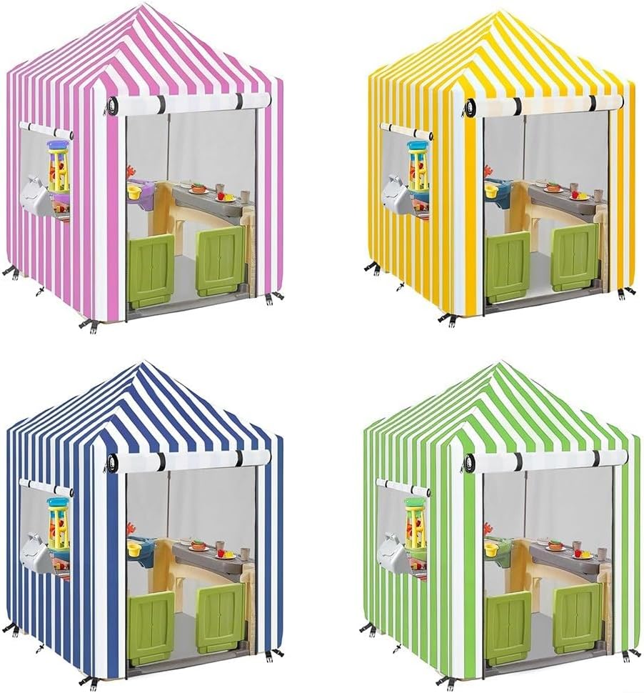 Protezione dalla pioggia e dal sole: realizzata con materiali impermeabili, questa copertura per casetta protegge efficacemente l'area giochi dei bambini dalla pioggia mentre i danni del sole per mantenere i suoi colori vivaci. Lunga durata: la copertura aiuta a prolungare la durata della tua casetta in legno proteggendola da elementi ambientali come umidità e raggi UV. [Installazione senza attrezzi] Progettato pensando alla comodità, questa copertura può essere installata o rimossa senza sforzo senza bisogno di attrezzi, risparmiando tempo e fatica. Sistema di cinghie regolabili: dotato di cinghie e fibbie regolabili, questa copertura garantisce una vestibilità sicura che resiste alle condizioni ventose, mantenendo l'area giochi del bambino protetta. Si adatta a più dimensioni della casetta dei giochi: compatibile con vari stili di case da gioco in legno, questa copertura protettiva è sia pratica che visivamente accattivante per il tuo giardino.