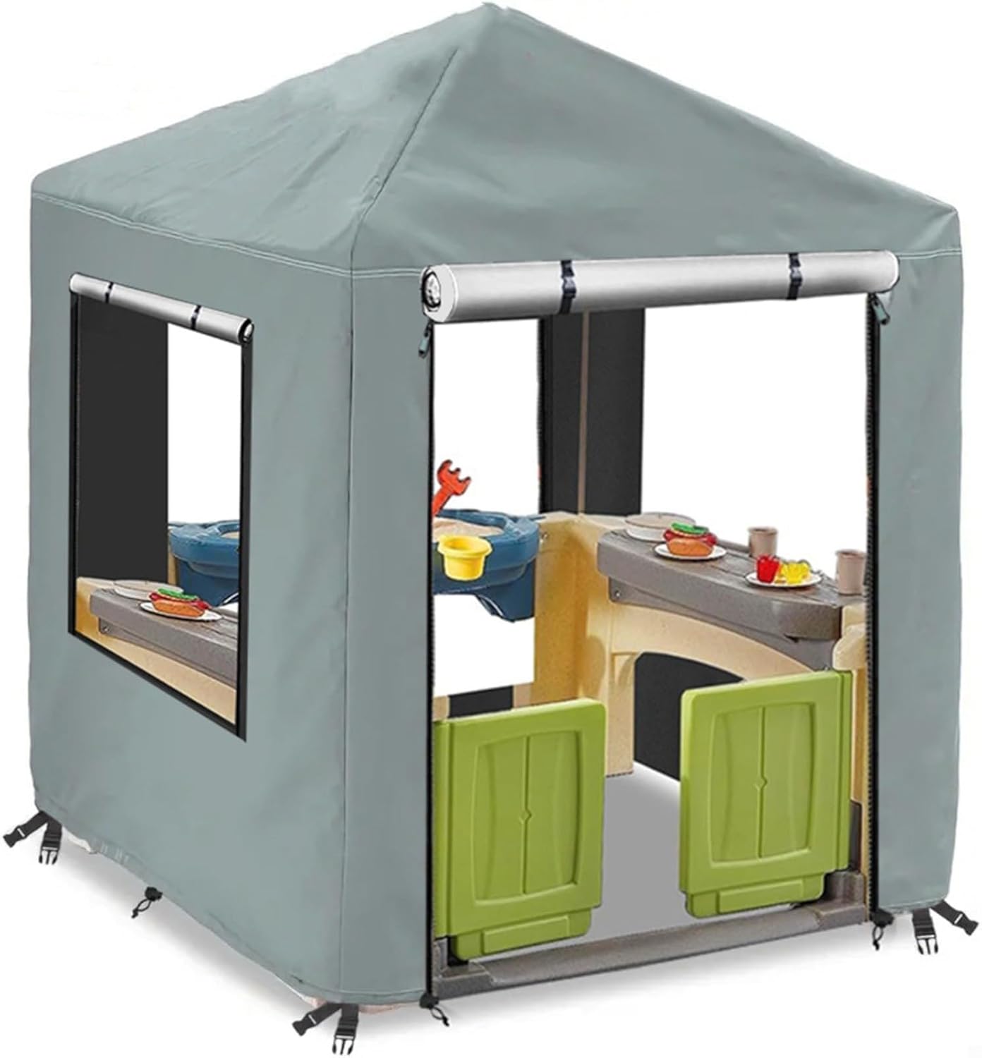 Protezione dalle intemperie: la nostra copertura per casetta da esterno misura 142,2 cm di larghezza x 142,2 cm di profondità x 152,9 cm di altezza, realizzata in tessuto Oxford 420D di alta qualità con rivestimento impermeabile in poliuretano che protegge la casetta dei bambini da pioggia, neve, raggi UV e detriti, mantenendola pulita e prolungando la sua durata per anni di divertimento. Comodo design di accesso: dispone di 2 robuste cerniere frontali che consentono di arrotolare e fissare il pannello frontale con lacci attaccati, oltre a finestre di visualizzazione sugli altri tre lati in modo che i bambini possano giocare senza rimuovere completamente la copertura, bilanciando la protezione con l'accessibilità. Sicurezza antivento: dotata di 4 robuste fibbie e 2 cordoncini elastici nella parte inferiore che creano una perfetta aderenza intorno alla casetta dei giochi, impediscono che la copertura venga spostata durante venti forti o tempeste, dandoti tranquillità durante tutte le stagioni. Compatibilità: specificamente progettata per casette Step2 e case da gioco di altre marche con dimensioni simili (142,2 x 142,2 x 152,9 cm), questa copertura fornisce una protezione completa mantenendo un aspetto pulito nel tuo giardino. Si prega di misurare attentamente la casetta prima dell'acquisto. Facile manutenzione: la copertura di colore grigio resiste allo sbiadimento, agli strappi e agli elementi esterni, pur essendo semplice da pulire con un tubo da giardino e sapone delicato quando necessario. Conservare piatto o piegato quando non in uso per la massima longevità e protezione continua.