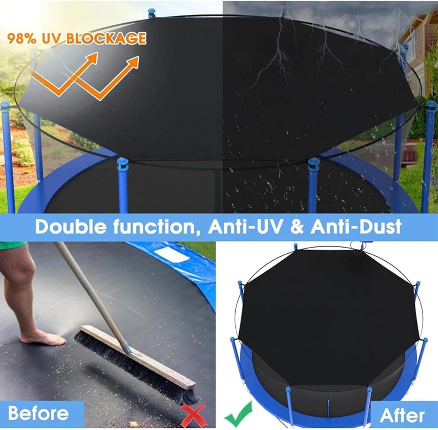 ❤ Tessuto Oxford di buona qualità: parasole per trampolino anti-UV realizzato con tessuto Oxford esterno impermeabile resistente agli strappi e fodera rivestita resistente ai raggi UV, questo parasole per trampolino garantisce protezione e divertimento di lunga durata. ❤ Protezione solare: il nostro parasole per trampolino offre una protezione UV ottimale con un rivestimento resistente ai raggi UV, fornendo una doppia protezione solare in modo da poter rimbalzare senza preoccuparsi dei dannosi raggi UV. ❤ Protezione dalle intemperie: garantendo che il tuo trampolino rimanga immacolato, questa tenda non solo protegge dalla pioggia, mantenendo il tappeto asciutto, ma funge anche da barriera contro le foglie, mantenendo la pulizia tutto l'anno. ❤Diverse dimensioni per diversi trampolini: la copertura ombreggiante del trampolino da esterno ha 6 dimensioni tra cui scegliere, 6 piedi è adatto per trampolino da 6 piedi con 6 pali, 8/10 piedi è adatto per trampolino da 8/10 piedi con 6 pali, 12/14 piedi è adatto. per trampolino da 12/14 piedi con 8 pali, 16 piedi è adatto per trampolino da 16 piedi con 12 pali. Si prega di misurare il trampolino e controllare il numero di pali sul trampolino prima dell'acquisto. ❤ Installazione semplice: goditi un tempo di gioco ininterrotto con l'installazione senza problemi del nostro parasole per trampolino. Il suo design elegante e pieghevole lo rende facile da installare e rimuovere, occupando uno spazio minimo.